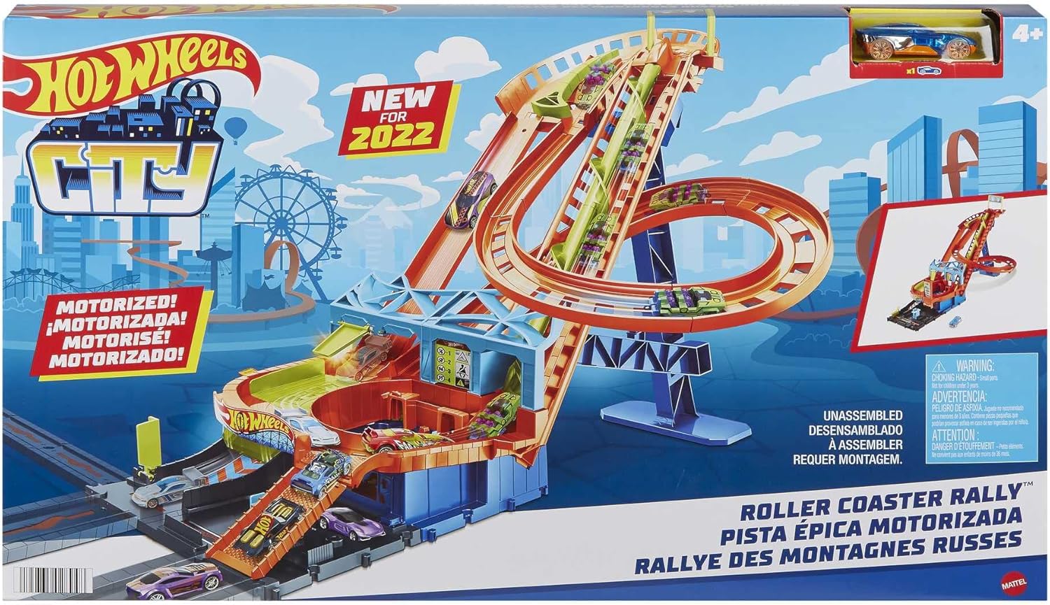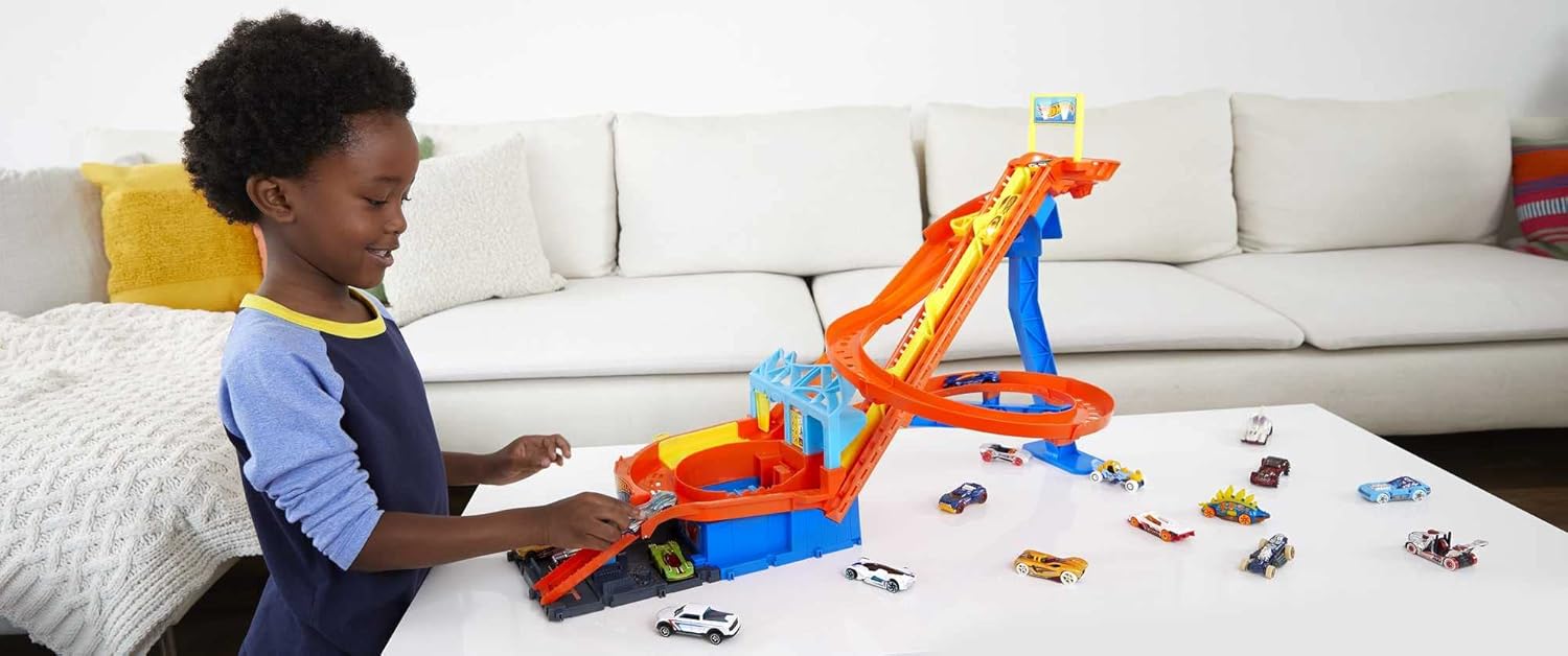 L'azione motorizzata del set da gioco Roller Coaster Rally di Hot Wheels City rende le avventure senza fine e portano l'esperienza di Hot Wheels all'estremo. Viene fornito con 1 veicolo Hot Wheels e ha spazio per giocare fino a 7 veicoli giocattolo alla volta (i veicoli aggiuntivi sono venduti separatamente) grazie alle dimensioni e al movimento continuo del set da gioco. I bambini possono controllare il deragliatore che determina il percorso che i veicoli prenderanno sulle piste, in modo che la sfida aumenta con ogni veicolo aggiuntivo aggiunto al set. Si collega con altri set Hot Wheels City per ispirare storie creative e avventure sorprendenti. È un ottimo regalo per bambini dai 4 agli 8 anni e, grazie al quale include un veicolo Hot Wheels, il divertimento inizia immediatamente.