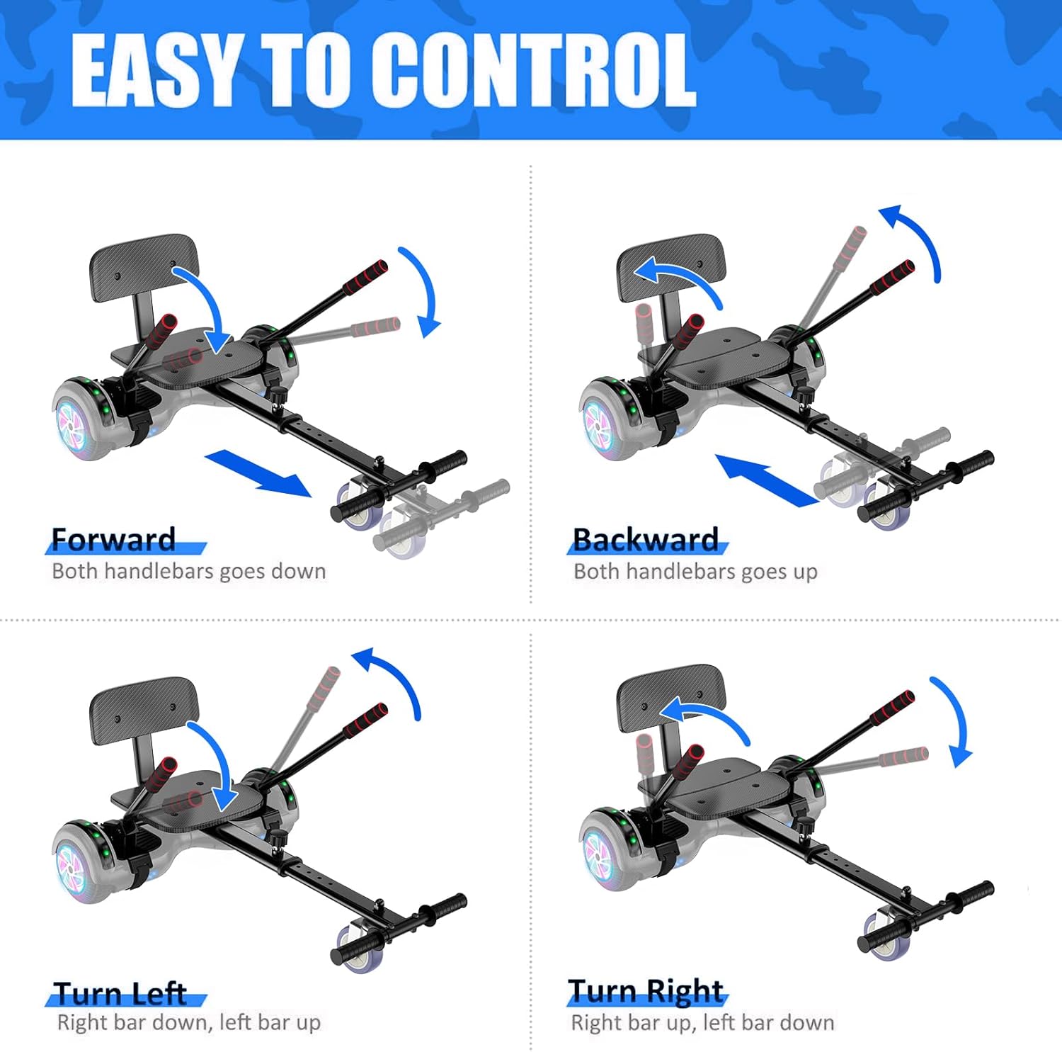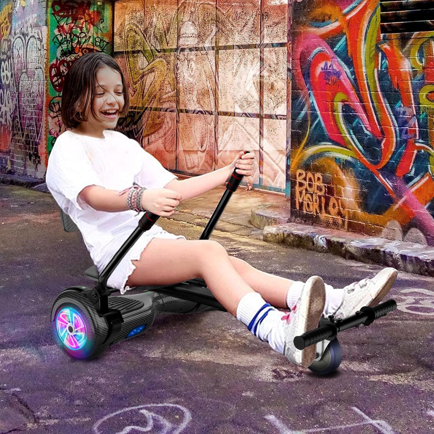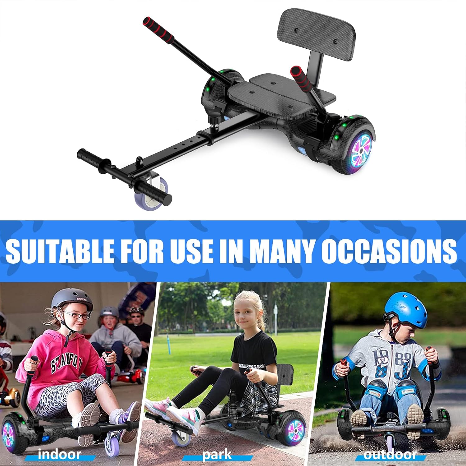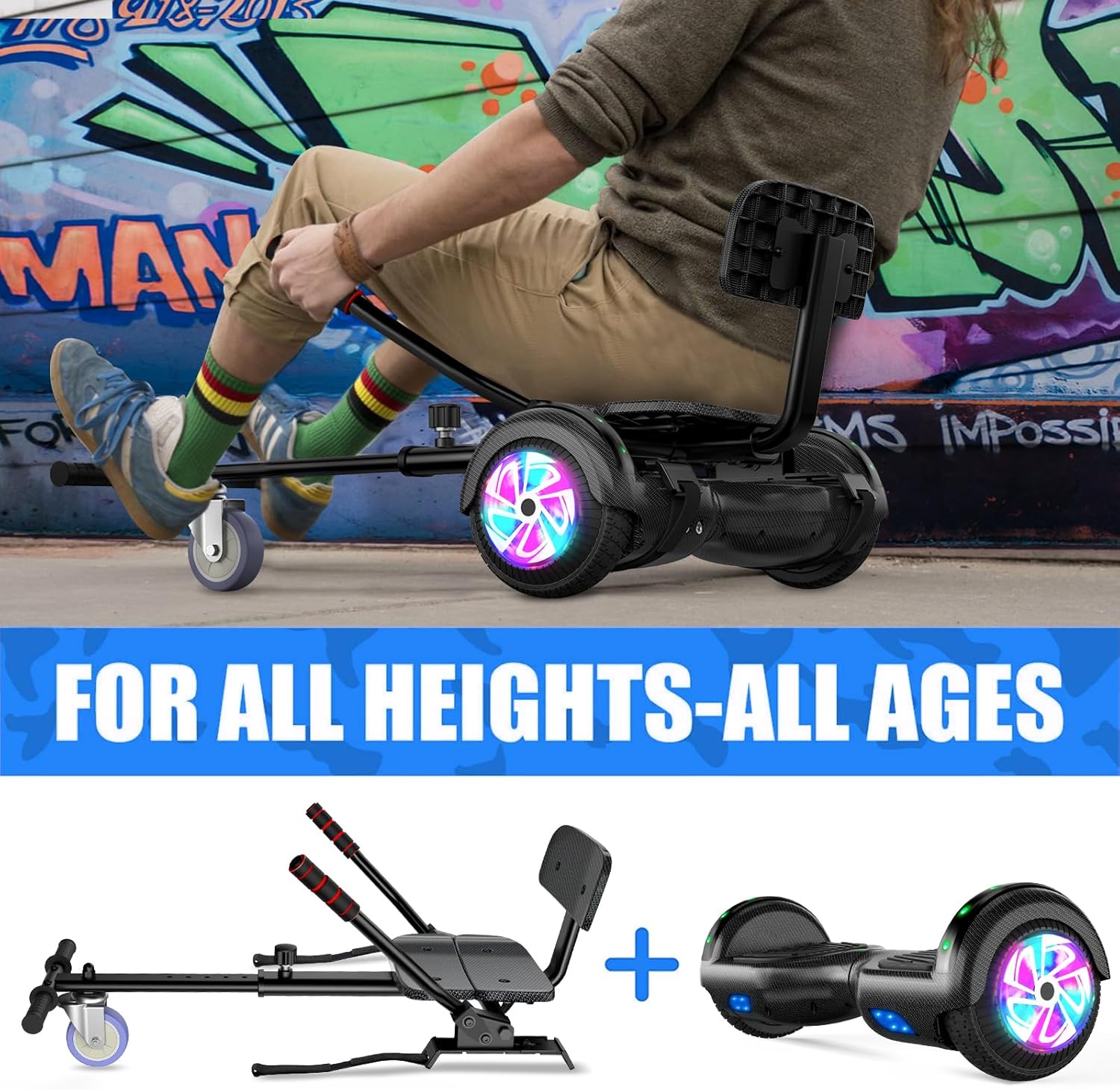 Hoverboard avec siège, Hoverboard à deux roues de 6,5 pouces avec haut-parleur Bluetooth et lumières colorées, scooter auto-équilibrant pour enfants (Go-Kart inclus)