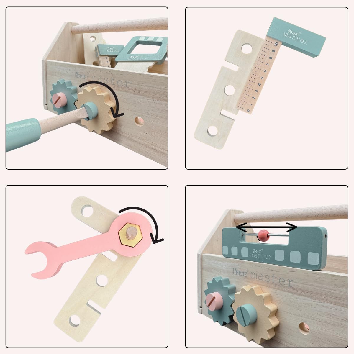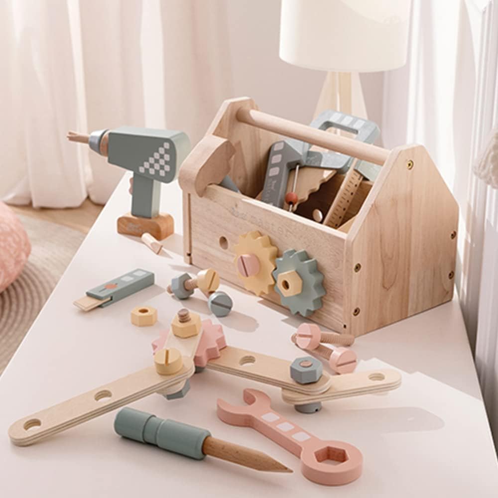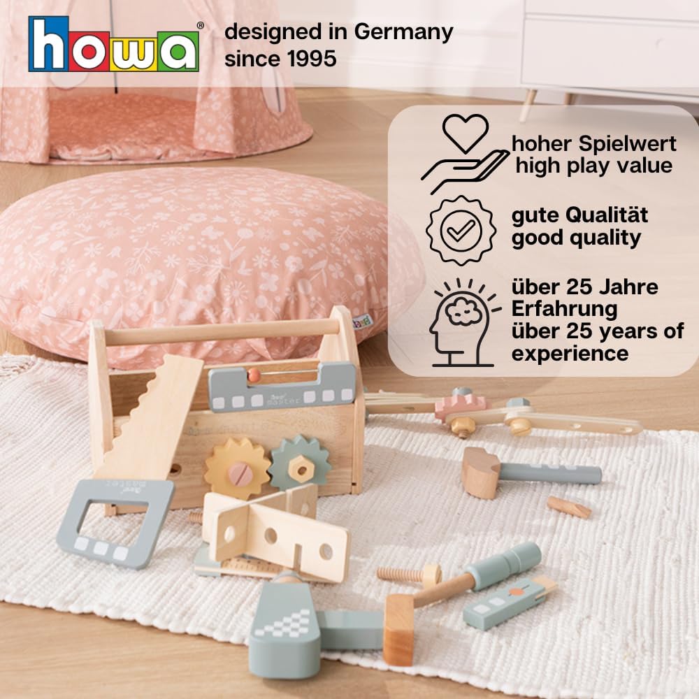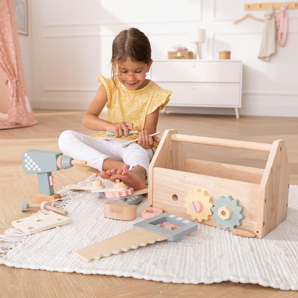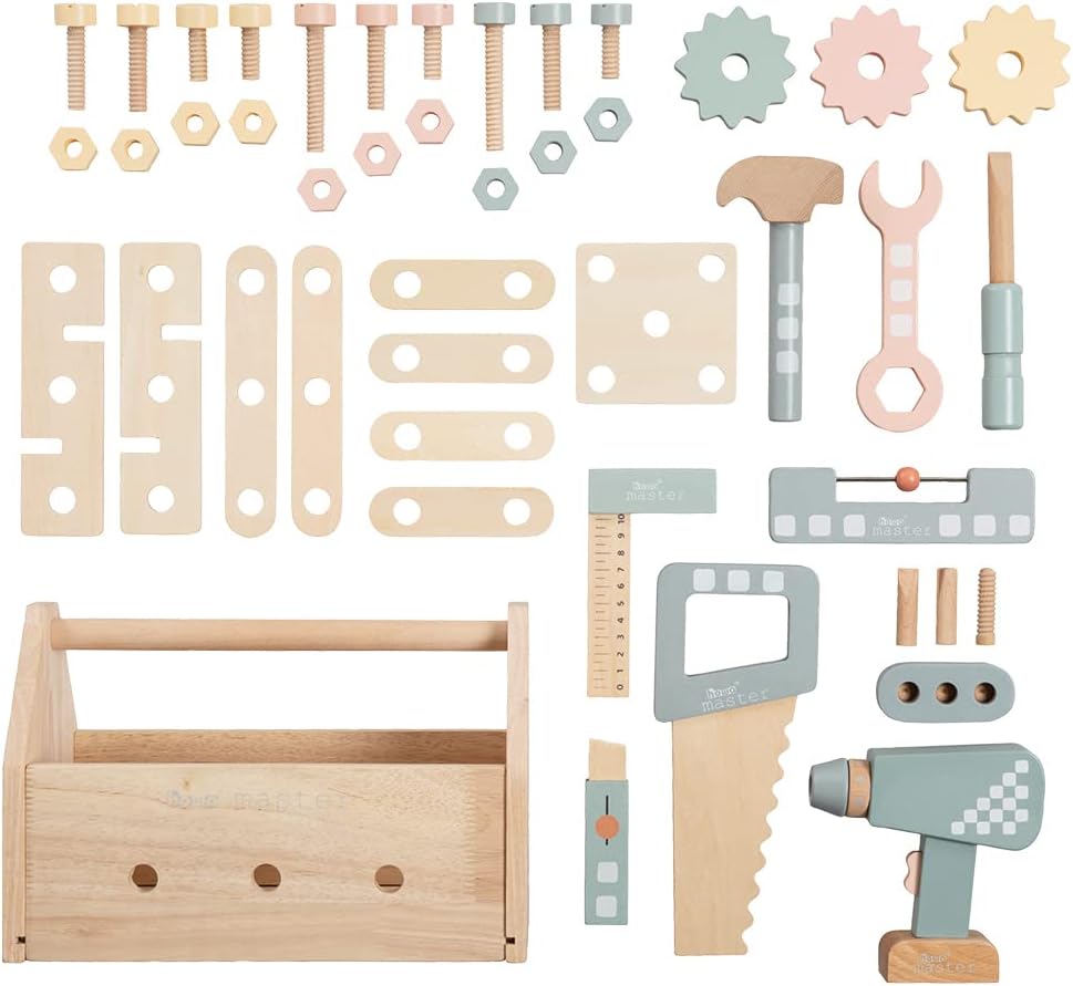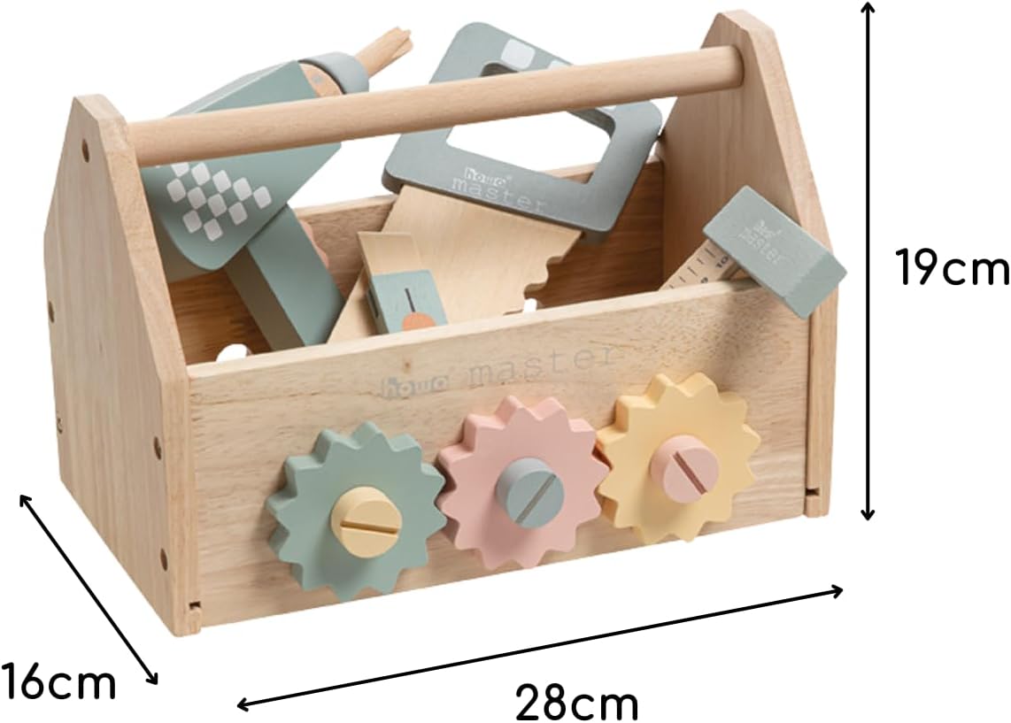 Cassetta degli attrezzi in legno duro per giovani artigiani con 45 pezzi. Contenuto Include 8 diversi strumenti come trapano, martello, cacciavite, chiave, sega, livella, angolo e taglierino per legno Cassetta degli attrezzi per bambini con 32 accessori con viti, dadi, ingranaggi, parti in legno con fori Include 5 pezzi trapano per bambini con 3 punte magnetiche, supporto per punte e mandrino girevole Dimensioni cassetta degli attrezzi per bambini: larghezza 16 cm, lunghezza 28 cm, altezza 18,5 cm