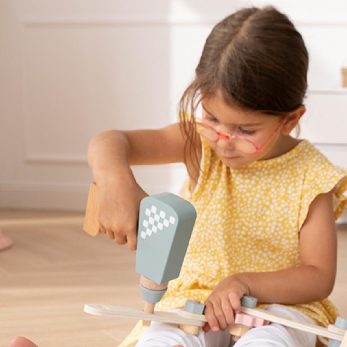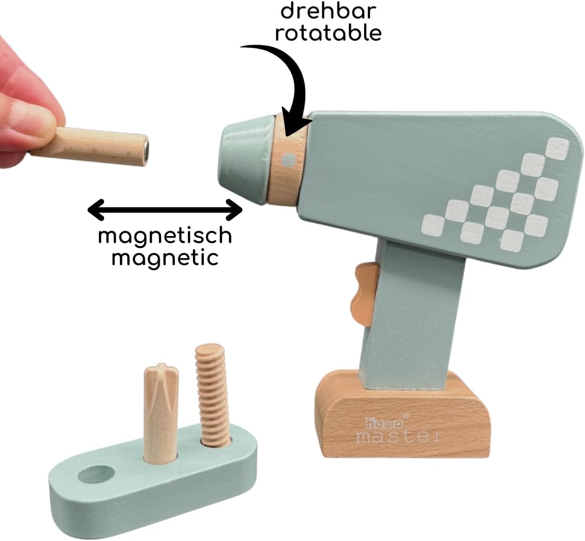 Trapano per bambini in legno Include 3 punte magnetiche intercambiabili e portapunte Il mandrino del trapano per bambini è girevole. Dimensioni trapano per bambini: larghezza: 3,5 cm, lunghezza: 17 cm, altezza: 13 cm