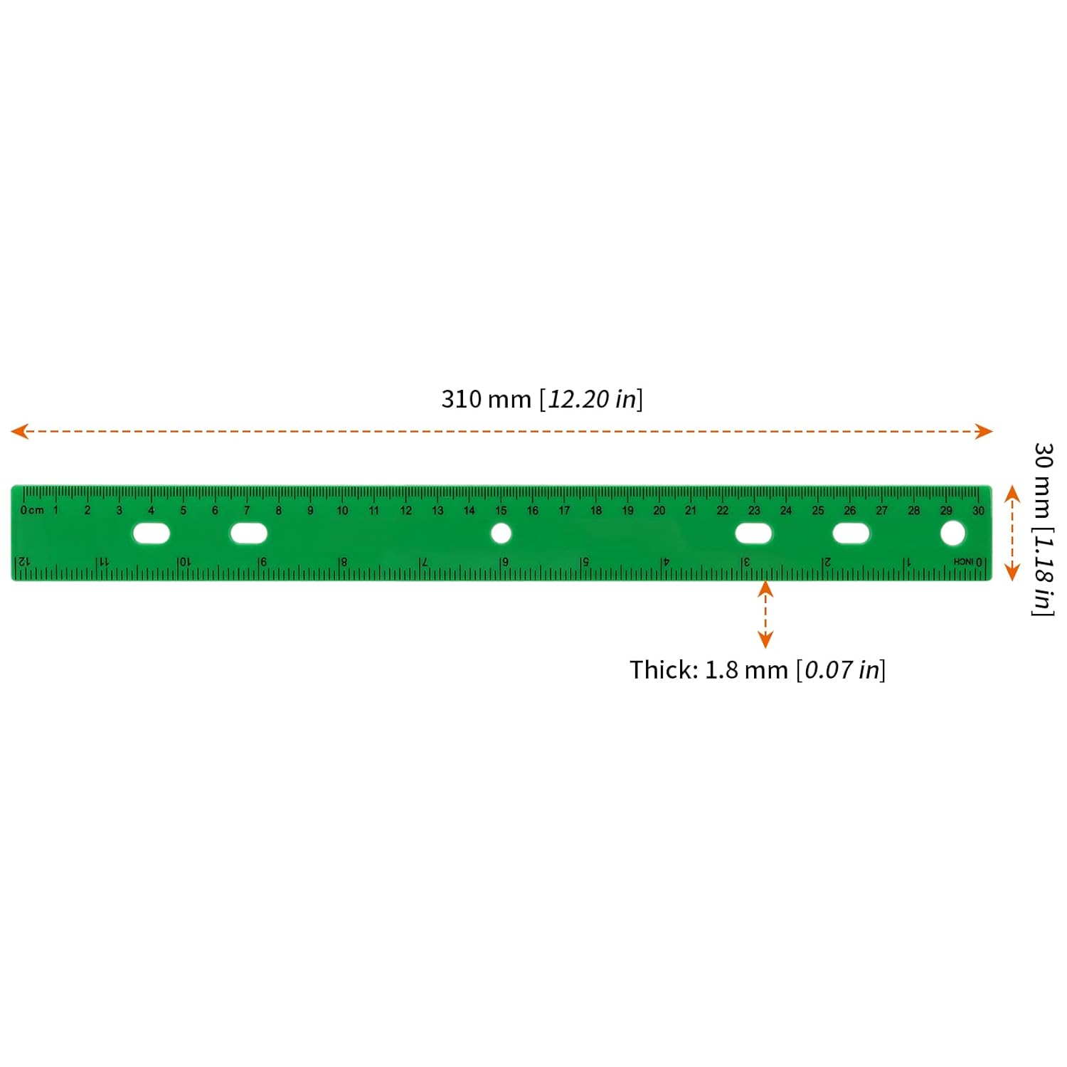 Leggero e durevole: il righello per classe è realizzato in plastica di alta qualità, leggero, ma resistente e infrangibile, il righello in plastica da 30,5 cm può essere facilmente piegato senza rompersi e può essere utilizzato per un lungo periodo di tempo. Doppia scala trasparente: la superficie del righello in plastica colorata è stampata con due misure standardizzate trasparenti: 0-30 cm e 0-12 pollici. Il righello di misurazione fronte/retro può soddisfare le diverse esigenze di misurazione. Design con fori: 4 righelli di misurazione in plastica di colori assortiti sono molto convenienti, tra cui 30 righelli dritti in plastica in ciascuno dei quattro colori: verde, rosso, blu e giallo, e ogni righello è pre-forato con 6 fori. Righello multiuso: il righello flessibile con fori può essere utilizzato per molti scopi: insegnamento in classe, forniture per ufficio, misurazione ingegneri, progetti di design artistico, scopi generali per la famiglia, omaggi per feste, ecc. Servizio soddisfatto: la nostra integrità è suprema e attribuiamo grande importanza alla qualità del prodotto e alla soddisfazione del cliente. Offriamo una garanzia di rimborso di 30 giorni. Se avete qualunque domanda con il nostro righello di plastica colorata, non esitate a contattarci per i dettagli.
