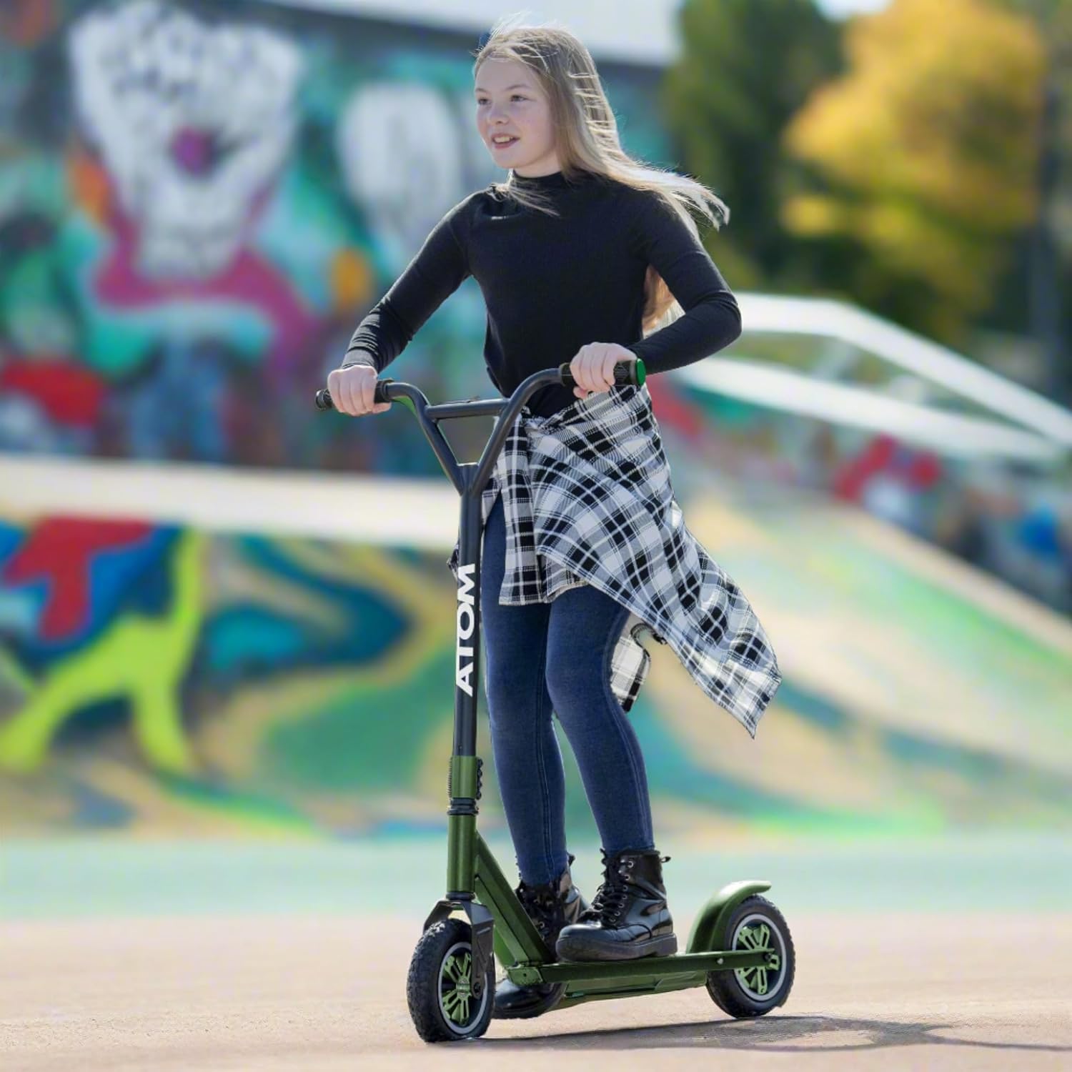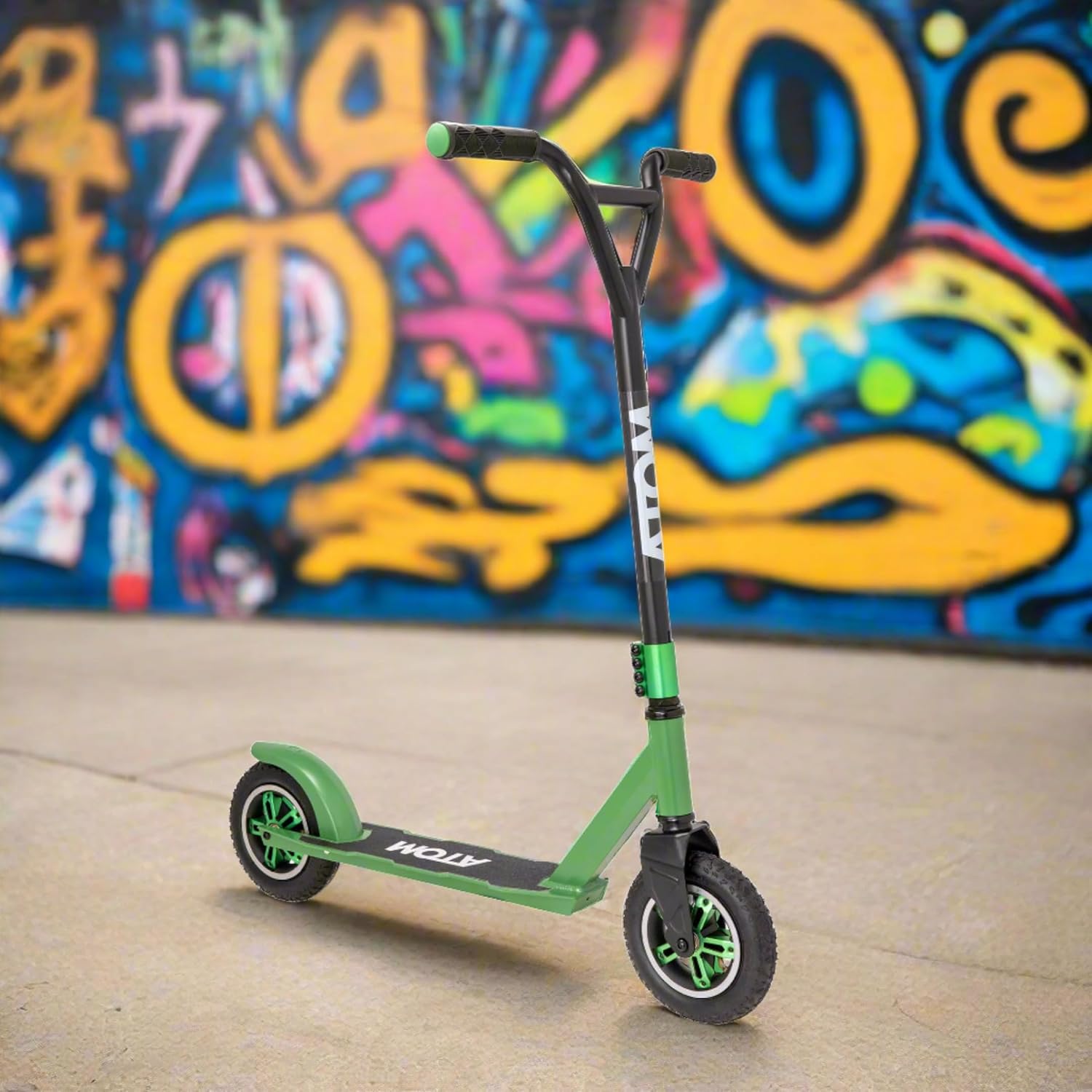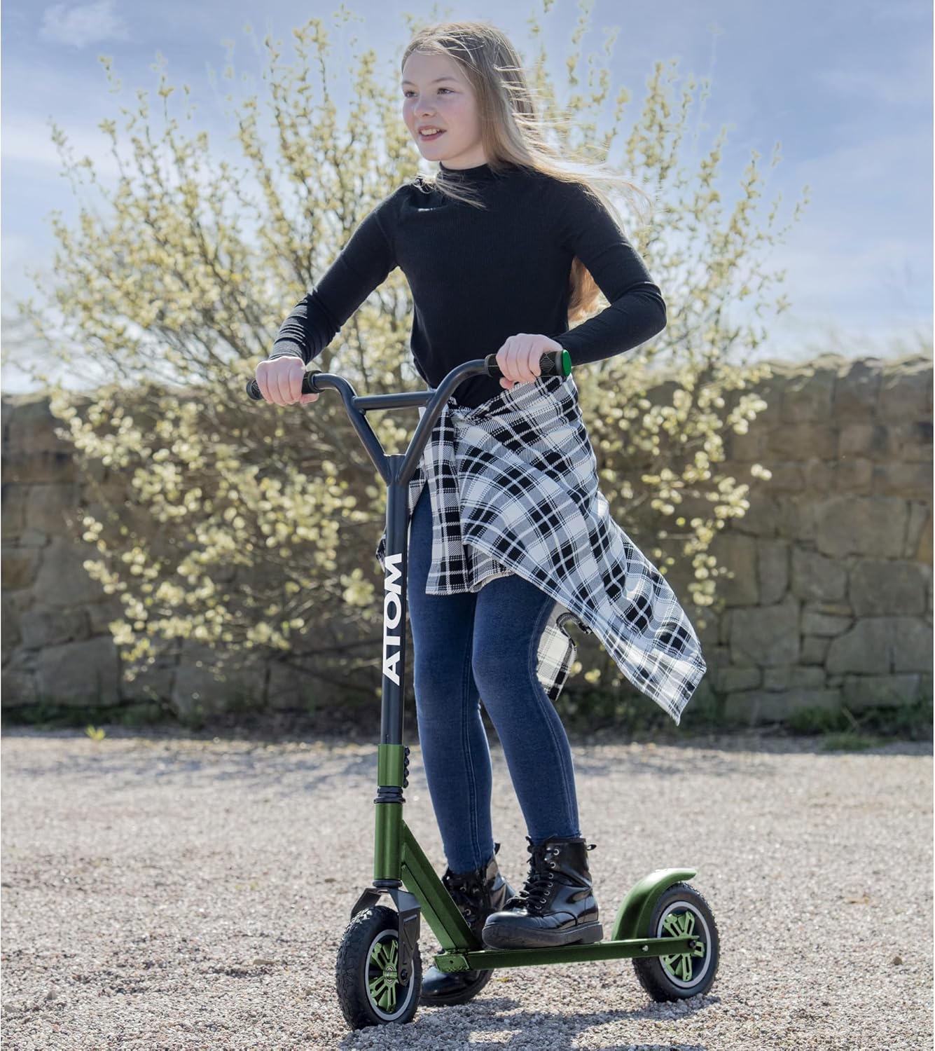 Atom Dirt Rider - Ciao avventuriero! Cerchi di dare un po' di adrenalina alle tue escursioni all'aperto? Dai il benvenuto al ATOM Dirt Rider Scooter – il compagno ideale per brividi fuoristrada. Guidalo su terreni accidentati o semplicemente percorri le strade. Nessuna sfida è troppo grande per il tuo bambino. Mentre il tuo piccolo esplora i percorsi off-road, potrai osservarlo mentre pratica acrobazie e trucchi su questo scooter. Dalla corsa nel parco skate fino alla partecipazione a competizioni, questo scooter è perfetto per i tuoi bambini. Perfetto per le Avventure Fuoristrada - Questo scooter ATOM Dirt Rider è ideale per ogni bambino pronto a iniziare la propria avventura con trucchi e rampe fuoristrada. Con un'altezza del manubrio di 90 cm e un robusto telaio in lega, non c'è nulla che il tuo bambino non possa realizzare. Dalla pratica di trucchi e acrobazie fino a dominare le discese, questo scooter è pronto per tutto. Grazie alle ruote d'aria da 200 mm, il tuo bambino avrà un'ottima aderenza mentre sfreccia lungo il percorso sterrato o esplora i boschi più profondi e oscuri. Regalo Ideale o Presento - Questo scooter è il regalo perfetto per ogni bambino appassionato di scooter. Non solo presenta un design elegante e alla moda, ma offre anche ore infinite di divertimento. Che sia per compleanni, Natale o semplicemente per una sorpresa speciale, osserva come gli occhi del tuo bambino si illuminano. Permetti al tuo bambino di sviluppare le proprie capacità motorie con questo scooter, migliorando coordinazione, resistenza e forza. Questo scooter è ideale per far uscire il tuo bambino dai tablet e incoraggiarlo a stare all'aperto. Specifiche del Prodotto - Include: 1x Scooter ATOM Green Dirt Rider. Altezza del Manubrio: 90 cm. Peso Massimo: 100 kg. Cuscinetti ABEC-5. Fissaggio a Quattro Bulloni. Dimensioni - H99 cm x L52 cm x P86 cm. Adatto per bambini di età superiore ai 6 anni. Atom Scooters - Accendi l'Avventura! Progettati per ragazzi e ragazze temerari, i nostri scooter sono il massimo per bambini e adolescenti. Con un design elegante e una costruzione resistente, offriamo una vasta gamma di scooter, dai primi scooter perfetti, agli scooter luminosi, ai dirt riders e skateboard! La nostra missione è semplice ma profonda: dare potere alle giovani menti con la gioia del movimento e lo spirito di esplorazione. Atom Scooters - dove ogni corsa è un'avventura che aspetta di accadere.
