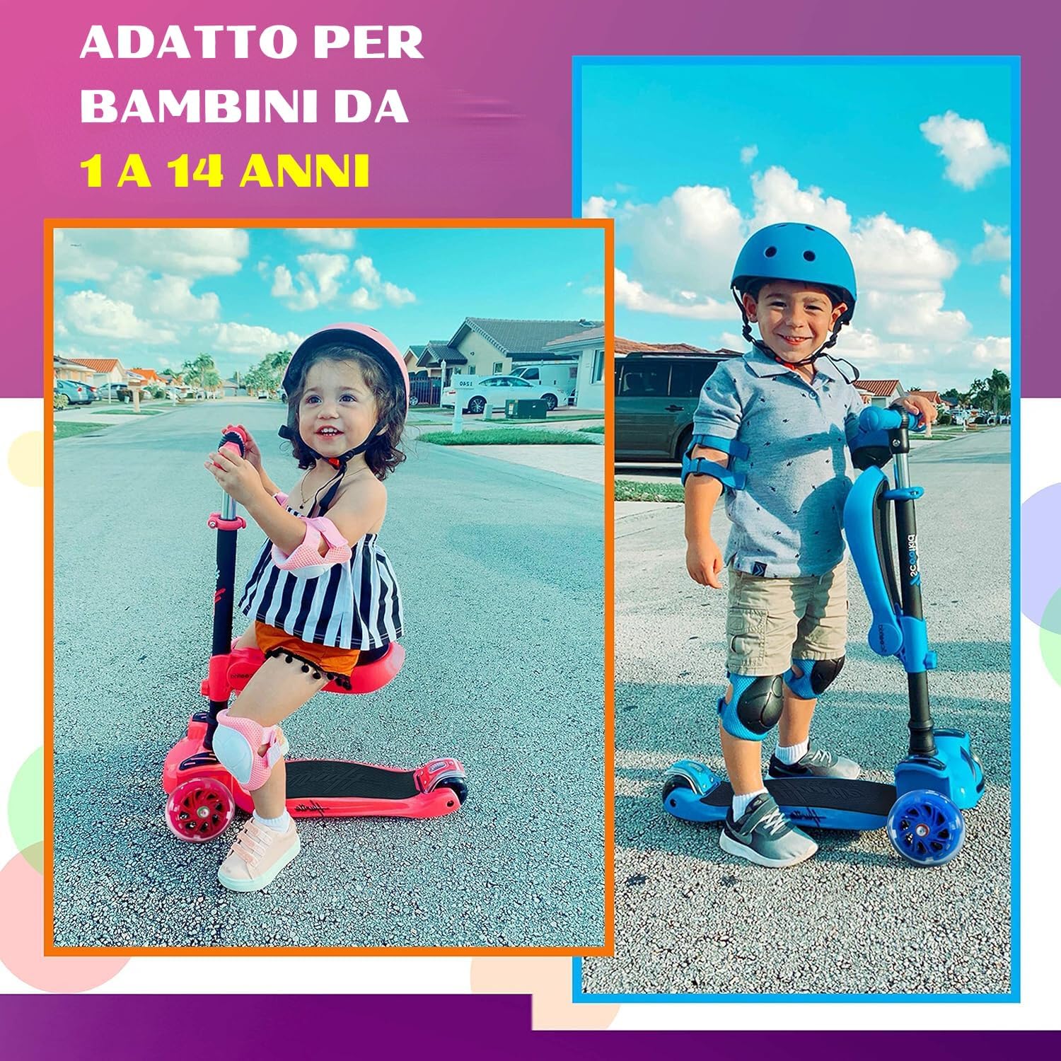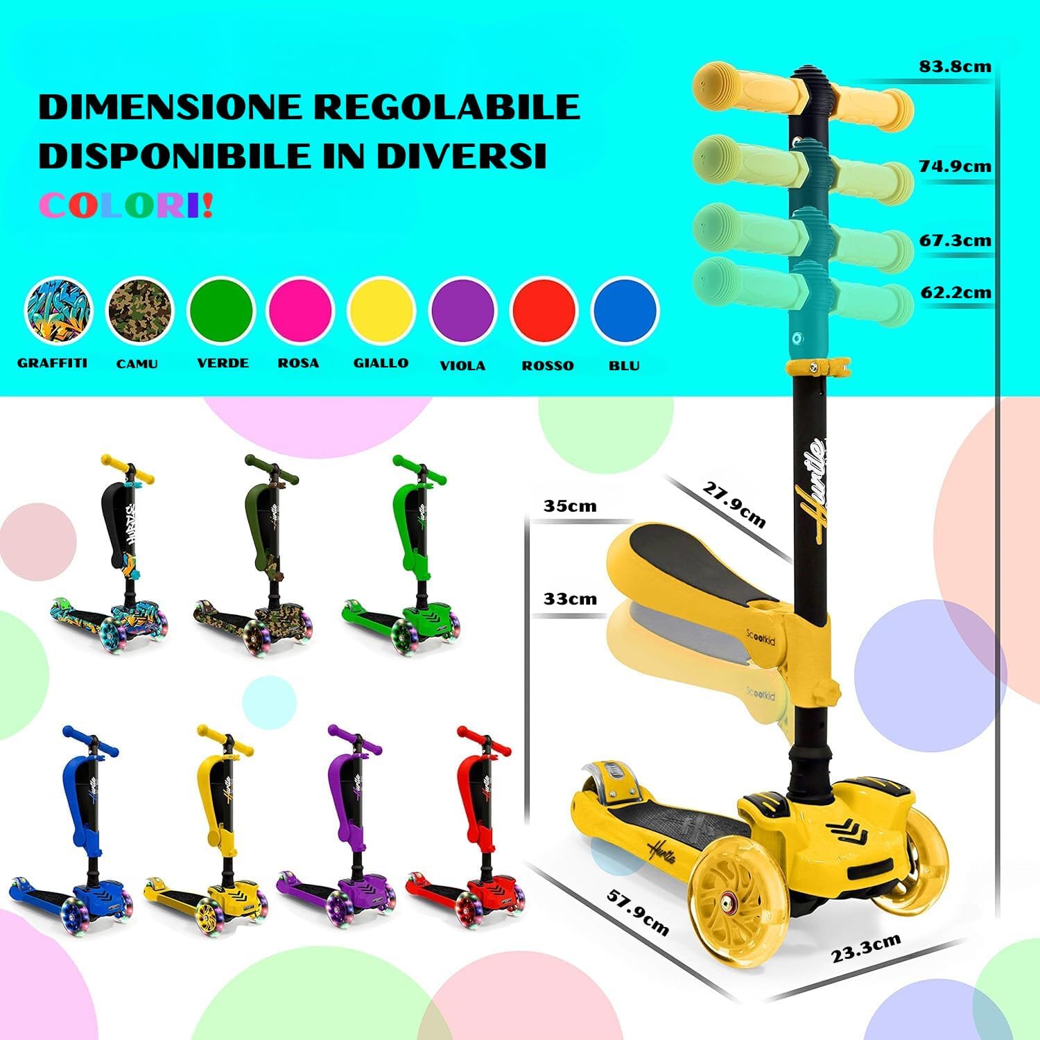 ⚡️LUCI PER RUOTE MULTI-COLORE: Gli scooter da calcio a 3 ruote Hurtle ScootKid per monopattino bambini presentano luci colorate a LED che si illuminano in una varietà di colori lampeggianti mentre scali, aggiungendo una svolta divertente alla corsa! Inoltre, fa risaltare lo monopattino con luci. ⚡️DESIGN SEDILE O STAND CON POGGIAPIEDI RIBALTABILE: Questo monopattino bambini è dotato di un esclusivo sedile ribaltabile rimovibile da 20.41 kg che i bambini possono utilizzare durante la crociera insieme al poggiapiedi integrato. Può essere distaccato quando si sentono più sicuri in piedi. ⚡️MANUBRIO REGOLABILE: Lo monopattino leggero e compatto presenta un manubrio regolabile con 4 opzioni di altezza – 64,8cm/69,9cm/78,7cm/86,4cm, funziona con bambini di tutte le età. Ideale per i bambini di età pari o superiore a 1 anno con una capacità di peso di 59,87 kg. ⚡️GUIDA FLUIDA: Il mini scooter a 3 ruote trike per monopattino bambini è dotato di un pianale antiscivolo e largo abbastanza grande da adattarsi a entrambi i piedi. Ha anche ruote a rulli scorrevoli da 12 cm / 8 cm che scorrono senza problemi anche su superfici irregolari o irregolari. ⚡️TECNOLOGIA LEAN-TO-STEER: Presenta una facile manovrabilità con la tecnologia Lean-to-Steer, il che significa che il mini scooter è controllato inclinandosi invece di girare il volante, questo design aiuta il bambino a sviluppare capacità di equilibrio, coordinazione e altro.