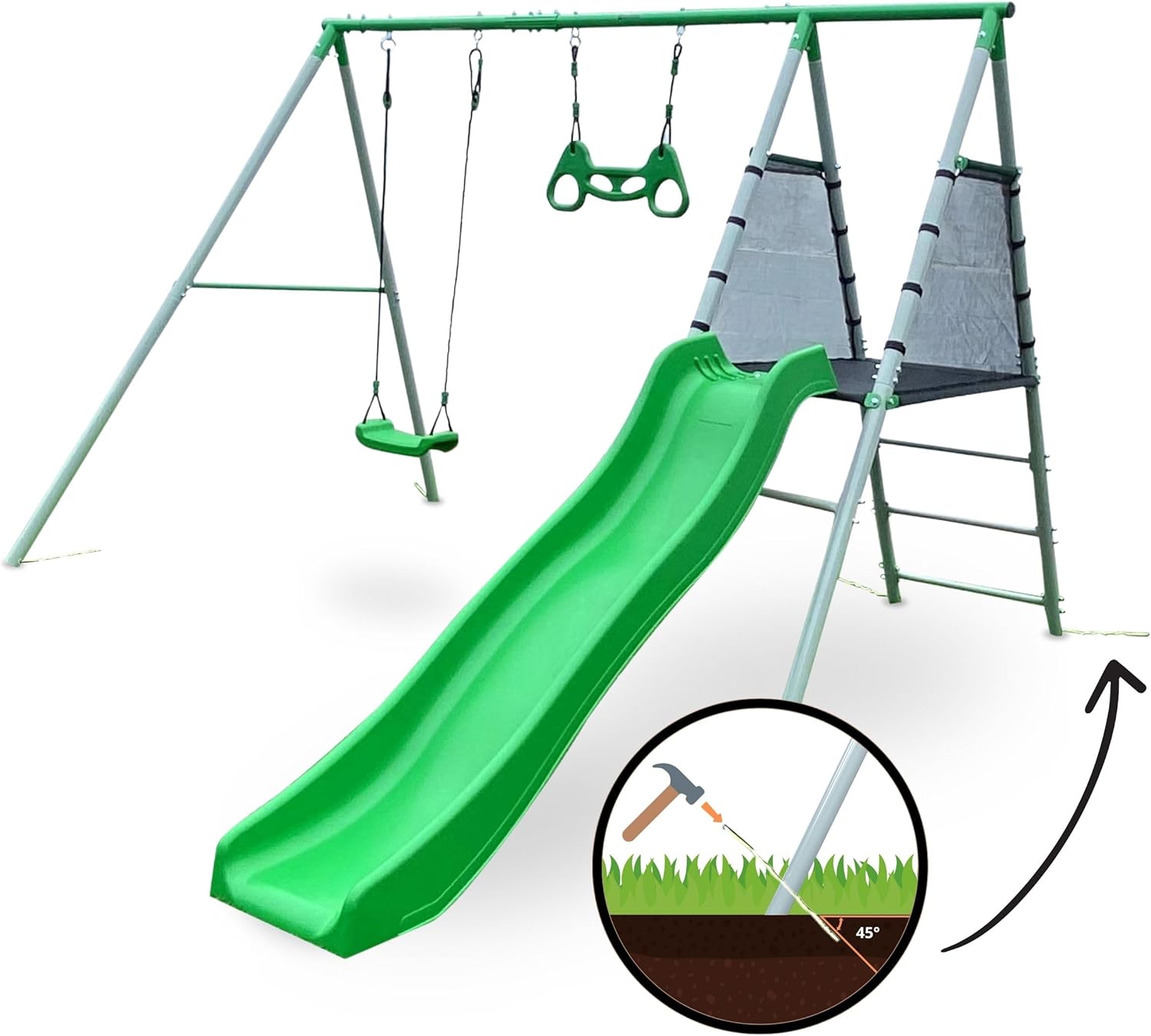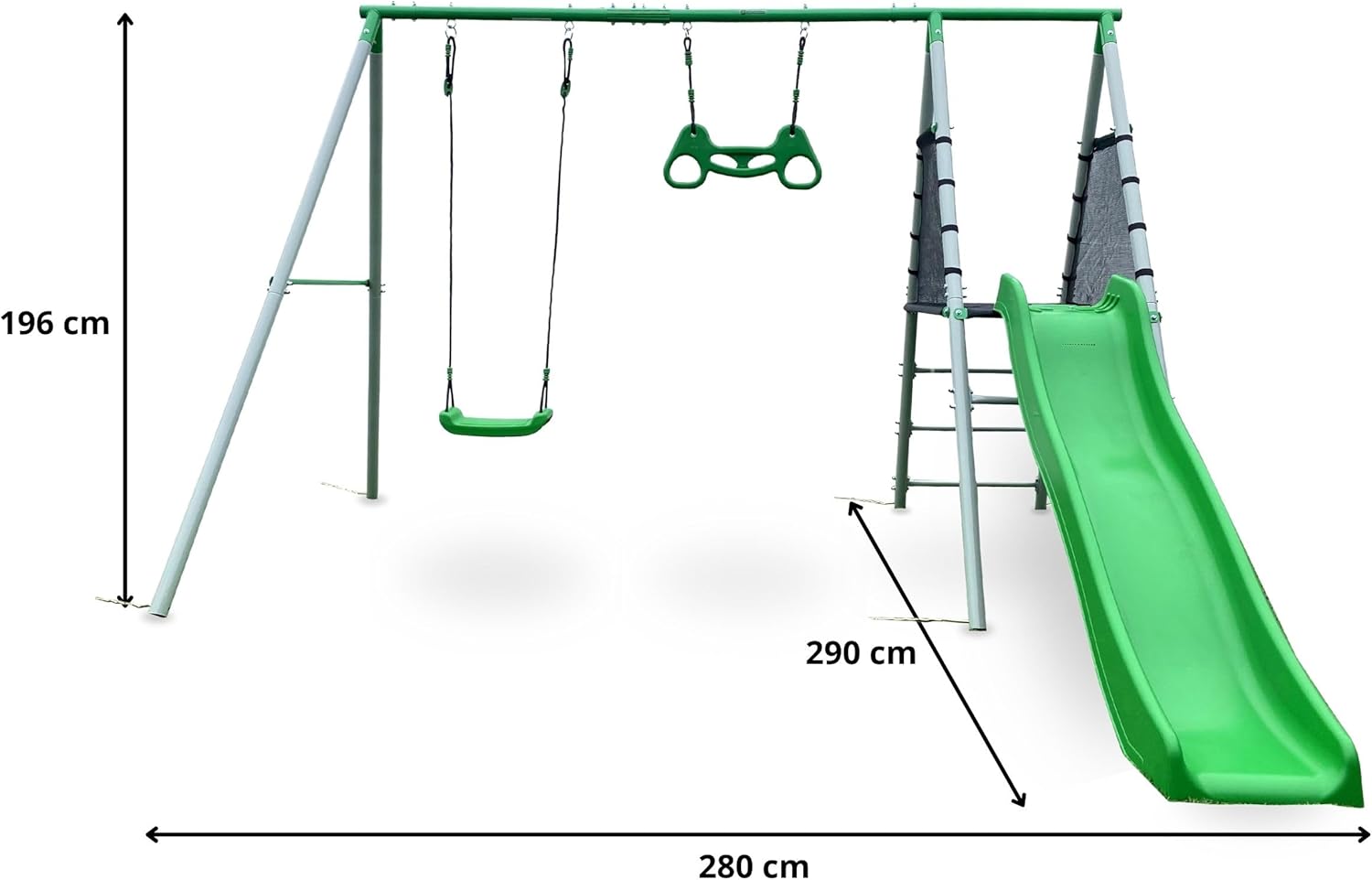 Parco giochi in giardino: crea un centro di attività unico per il tuo bambino in giardino! Arricchisci lo spazio intorno alla tua casa con un attraente parco giochi che diventerà presto il luogo preferito del tuo bambino! Molte funzioni: un'altalena singola con una comoda seduta e un trapezio ginnico sono posizionati su un robusto telaio in acciaio. C'era anche uno scivolo alto 183 cm. Per aumentare il livello di sicurezza, la sua piattaforma è dotata di una rete resistente Permette fino a 4 persone di divertirsi contemporaneamente: dondolarsi, scivolare o esercitarsi sul trapezio porterà senza dubbio molta gioia ai bambini, ma non solo. Sosterranno inoltre il loro sviluppo motorio, rafforzeranno i loro muscoli e miglioreranno il loro senso di equilibrio Sicurezza: il parco giochi da giardino per bambini soddisfa gli standard di sicurezza, ha una superficie liscia e bordi arrotondati. È stato creato sulla base di elevati standard di qualità, garantendo un utilizzo lungo e sicuro Specifica: Dimensioni dell'altalena: 280 (lunghezza) x 290 (larghezza) x 196 (altezza) cm; Regolazione della lunghezza della corda entro l'intervallo di 30 cm; Carico massimo del sedile: 45 kg; Carico massimo sul telaio: 200 kg