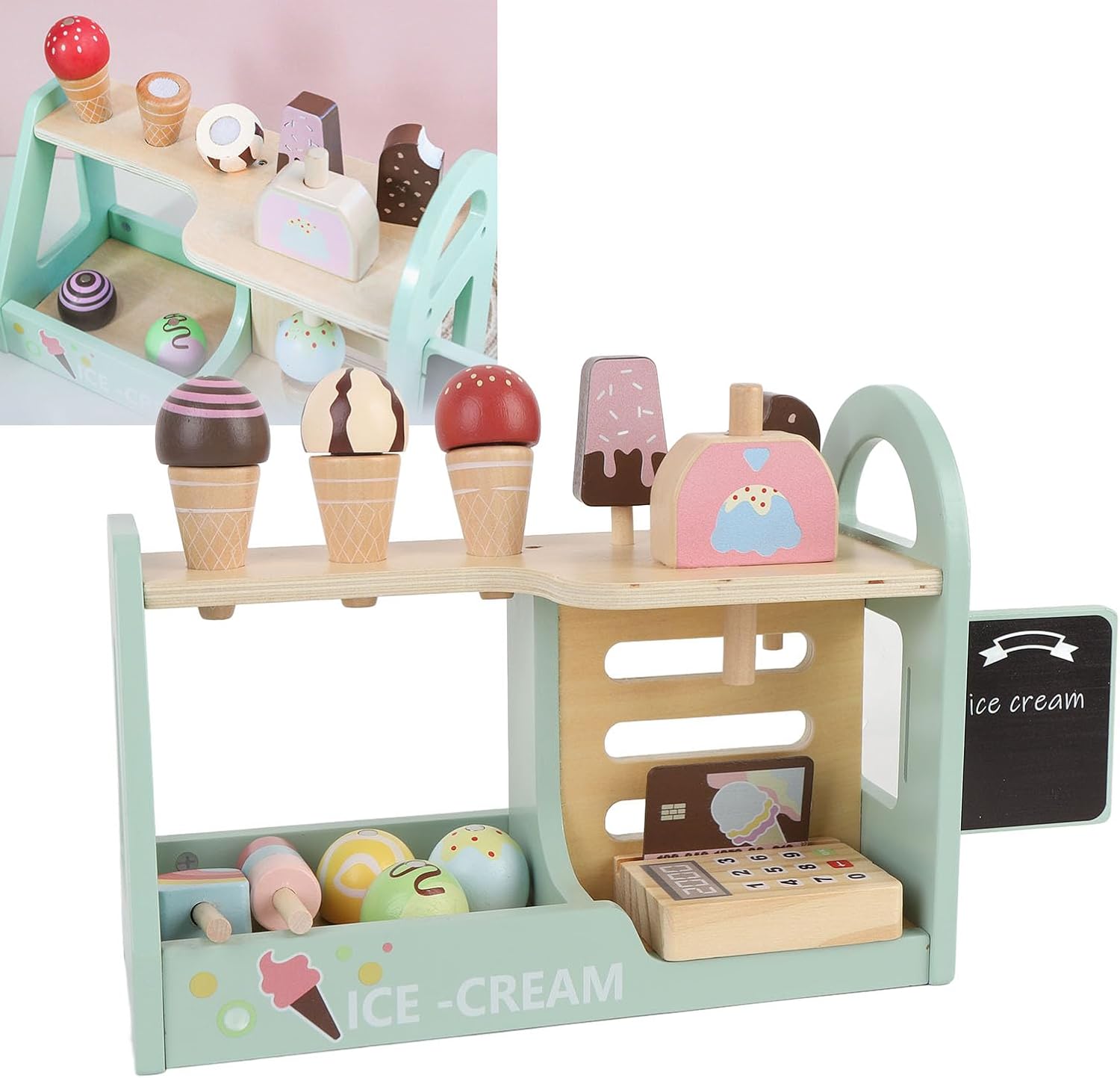[MATERIALI SICURI E DUREVOLI] Realizzato in legno massello e compensato, questo set per gelato in legno garantisce un'esperienza di gioco e duratura per i bambini. [ISPIRA IL GIOCO] Il design realistico di questo giocattolo stimola l'immaginazione, consentendo ai bambini di immergersi nel mondo della vendita di gelati e delle attività di gioco di ruolo. [MIGLIORA LE CAPACITÀ MOTORIE] Con pezzi di gelato e mattoncini, i bambini possono migliorare le loro capacità motorie mentre assemblano forme diverse durante il gioco. [INCORAGGIA L'INTERAZIONE SOCIALE] Partecipa al gioco di finzione con questo giocattolo della gelateria, promuovendo il lavoro di squadra e le capacità di comunicazione mentre i bambini assumono vari ruoli nella gestione di un negozio. [EDUCATIVO E COINVOLGENTE] Combinando l'apprendimento con il divertimento, questo giocattolo di simulazione offre un ottimo modo per genitori e figli di legare e creare ricordi duraturi.