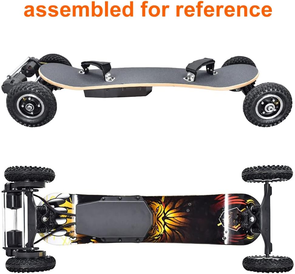 Components Of Electric Mountain Skateboard DIY Assemble All Terrain Skateboard With Children Like Parent-Child Activity This item is the components for electric mountain skateboard. We will pack the components separately, so you can assemble all the components by yourself or with your family/friends, just enjoy the time to build your skateboard. For the different countries' shipping policy, we maybe ship this item by many packages, if so, we will tell you the package amount when we ready to ship it. This item without the battery, you need to buy the battery spearately, it can be a 10S li-po battery or a 36V li-ion battery, I recommend the battery discharging current more than 50A. This item includes: 1). 1x skateboard deck 2). 2x foot band (a pair) 3). 2x truck 4). 2x 8-inch wheel with pulley 5). 2x 8-inch normal wheel 6). 1x 3-pole motor bracket 7). 2x N63 motor 8). 2x motor pulley cover 9). 2x motor cover 10). 2x small pulley (for motor shaft) 11). 2x belt 12). 1x controller board 13). 1x remote 14). 1x battery box (can put max 50 pcs of 18650 battery cell) Buy it now, we can upgrade the foot band to the new design for free, there are 10 places only. Here are pictures of the parts: Skateboard deck and foot band: Truck: Normal truck for reference: Electric truck for reference: Motor Specification Model: 6374 Voltage: 36 Volt Output: 2800 WattRotate: 190 KVMax current: 120A Max speed: 40 Km/h 8 inch wheel with 72 teeth pulley: (pulley for HTD 5M belt)