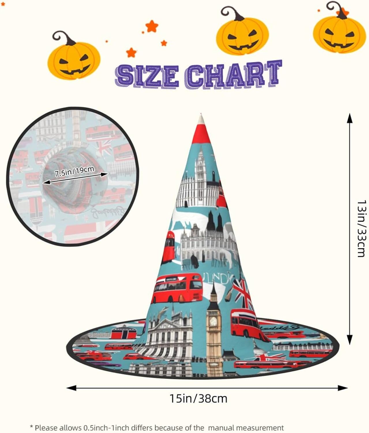 Realizzati in tessuto Oxford superiore, i nostri cappelli con stampa I Like London garantiscono durata e longevità. Il design unico consente di ridurre al minimo la parte superiore del cappello e i bordi di essere attorcigliati e piegati, rendendo i cappelli salvaspazio e facilmente portatili. Ogni cappello con stampa I Like London è di dimensioni generose per adattarsi alla maggior parte delle persone ed è leggero per un comodo utilizzo. Si prega di leggere la tabella delle taglie prima di effettuare l'ordine. Il design versatile dei nostri cappelli da strega di Halloween con stampa I Like London li rende perfetti per varie occasioni. Sono lavabili in lavatrice e ad asciugatura rapida per una facile manutenzione.