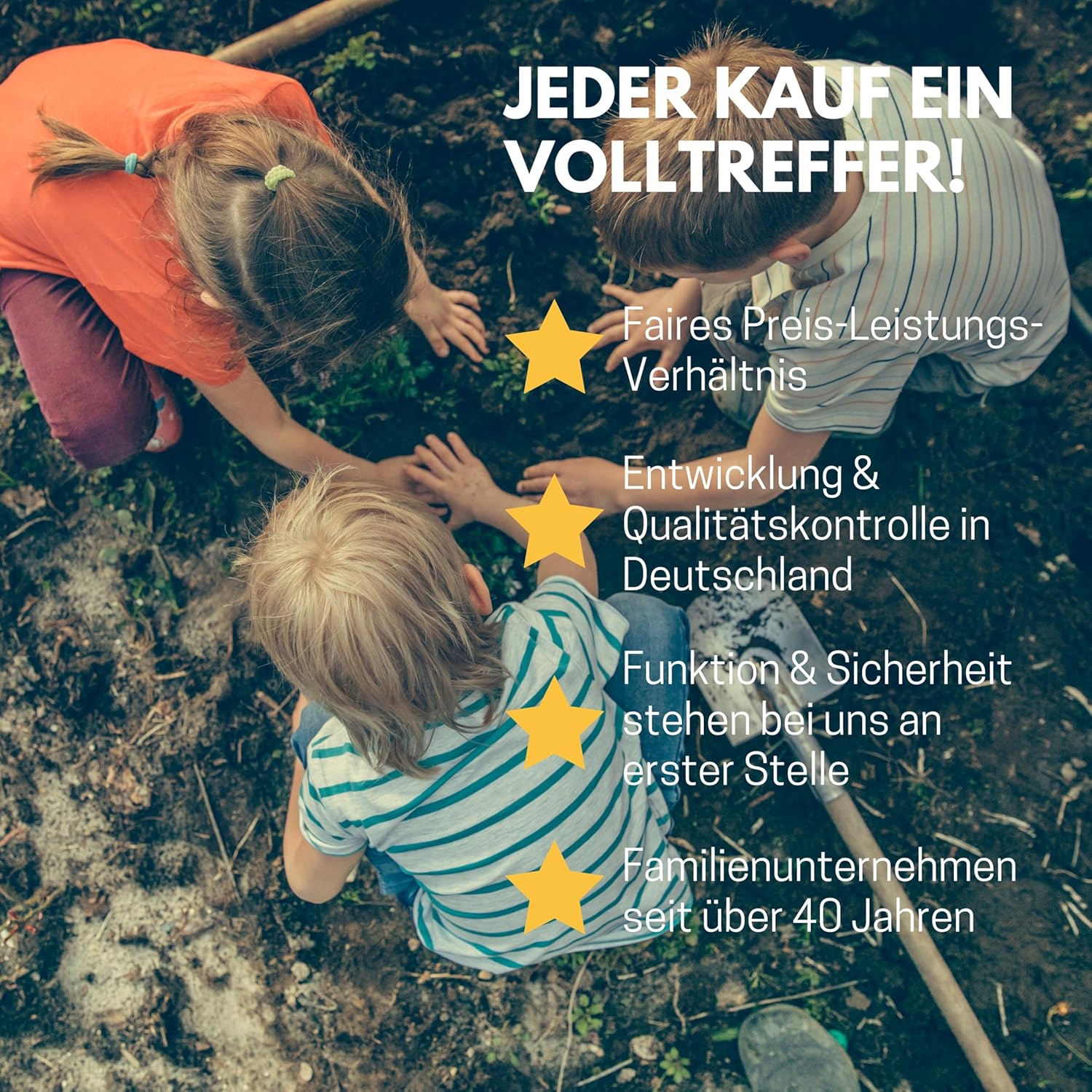 ROBUSTI ATTREZZI PER BAMBINI: Gli attrezzi da giardino per bambini sono realizzati in metallo resistente o nylon e un robusto manico in legno. Perfetto per far sì che i bambini aiutino in giardino e si divertano. MATERIALE DI ALTA QUALITÀ: I dispositivi sono realizzati in metallo o nylon di alta qualità, che li rende durevoli e resistenti alle condizioni atmosferiche. Il robusto manico in legno offre ulteriore comfort e stabilità. DIMENSIONE A MISURA DI BAMBINO: Con una lunghezza totale fino a 86 cm, i dispositivi sono ideali per i bambini e i loro primi progetti in giardino! DESIGN ERGONOMICO: il manico in legno si adatta comodamente alle mani piccole e consente una manipolazione sicura e confortevole. Adatto a bambini dai 3 anni in su. QUALITÀ PER CONVINZIONE: Come azienda a conduzione familiare di Brema, da oltre 40 anni diamo forma alle tendenze dei prodotti per lo sport e il tempo libero: la vostra soddisfazione è ciò che ci guida.