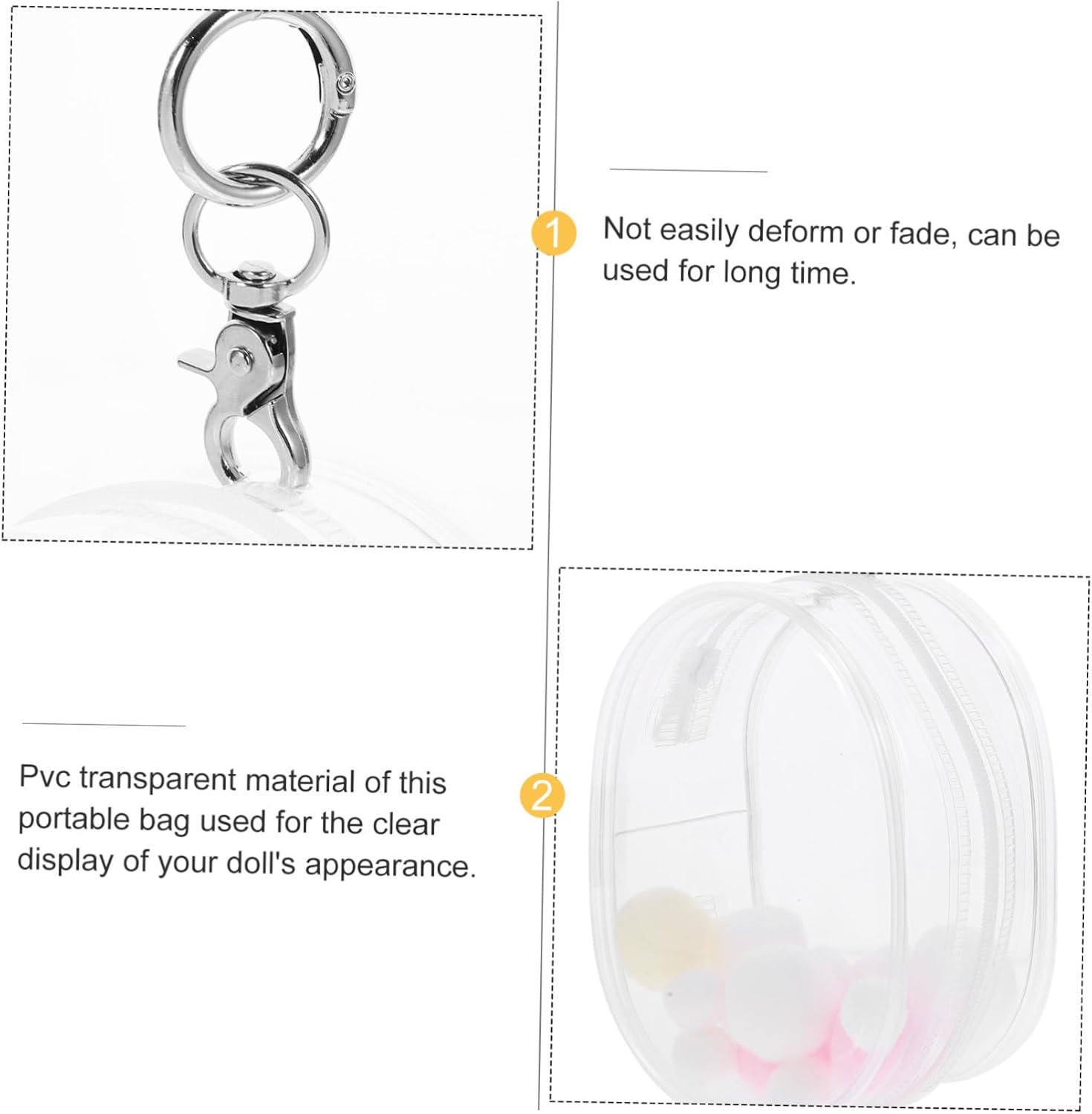 Borsa multifunzionale: le dimensioni di questa borsa per bambole significano che può ospitare una varietà di dimensioni di bambole, rendendola versatile e pratica, piccola borsa per riporre le bambole Borsa robusta: realizzata con materiali in pvc stabili e robusti, pratica, compatta e maneggevole, può essere utilizzata per appendere bagagli a lungo Borsa trasparente per bambole: questa borsa per bambole fornisce protezione per la tua bambola, prevenendo eventuali danni, offrendoti più comodità, borsa per bambole Borsa per il trasporto di bambole da esterno: con un comodo gancio, questa borsa per il trasporto di bambole è facile da trasportare e riporre, rendendo questa borsa un accessorio, borsa per il trasporto di bambole Mini borsa per bambole: il design trasparente di questa borsa per il trasporto di bambole consente una facile identificazione della tua bambola, borsa molto portatile, piccola borsa per bambole da esterno