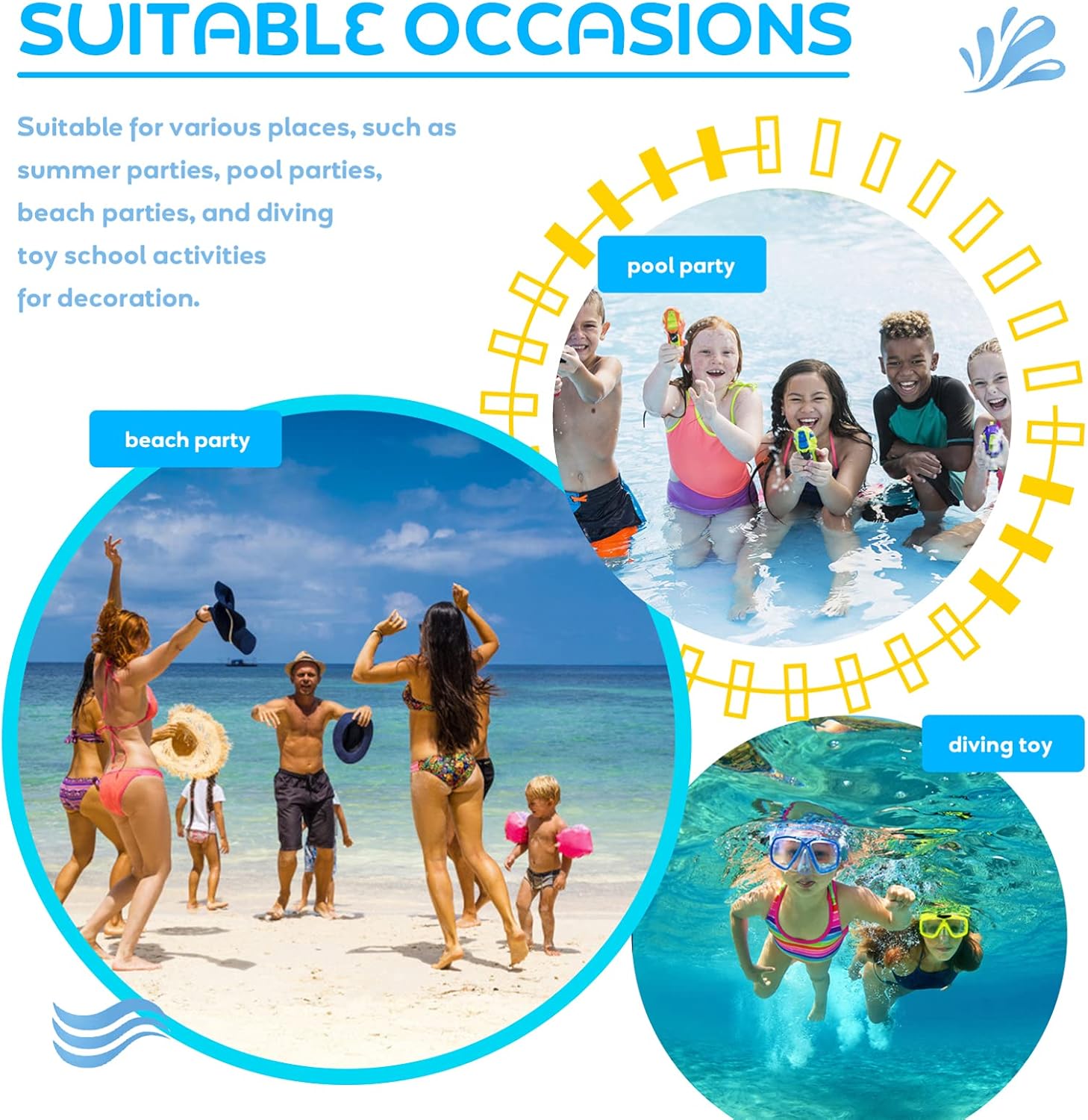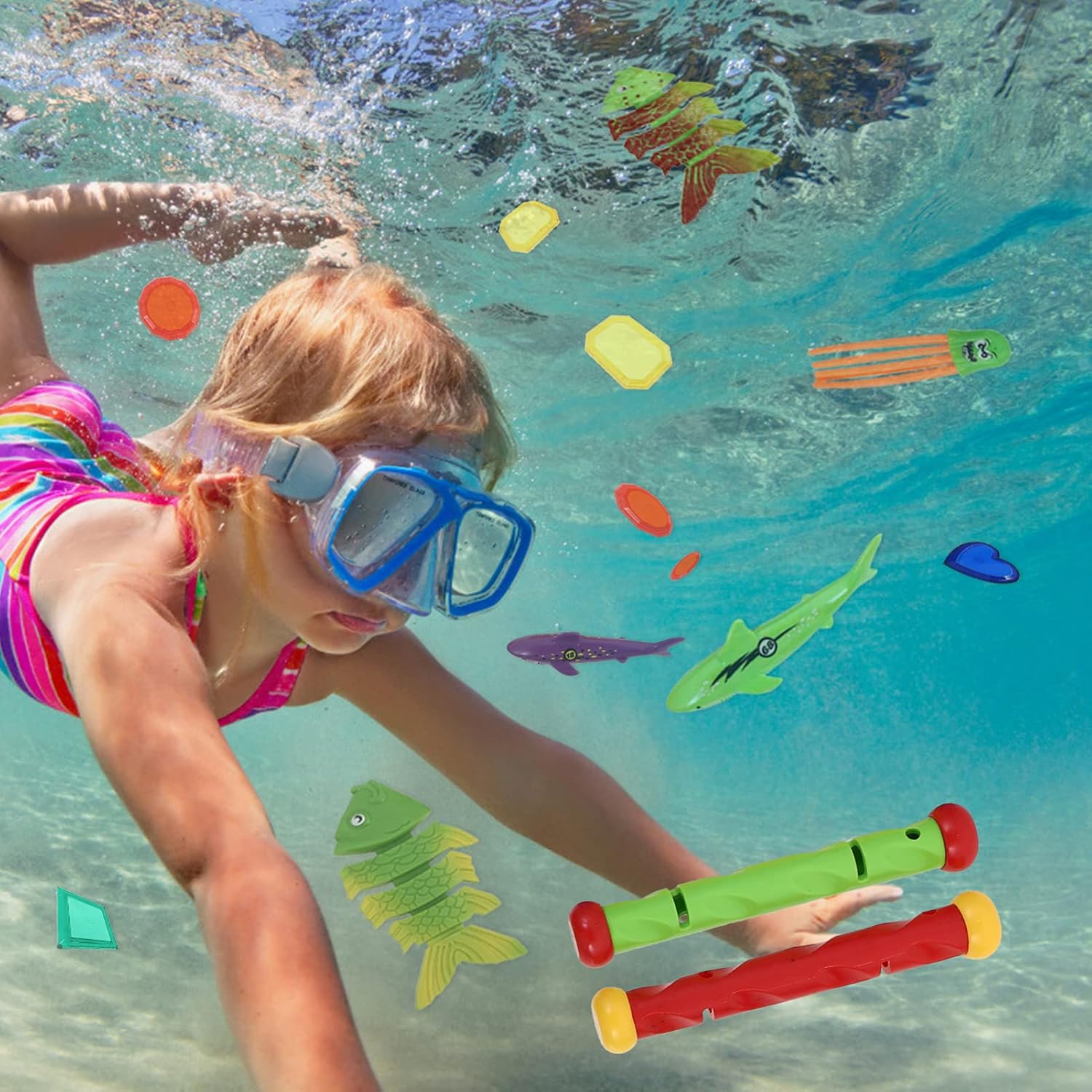 I giocattoli colorati che affondano in colori vivaci sono realizzati in plastica ad alta densità. Buona resistenza all'acqua e resistenza all'invecchiamento, più durevole, non sbiadisce facilmente al sole o danneggia. Il design levigato dei bordi è ottimo per far giocare i bambini in piscina. Design speciale del di gravità, il set da immersione è ponderato e può affondare e stare in piedi sul fondo della piscina. Aiuta i bambini a imparare le immersioni e a promuovere le abilità subacquee, imparando nel gioco, il miglior per i tuoi bambini.