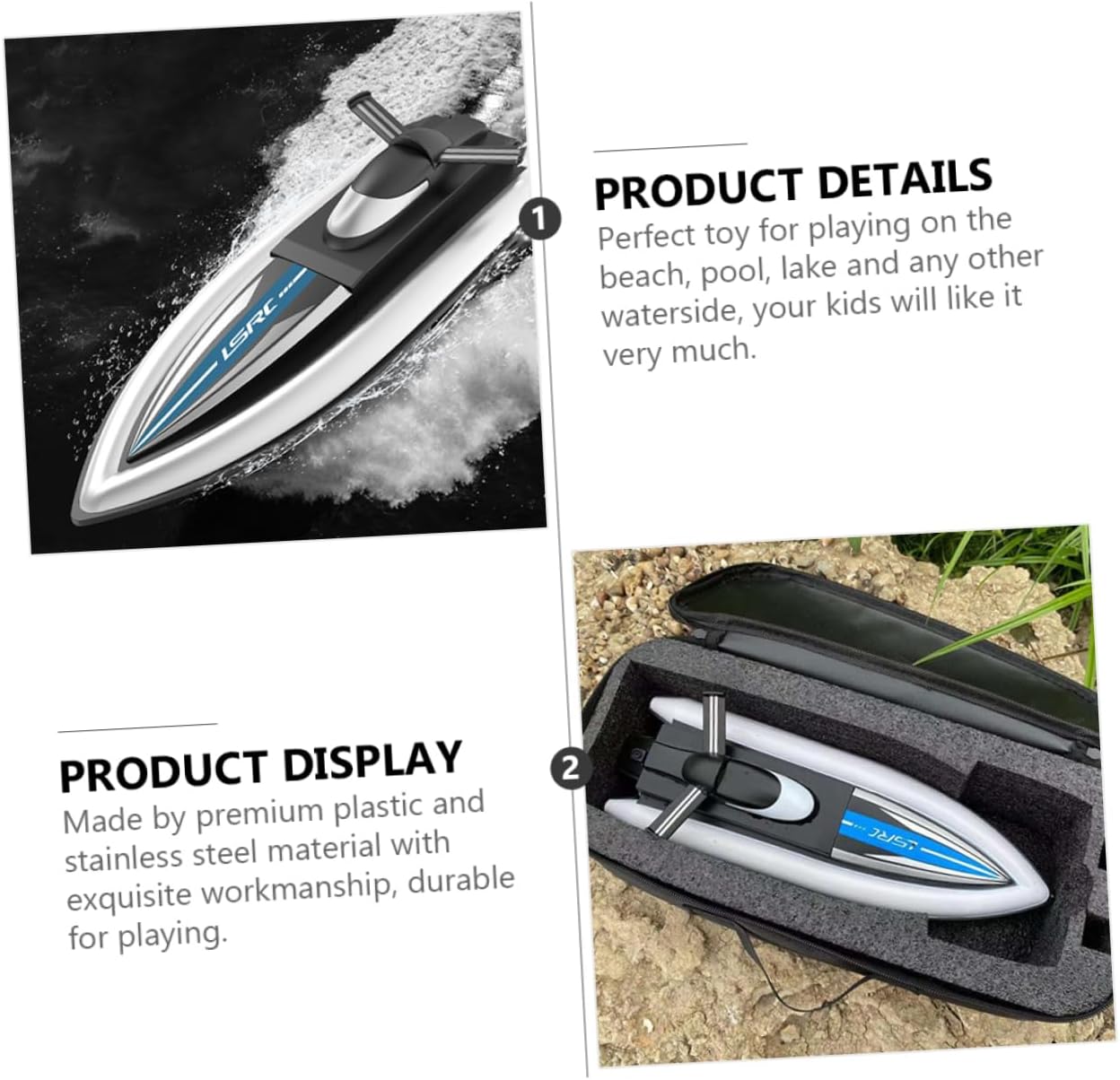 Realizzato con materiale in plastica premium e acciaio inossidabile con squisita lavorazione, resistente per la riproduzione. Giocattolo perfetto per giocare sulla spiaggia, la piscina, il lago e qualsiasi galleria, i tuoi figli piacerà molto. Con una borsetta di stoccaggio, e la barca è leggera e portatile, che è molto comoda da svolgere. Questa barca a distanza, è un perfetto per i tuoi figli, saranno felici quando lo riceveranno. Basta portare questa barca da corsa verso la focacciata, avendo un tempo felice e indimenticabile con i tuoi figli.