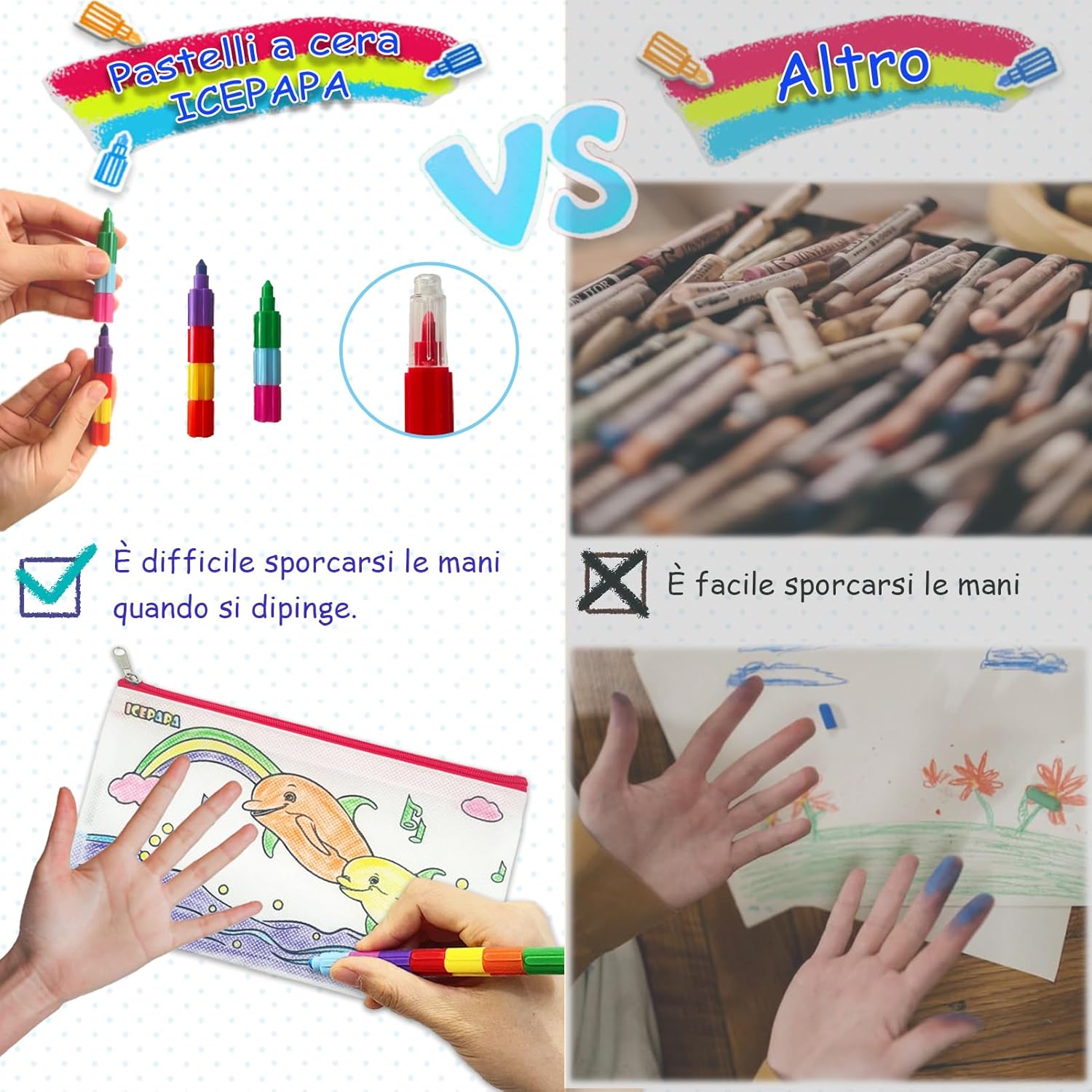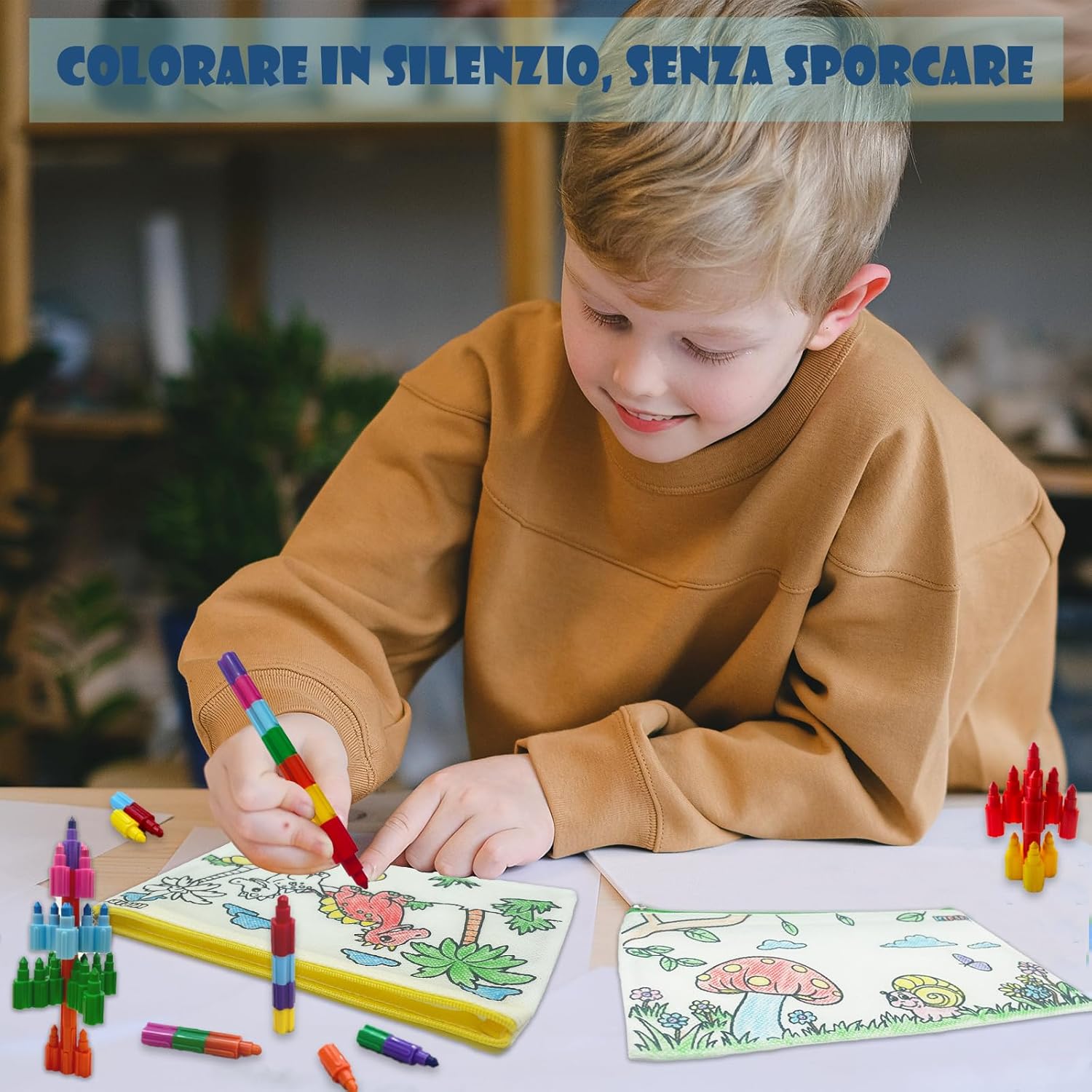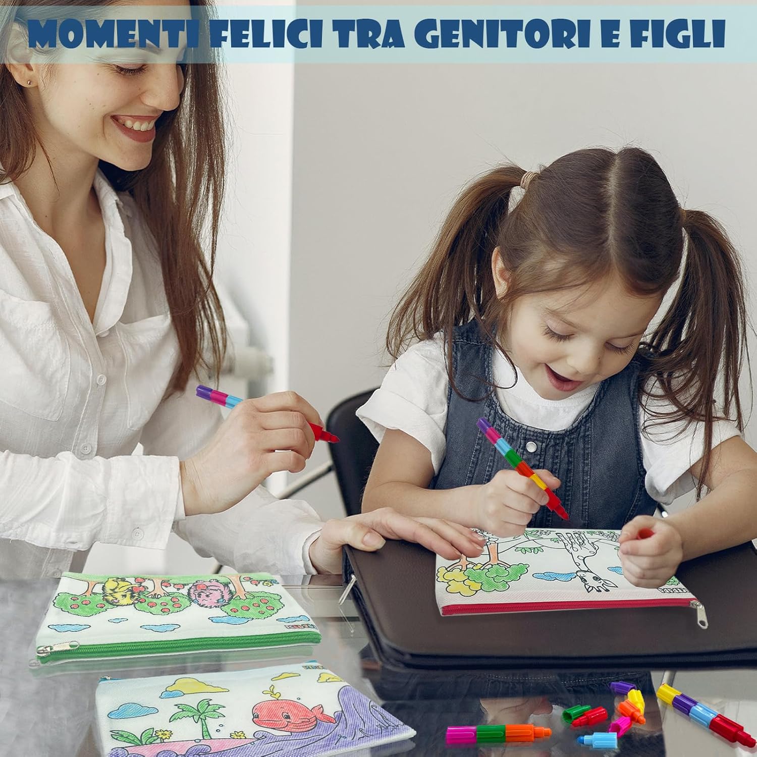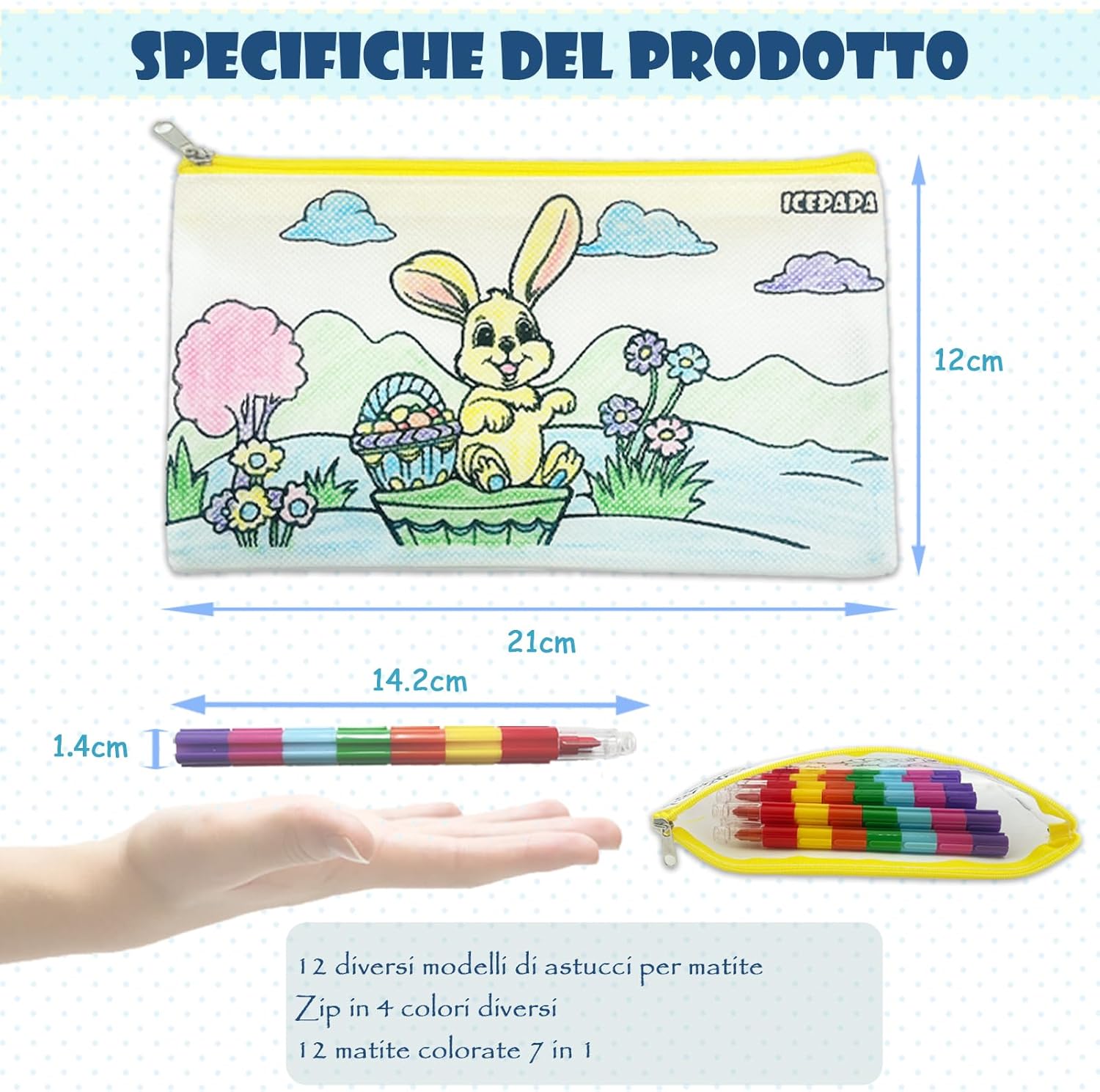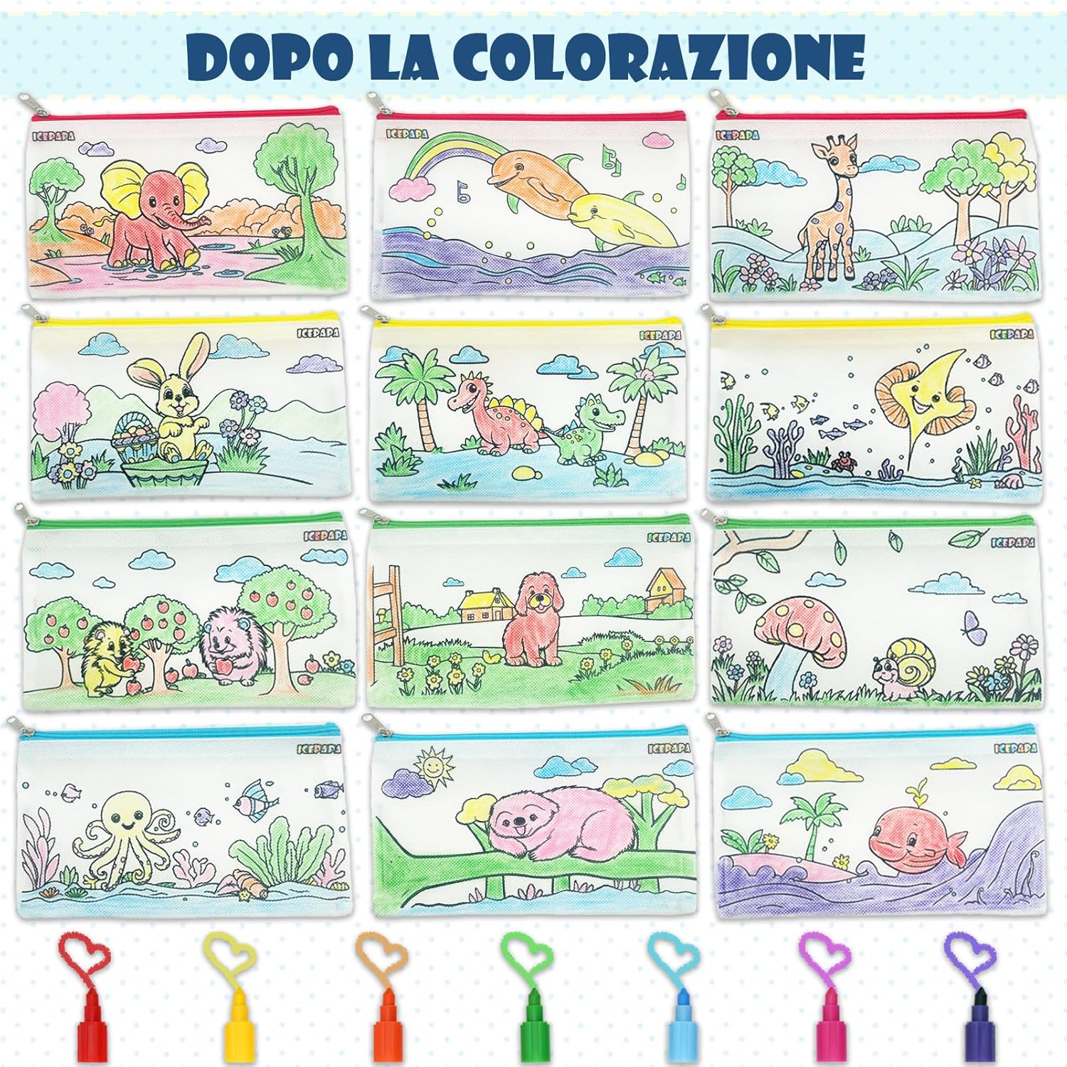 【Kit colori per bambini divertentis】Questo set contiene 12 sacchetti di tessuto da colorare e 12 colori a cera impilabili per bambini. Ogni borsa di stoffa è stampata con un motivo diverso e divertente, i motivi sono quelli illustrati e non ci sono duplicati. Un pastello è composto da piccoli pastelli indipendenti in 7 colori diversi, il che rende facile coprire le esigenze di colorazione di un bambino con un solo pastello. 【Colorato e pratico】La dimensione della borsa di stoffa con cerniera è di 21 cm * 12 cm, con quattro colori di cerniera, rosso, blu, giallo e verde, 3 pezzi di ciascuno. Il sacchetto di stoffa è realizzato in tessuto non tessuto, facile da colorare e adatto a conservare il gadget scuola, una buona scelta per i ragazzi e le ragazze con astuccio per matite. 【Pastello multicolore】 Lunghezza di ogni pastello a cera 14,2 cm, adatto ai bambini per afferrare e facile da trasportare. Questo pastello non è adatto solo per disegnare, ma anche per realizzare vari modelli con l'immaginazione del bambino, il che è molto utile per lo sviluppo delle capacità di disegno e della creatività. I pastelli con sette colori in uno riducono il disordine e la possibilità di colorare senza sporcarsi le mani. 【Gadget festa compleanno bambini】La borsa di stoffa da colorare con motivi prestampati è un grande successo per i bambini. In combinazione con le penne impilabili, i bambini possono facilmente colorare i motivi e provare un senso di soddisfazione nel colorare, ideale per regalini compleanno bambini invitati e pensierini per bambini dopo festa. 【Garanzia di qualità e servizio】Se avete domande o insoddisfazione con il prodotto, non esitate a contattarci, riceverete una sostituzione o un rimborso. ATTENZIONE: Non adatto a bambini di età inferiore a 36 mesi. Contiene piccole parti, rischio di soffocamento!