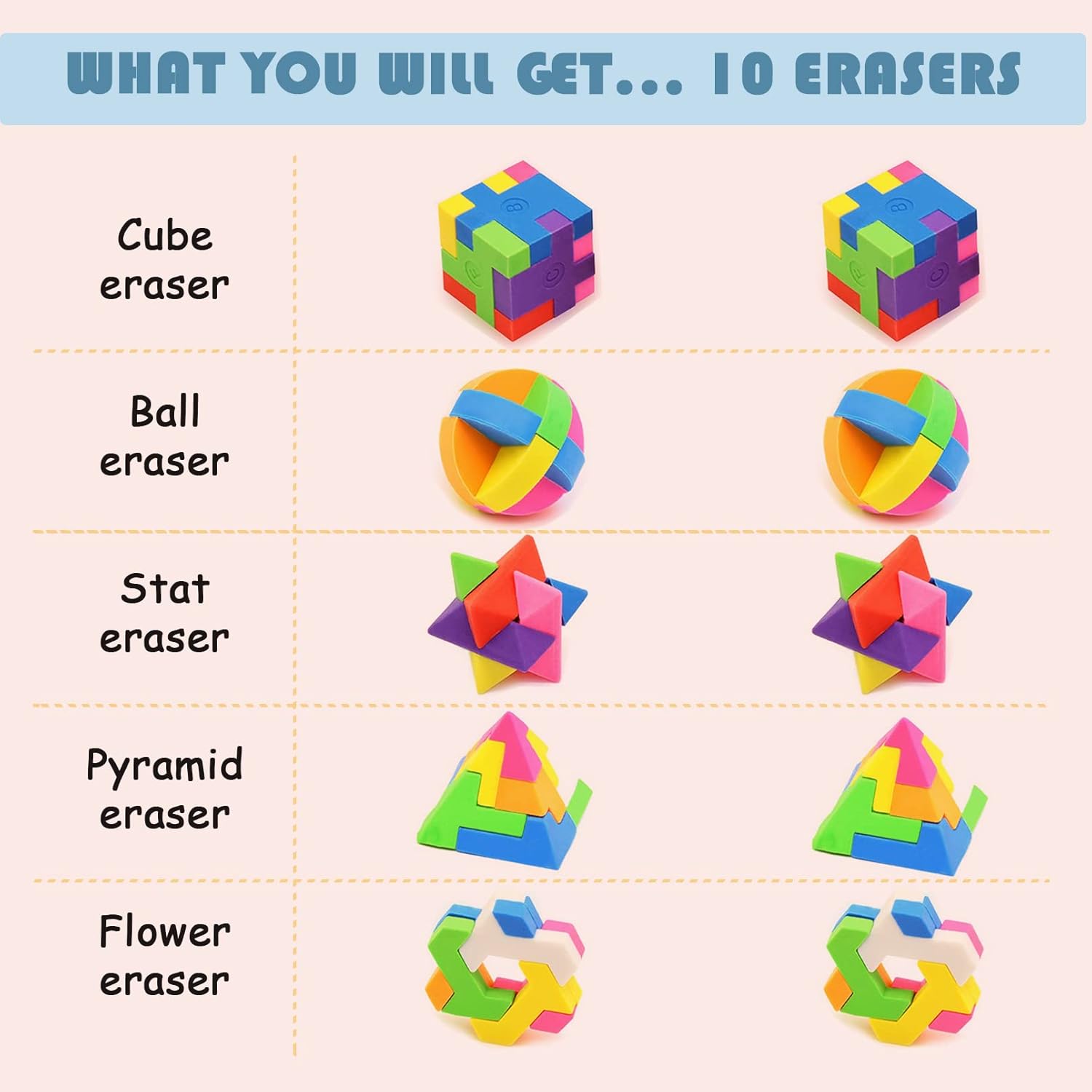 🎁【Gomme da cancellare divertenti】 : è sia una gomme cancellareche un puzzle bambini. Possono essere utilizzati sia come cancelleria scuola che attraverso il processo di smontaggio e montaggio per coltivare l'abilità pratica e la creatività dei bambini. 🎁【Puzzle 3D a colori】: Include 10 pezzi puzzle a colori con gomma in 5 stili diversi tra cui cubi, palline e piramidi, stelle e fiori. 2 di ogni stile, ottimi come gadget bambini o regalini festa per bambini 🎁【Regalini fine festa bambini】: Queste gomme da cancellare per novità sono perfette per regalini compleanno bambini invitati o materiale scolastico, premi, premi in classe e altro ancora. 🎁【Gomma da cancellare per bambini】:Ogni pezzo di gomma è realizzato in materiale TPR , di consistenza morbida, I bambini possono usarlo con sicurezza. 🎁【Garanzia di qualità e servizio】: In caso di domande o insoddisfazione per il prodotto, non esitate a contattarci, otterrete una sostituzione o un rimborso.