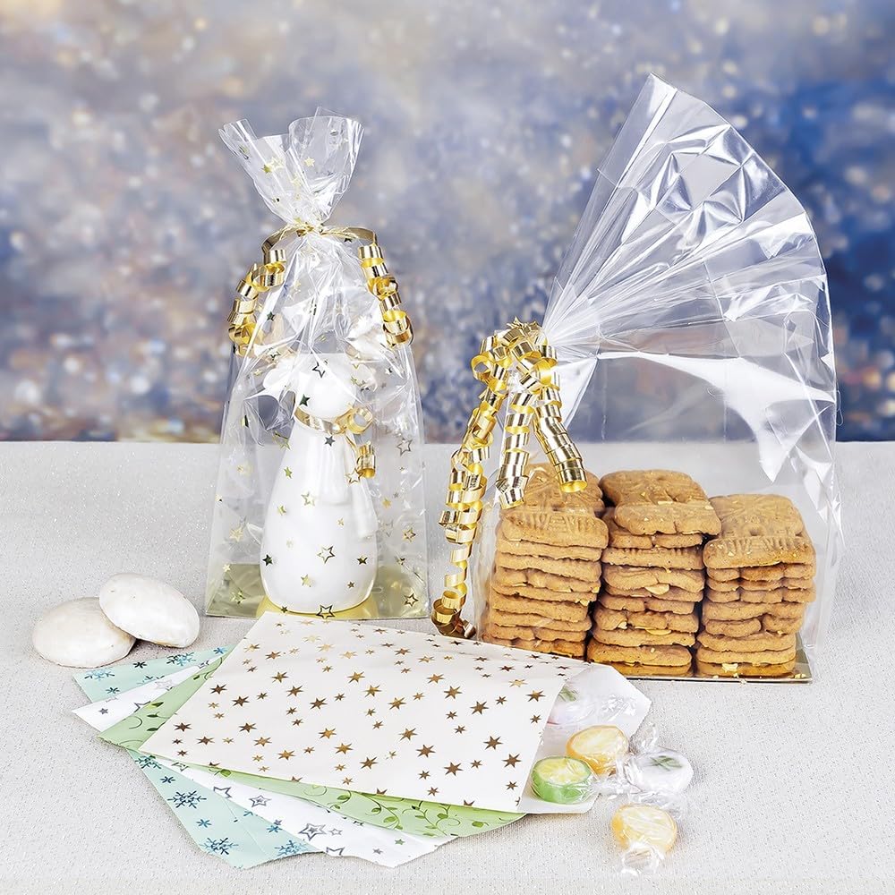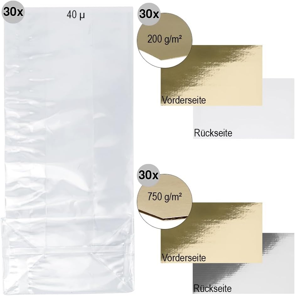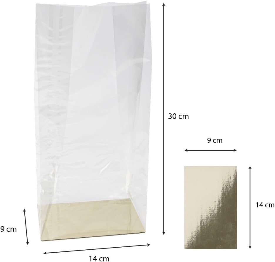 Elegante confezione regalo: con questi robusti sacchetti con fondo quadro in plastica per alimenti potrete creare in un batter d'occhio eleganti confezioni regalo per ogni occasione. Utilizzo versatile: confezionate senza esitazione in questi sacchetti non solo piccoli regali, ma anche dolcetti fatti in casa come biscotti, cioccolatini o tè. Nella confezione festiva c'è spazio anche per dolci, souvenir, regali, regalini e altri articoli da regalo. Base stabile: ogni borsa contiene un ripiano rimovibile in cartone a specchio dorato. Per una stabilità ancora maggiore, aggiungi una delle basi extra spesse 750 g/m². Qui puoi scegliere tra un lato dorato e uno argentato. Dimensioni pratiche: con dimensioni di 14 x 30 x 9 cm (LxAxP), queste borse sono perfette per regali di piccole e medie dimensioni.