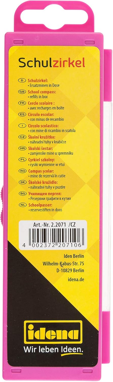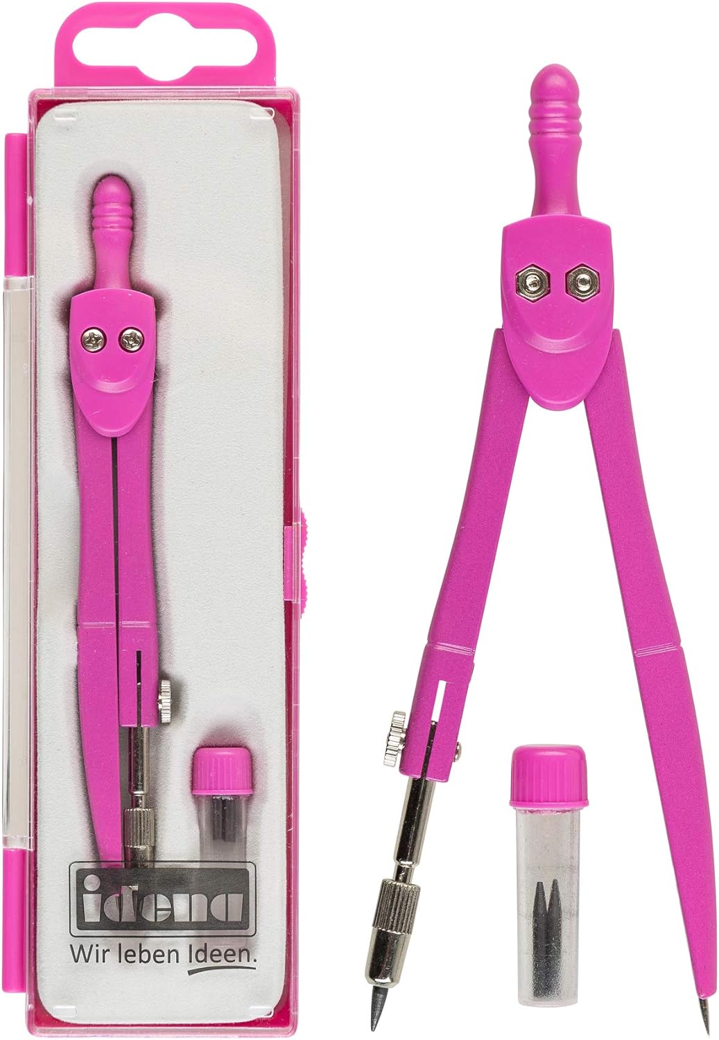 Inclusi i cavi di ricambio in una scatola Bussola piccola e pratica Modifica del raggio semplicemente tirando o spingendo tra loro Punta in metallo all'estremità della prima gamba e portamine all'estremità della seconda gamba Bussole e ricariche in una custodia per una protezione ottimale durante il trasporto