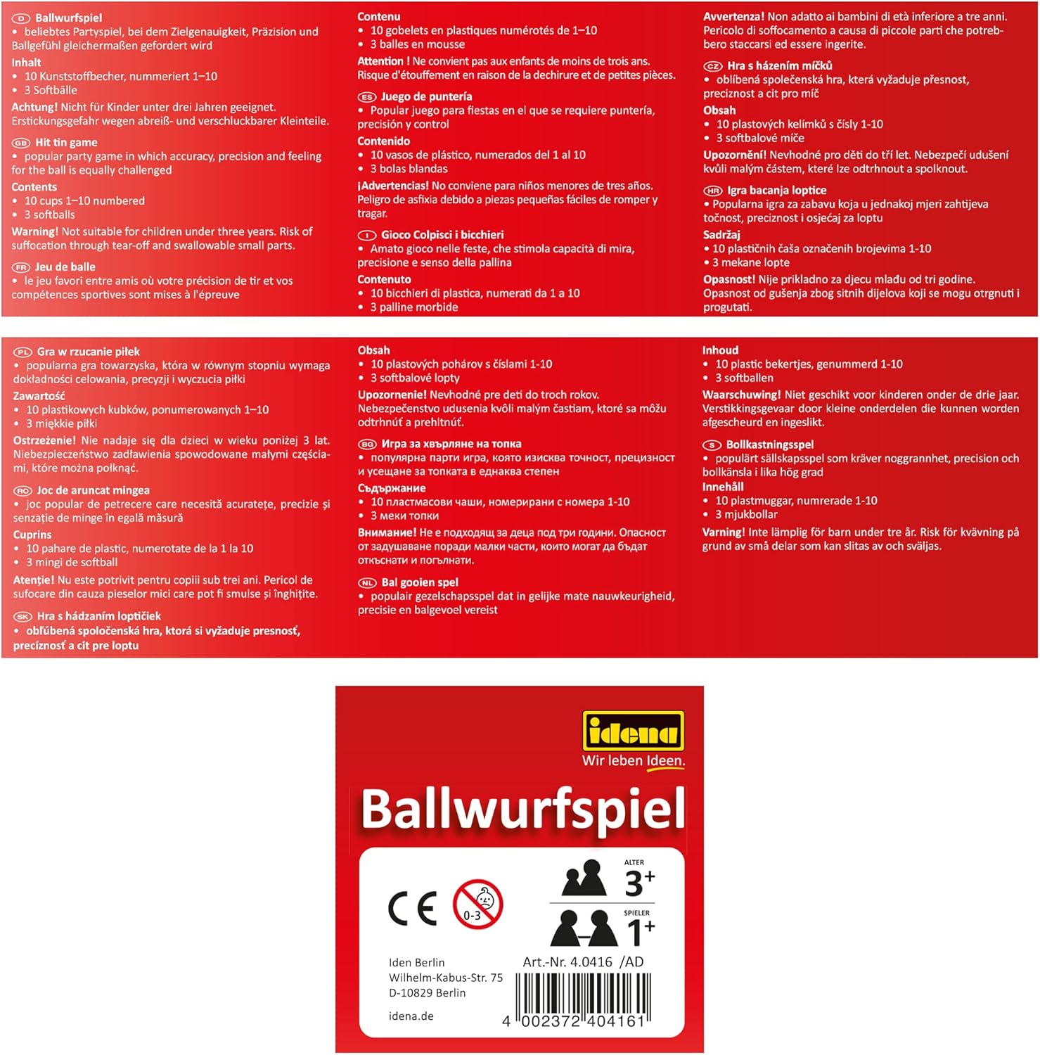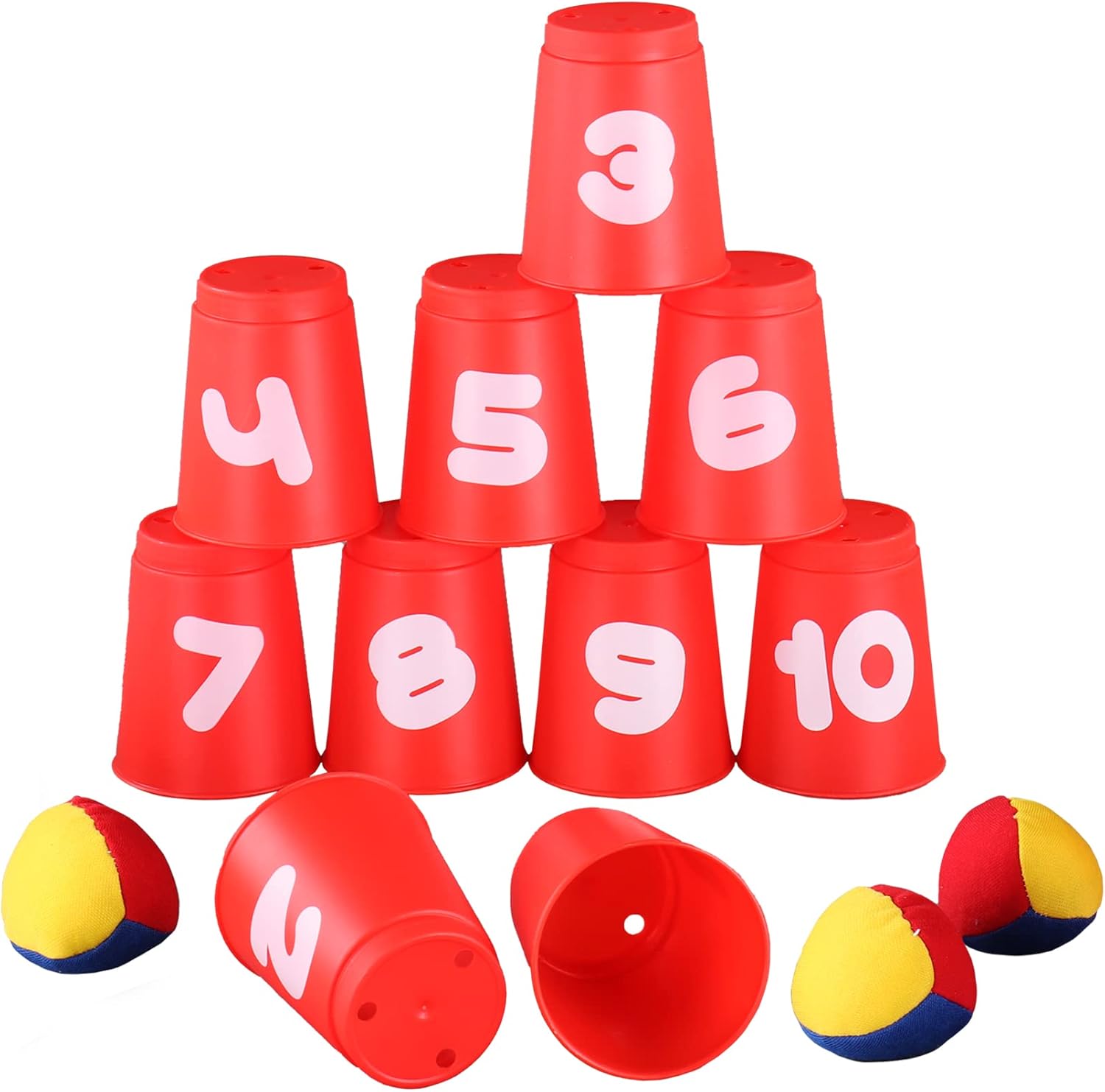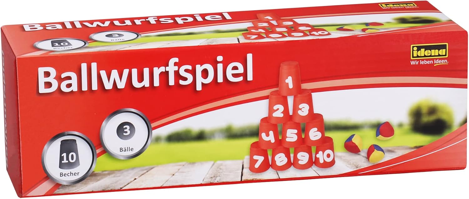 Gioco di lancio con tazze per bambini a partire da 3 anni Contiene 10 bicchieri di plastica rossi con i numeri da 1 a 10 e 3 palline colorate di tessuto riempite di sabbia Per almeno 2 giocatori: una piramide è costruita dalle tazze, che viene lanciata con le palle, chi ha rovesciato tazze, vince Mentre si gioca, si promuove la coordinazione occhio-mano, l'accuratezza, la precisione e la sensazione di palla dei bambini Ottimo per le feste di compleanno dei bambini o altre feste e come gioco all'aperto nel giardino o nel parco