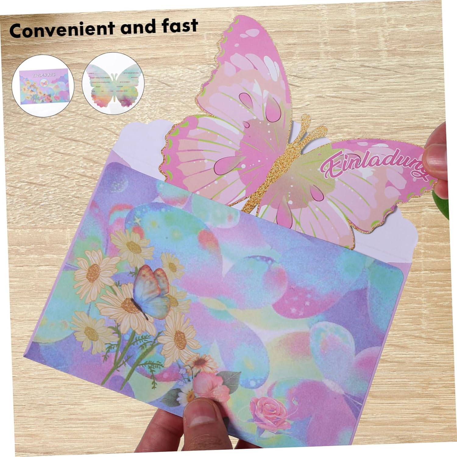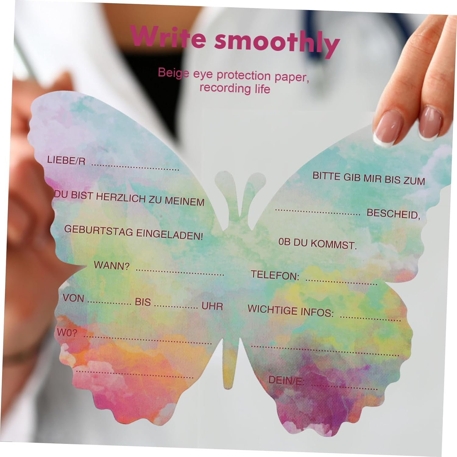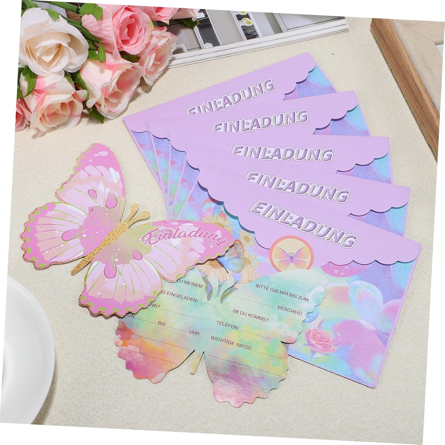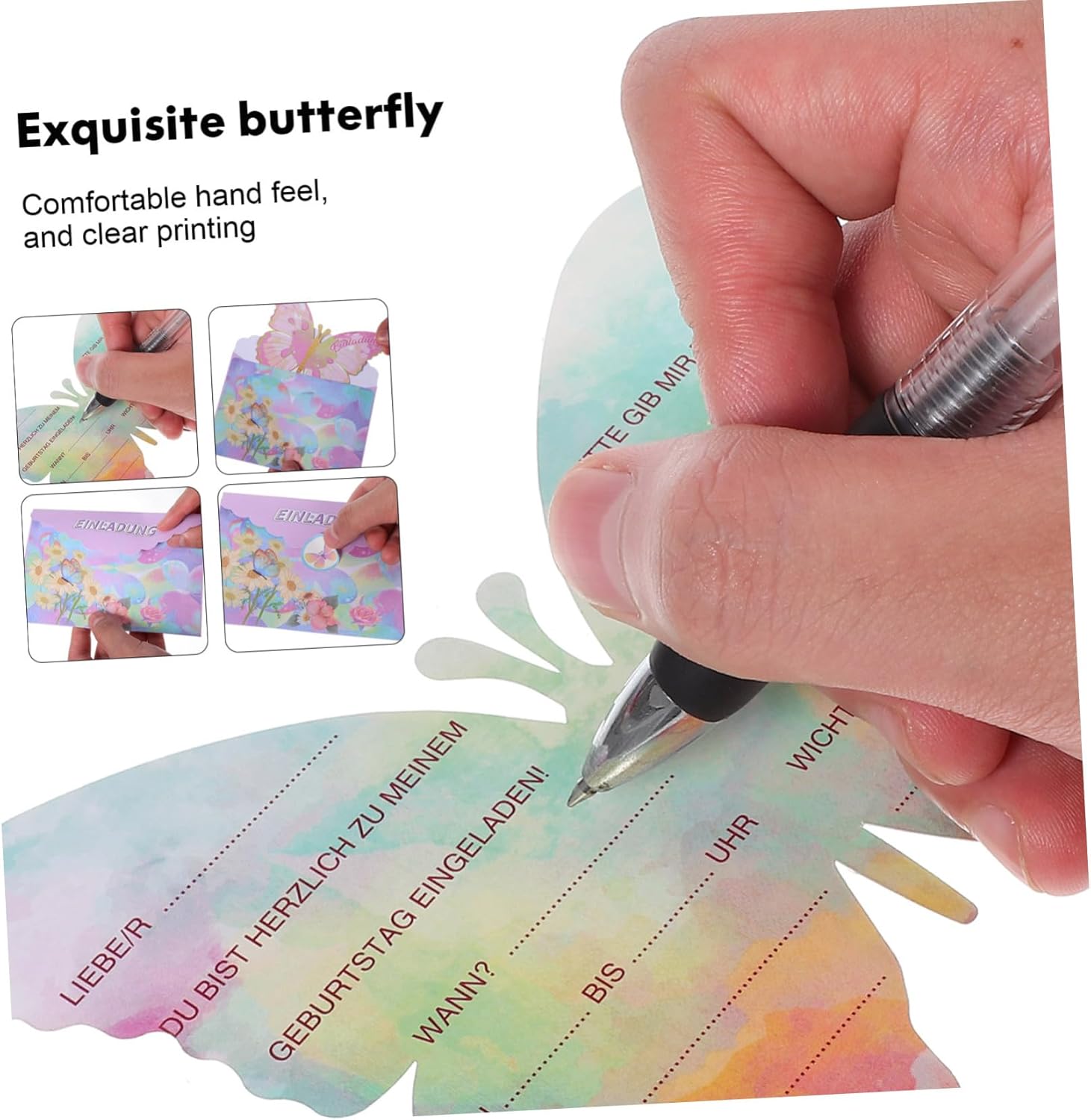 Cartoncino d'invito-- design unico: questi biglietti d'invito sono progettati per essere farfalle, carini e unici, impressioneranno sicuramente i tuoi ospiti. Biglietto d'auguri per festa-- adorabile design a farfalla: gli inviti a forma di farfalla attireranno l'attenzione tuoi ospiti, ideali per le feste di compleanno. Biglietto d'auguri di compleanno a forma di cartone animato: materiale affidabile: i nostri inviti per tutte le occasioni sono realizzati in carta spessa e hanno una stampa brillante e professionale. Invito di compleanno - parole tedesche: dovresti notare che le parole su questi biglietti indicano ospiti tedeschi, europei o feste a tema correlate. Inviti per feste: biglietti per bomboniere: questi bellissimi biglietti sono un'ottima scelta per qualsiasi festa, come feste di compleanno, feste in maschera, ecc.