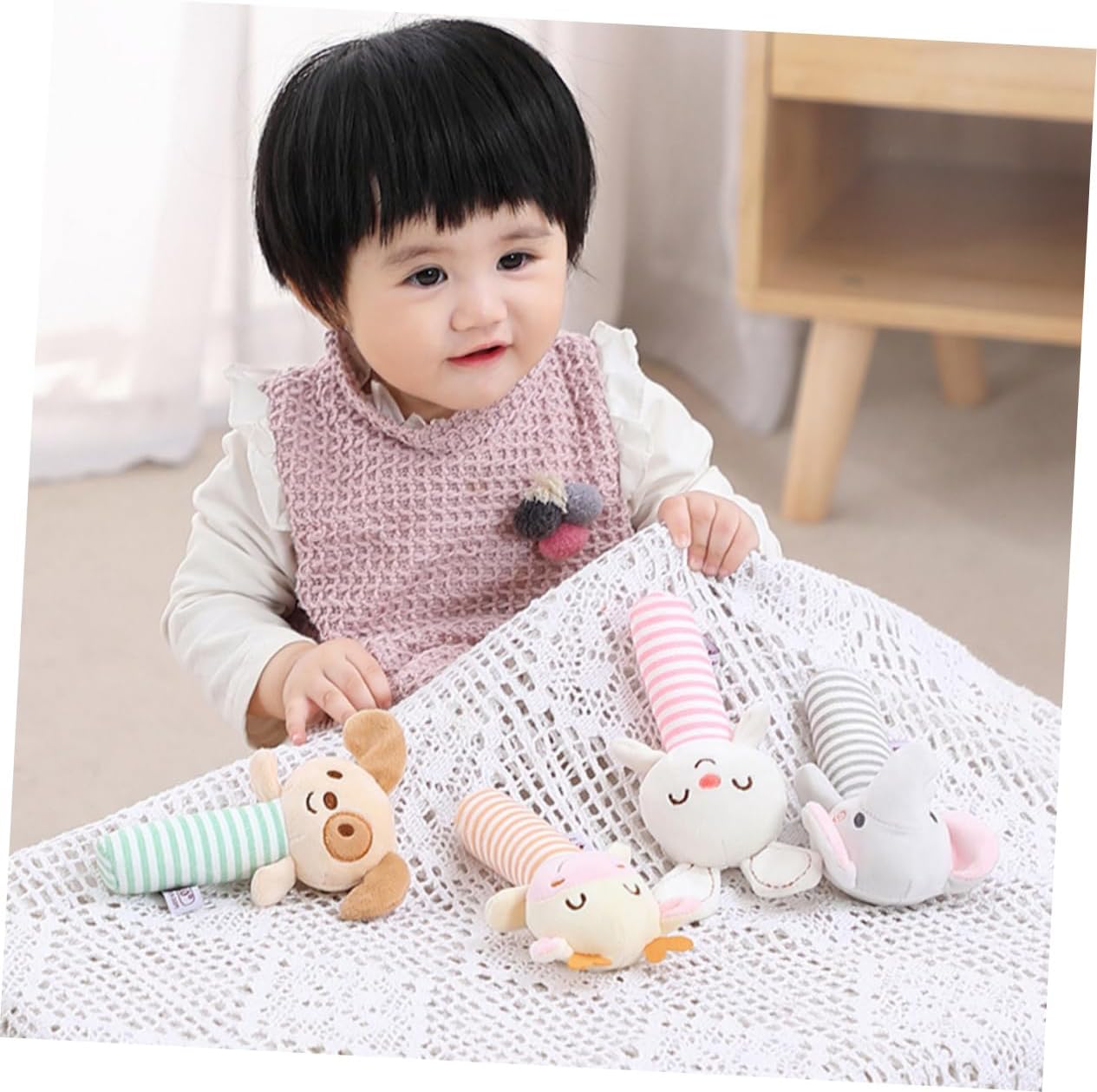 Giocattolo con campana da letto: leggero, di piccole dimensioni, facile da afferrare. Campanello per lettino: adatto a bambini di 0-3 anni che giocano. Giocattolo: sviluppo degli organi di senso del bambino, ottimo per la comunicazione genitore-figlio. Giocattoli: può anche essere un giocattolo educativo per aiutare lo sviluppo del bambino. Peluche per calmare: con un design dalla forma divertente, può accompagnare i tuoi bambini sempre e ovunque.
