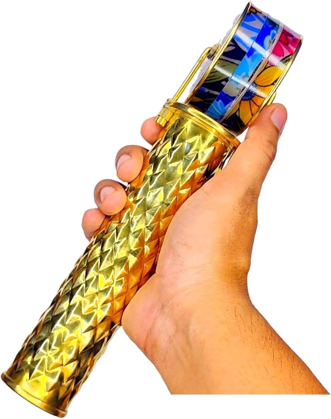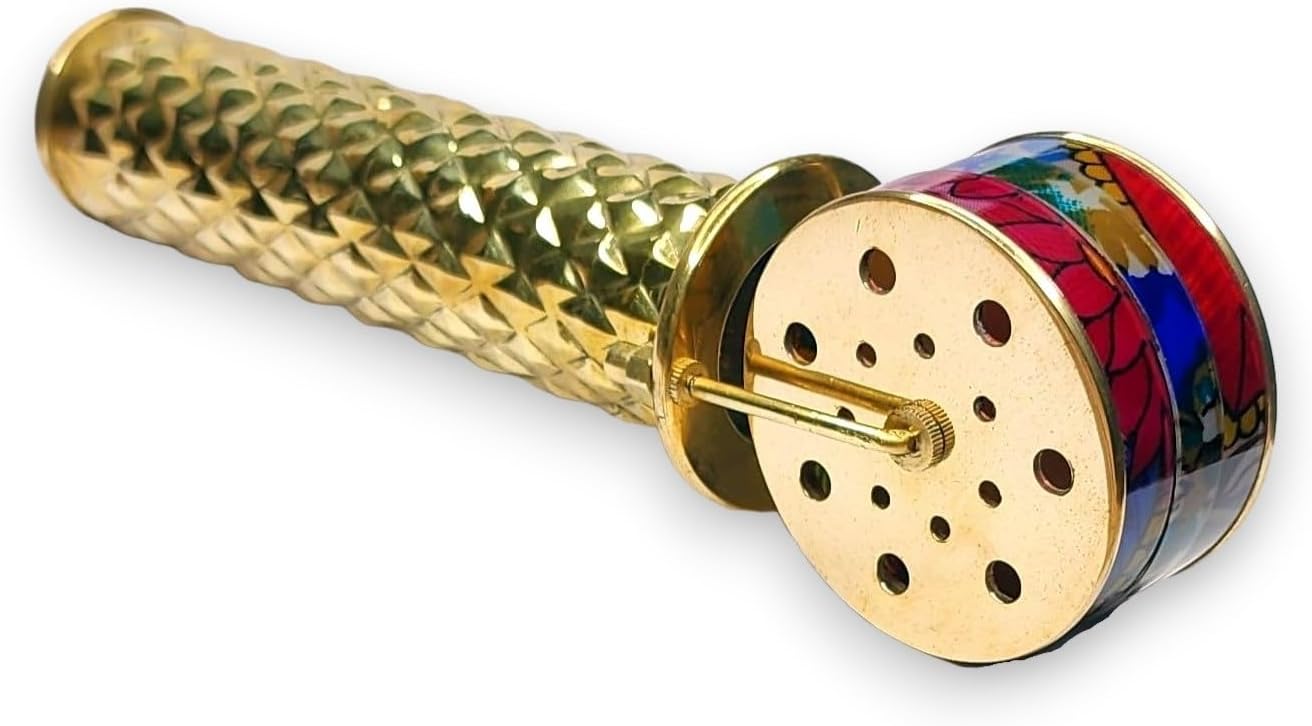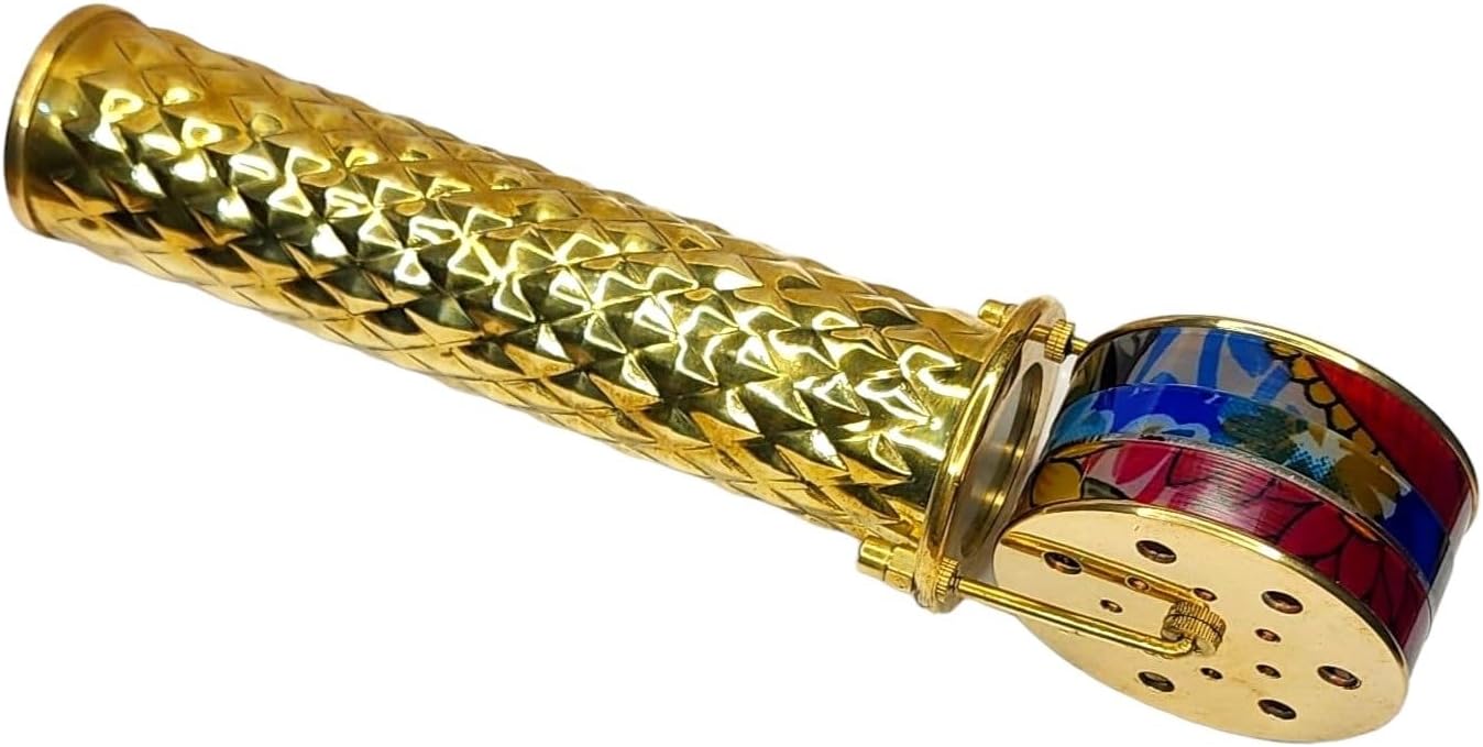 Scopri modelli affascinanti con questo elegante caleidoscopio in ottone con tre ruote uniche, ognuna aggiunge il proprio fascino al display visivo Scopri la perfetta miscela di arte e ingegneria con questo caleidoscopio in ottone, dove tre ruote sincronizzate creano un'armoniosa danza di luce e colore Illumina il tuo mondo con la bellezza radiosa di questo caleidoscopio in ottone, dotato di tre ruote che lavorano insieme per creare uno straordinario triplice incantesimo visivo. Le dimensioni di questo caleidoscopio sono 24,1 x 6,9 x 5,1 cm, realizzato in ottone