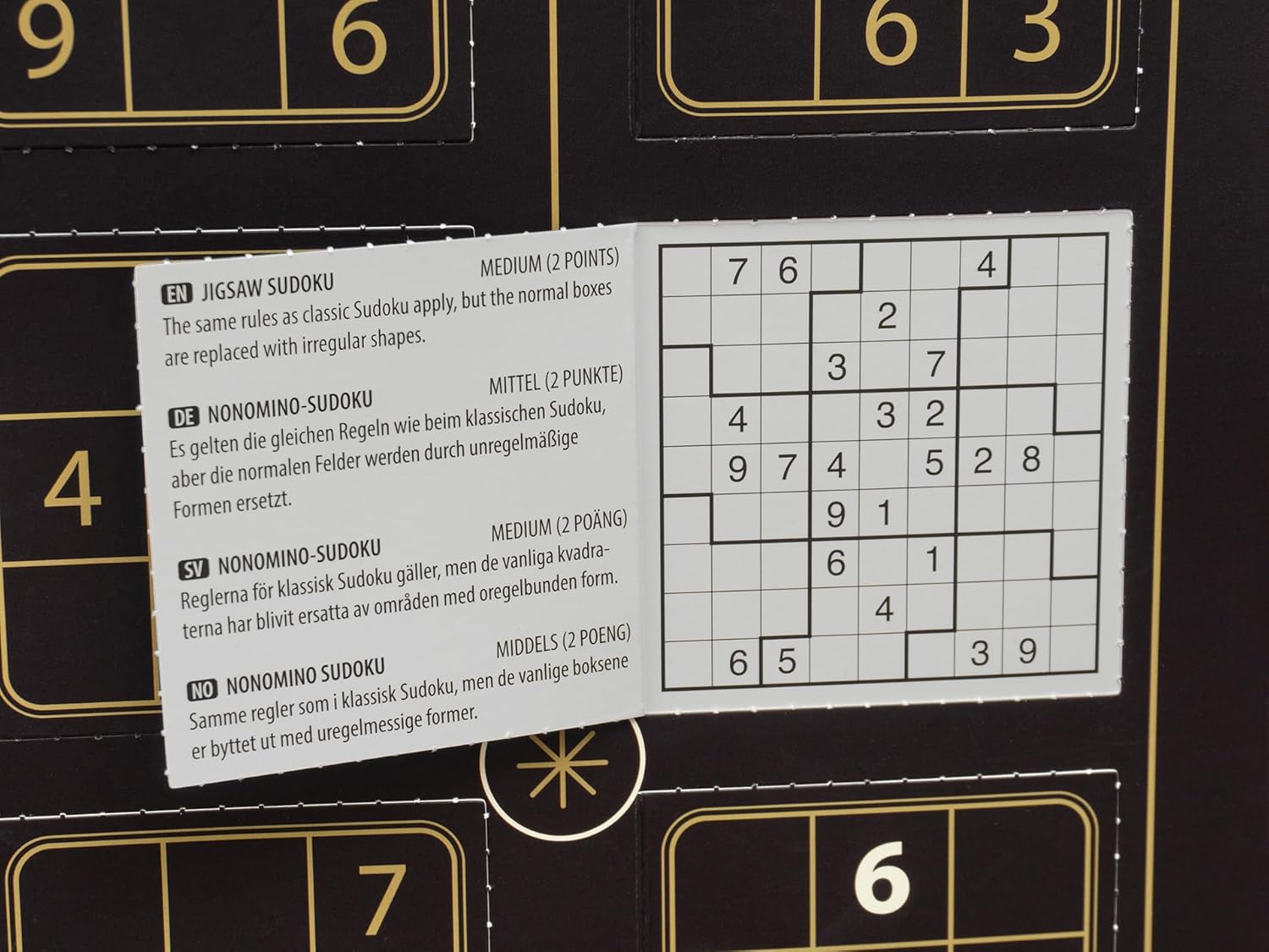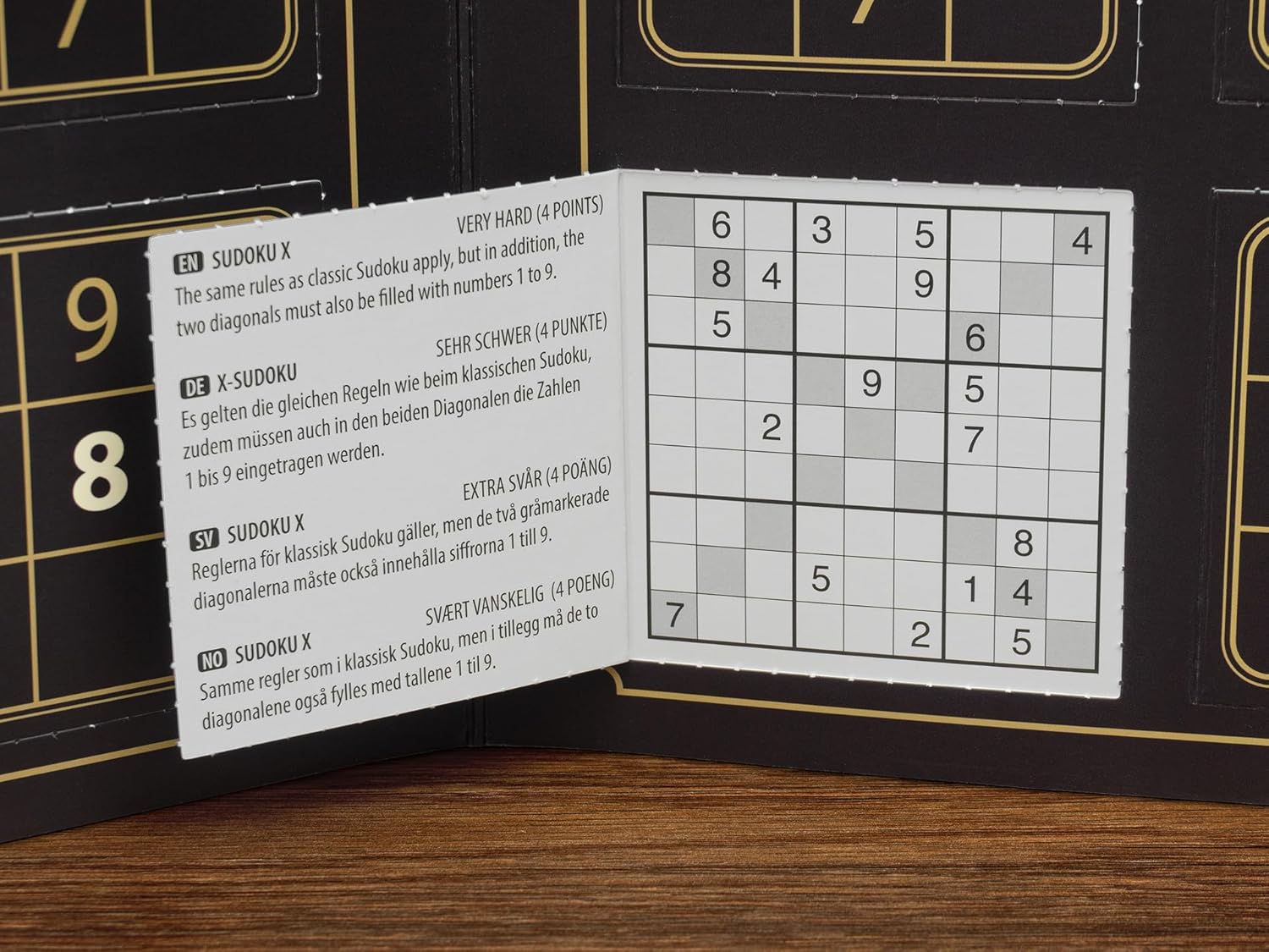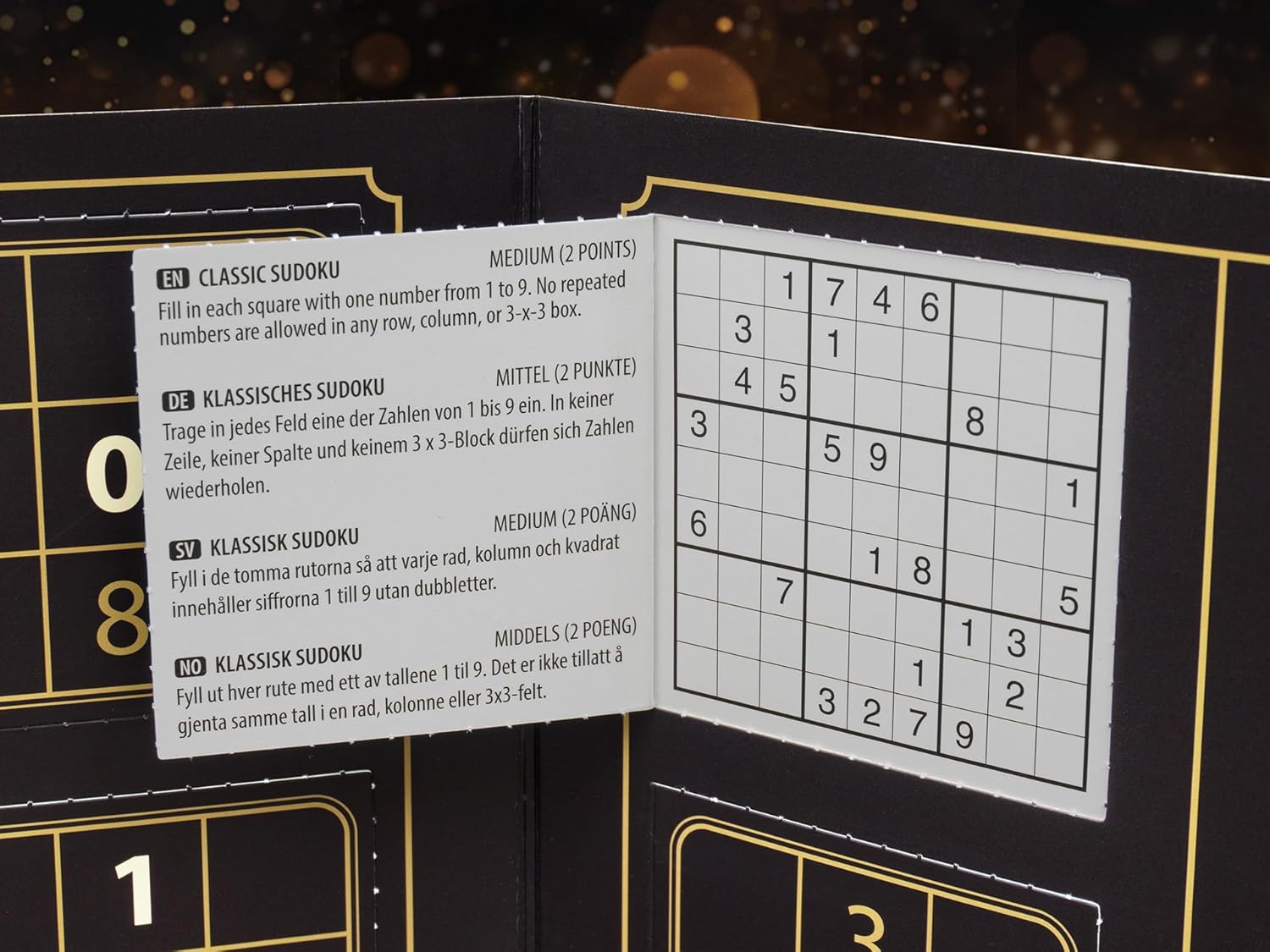 Dietro ogni porta di questo calendario dell'Avvento troverai un puzzle Sudoku. Il calendario contiene i classici puzzle Sudoku e anche varianti popolari come Killer Sudoku, Nonomino Sudoku e altri. Dietro le porte si trovano le istruzioni per le rispettive varianti. Per aggiungere significato al tuo divertente Sudoku di dicembre, abbiamo sviluppato un sistema di punti. L'obiettivo è ovviamente quello di raccogliere quanti più punti possibile risolvendo quanti più enigmi possibili. I puzzle risolti correttamente ti fanno guadagnare 1, 2, 3 o 4 punti a seconda del livello di difficoltà. Alla vigilia di Natale, è il momento di controllare il tuo punteggio e vedere se meriti una medaglia. I puzzle sono dell'esperto autore di puzzle Andrew Stuart, i cui sofisticati puzzle e varianti di Sudoku sono stati pubblicati da molti anni sui principali giornali e libri di puzzle. Tutti i puzzle hanno un'unica soluzione logicamente deducibile. Anche se le soluzioni degli enigmi più difficili possono sembrare oscure, tutti gli enigmi possono essere risolti in modo puramente logico e senza indovinare. Se finora non hai risolto molti Sudoku, potresti non riuscire a fare alcun progresso con i puzzle particolarmente difficili, ma non preoccuparti, probabilmente ci sarà un puzzle più semplice che ti aspetterà il giorno successivo. E se sei un vero fan del Sudoku, potresti risolvere i puzzle facili in pochissimo tempo e, si spera, trovare quelli difficili più interessanti.