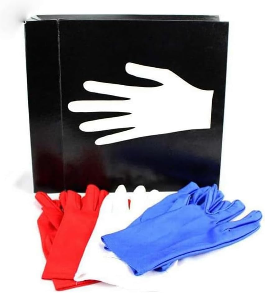 Il mago mostra entrambe le mani sulle quali indossa guanti blu e una borsa su cui si vede una mano rossa. Caratteristiche: Scomparire, Imparare, Facile da eseguire, Principiante, Mago, Strada, Palcoscenico Un cambio rapido multiplo con i guanti! Gli oggetti di scena sono pieghevoli e portatili. Si ripiega, funziona alla grande!!