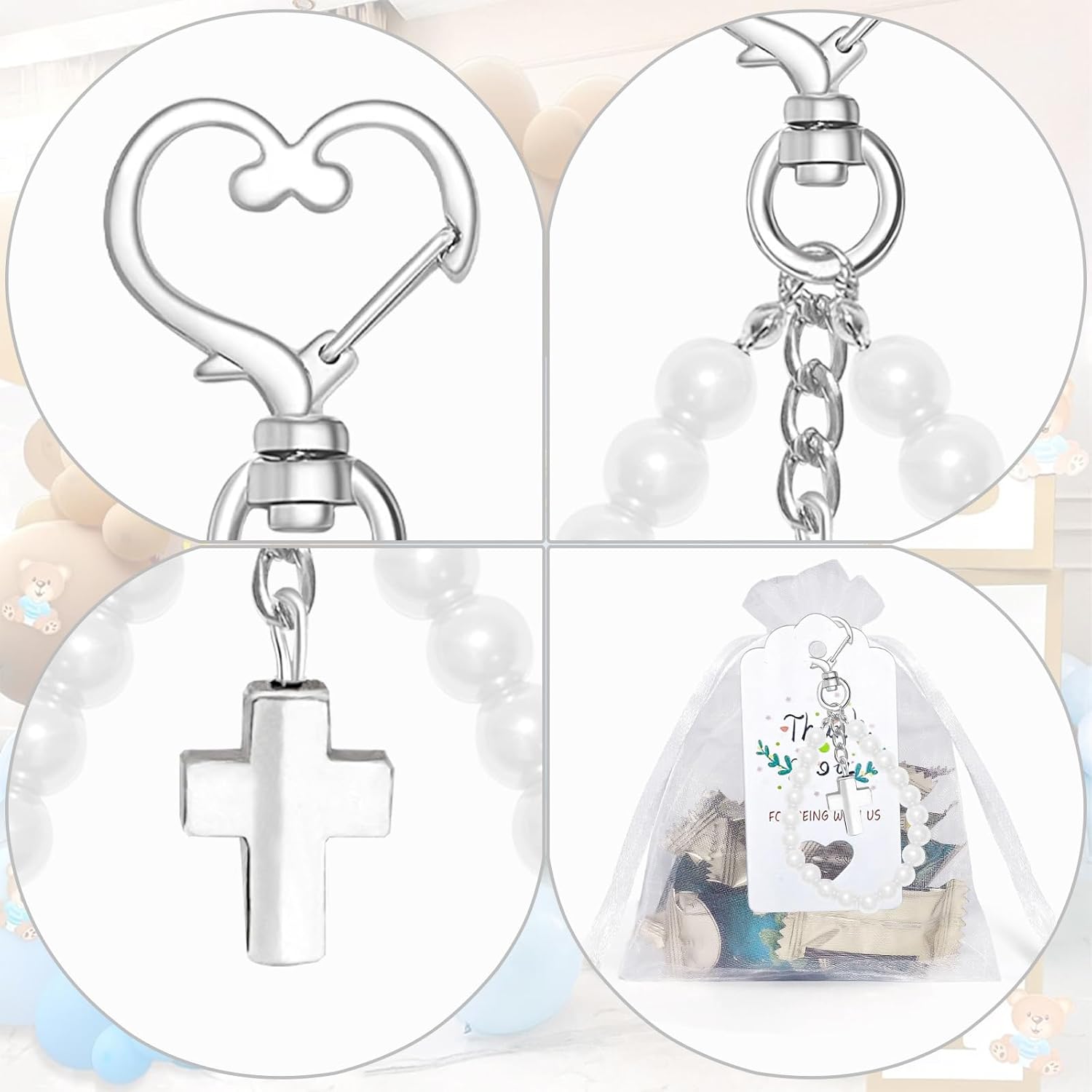 Il set regalo per battesimo include braccialetto con perline a forma di croce, portachiavi, borse e biglietti per baby shower e regali per battesimo