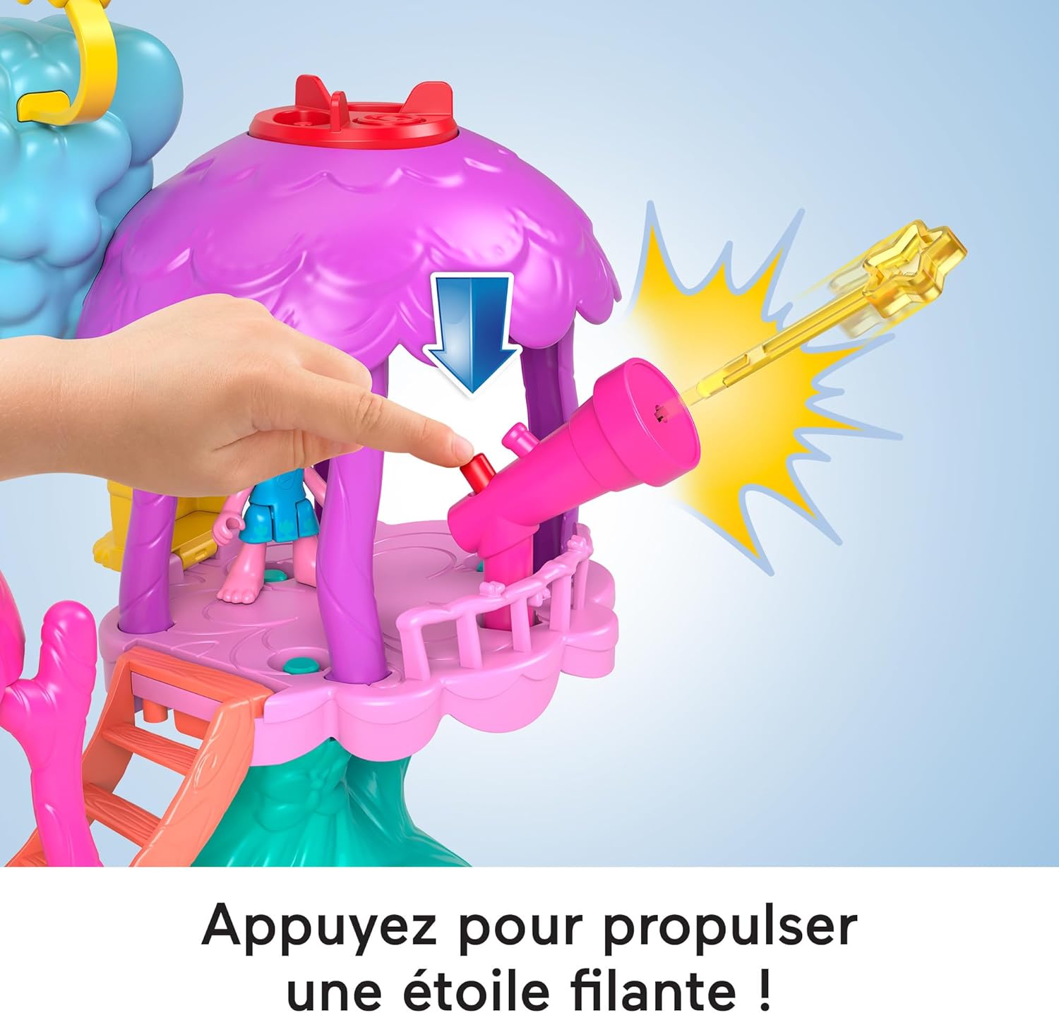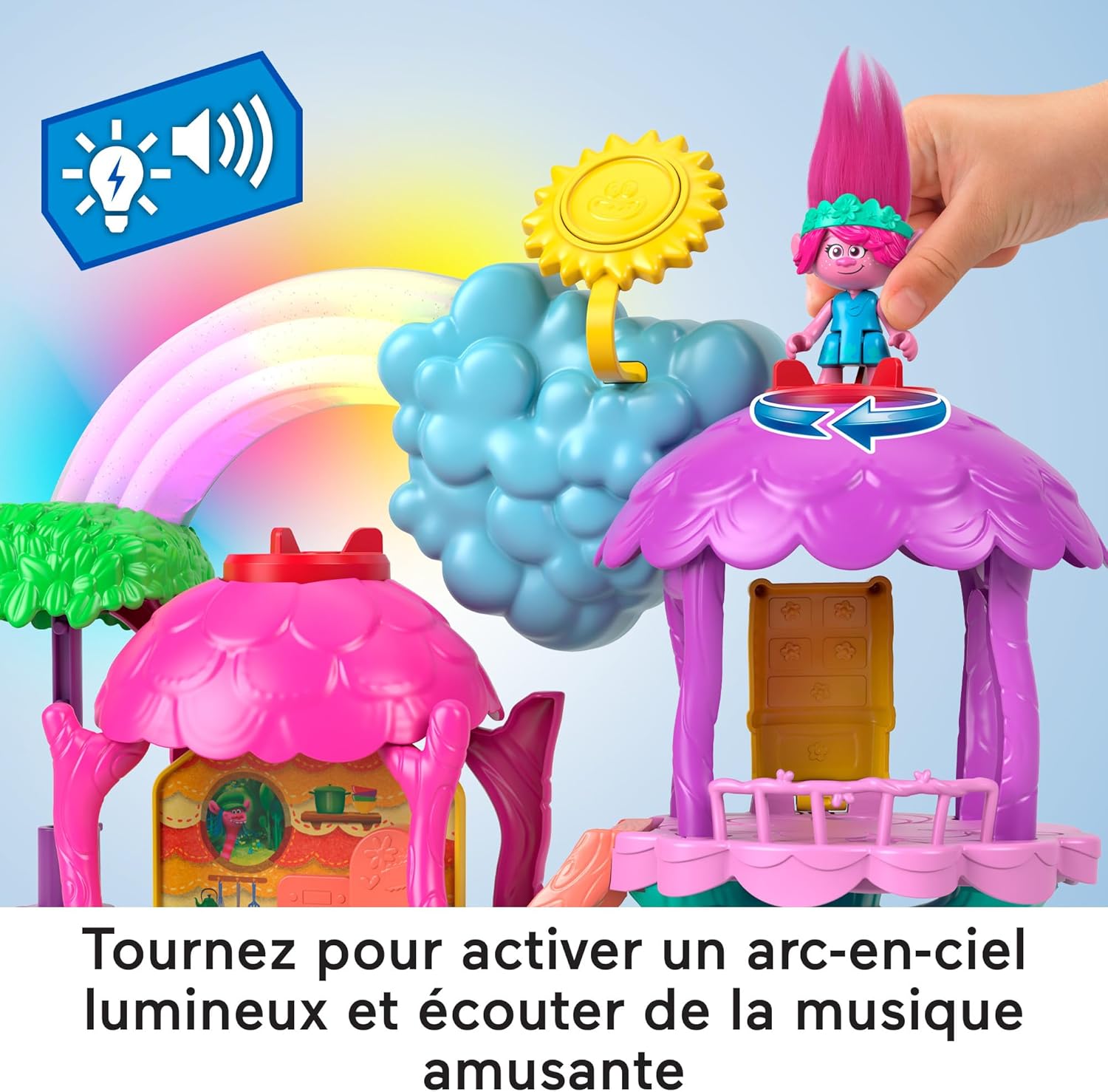 I bambini dai 3 agli 8 anni potranno immaginare storie divertenti con questa casa sull'albero che produce luci e suoni ispirati ai film dei Trolls. Gira il disco di attivazione nella stanza viola per accendere la musica e le luci dell'arcobaleno. Gira il disco di attivazione sulla stanza rosa per trasformare la cucina di Poppy in un laboratorio. Molti spazi di gioco: 2 lanciatori di proiettili, 1 ascensore a spirale per portare Poppy su e giù, 1 stanza delle feste segrete, 1 letto che si trasforma in una cassettiera Include 1 figura articolata di Poppy con morbidi capelli, 1 lanciatore e 2 proiettili, 4 accessori; incoraggia l'immaginazione e la creazione di storie