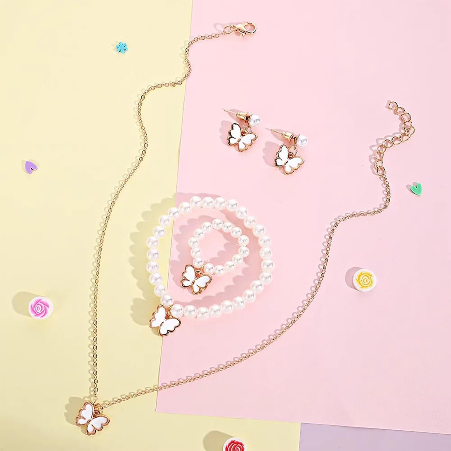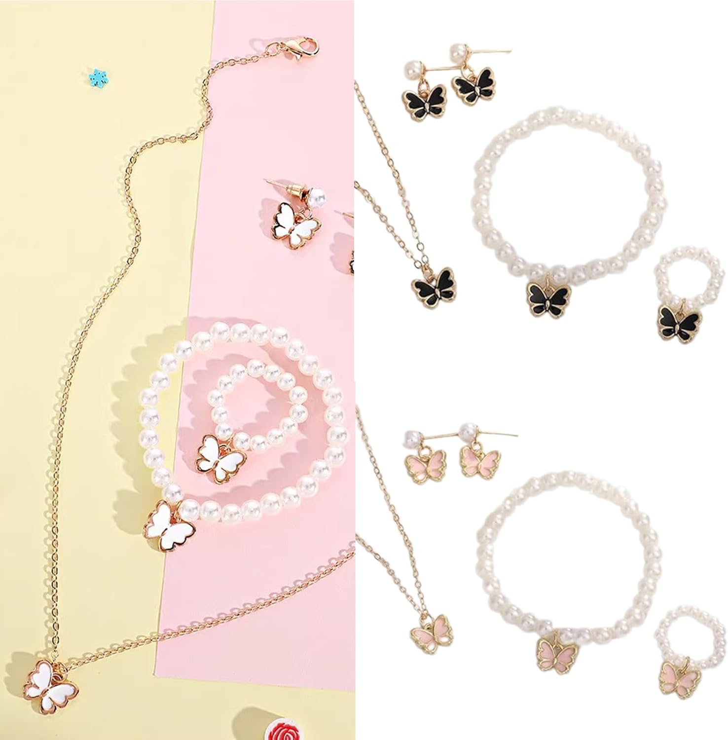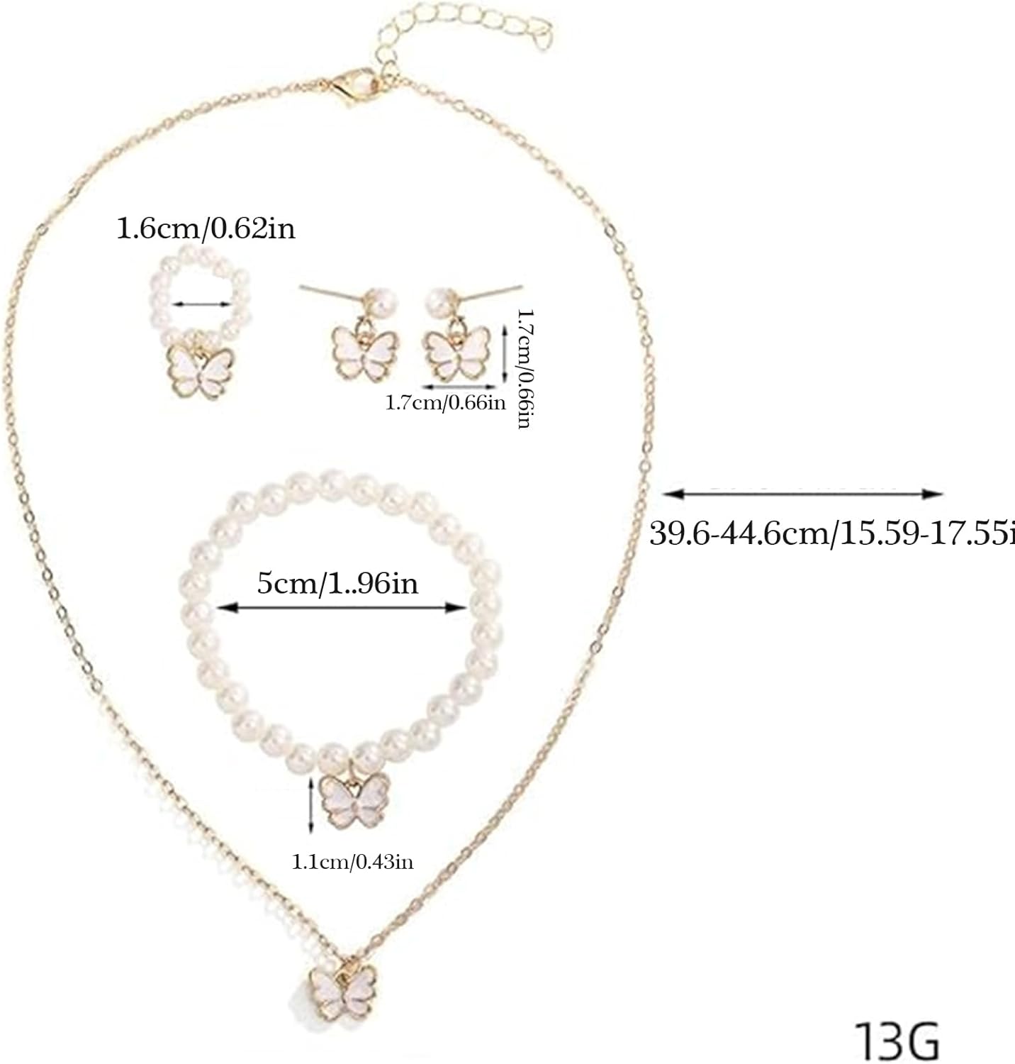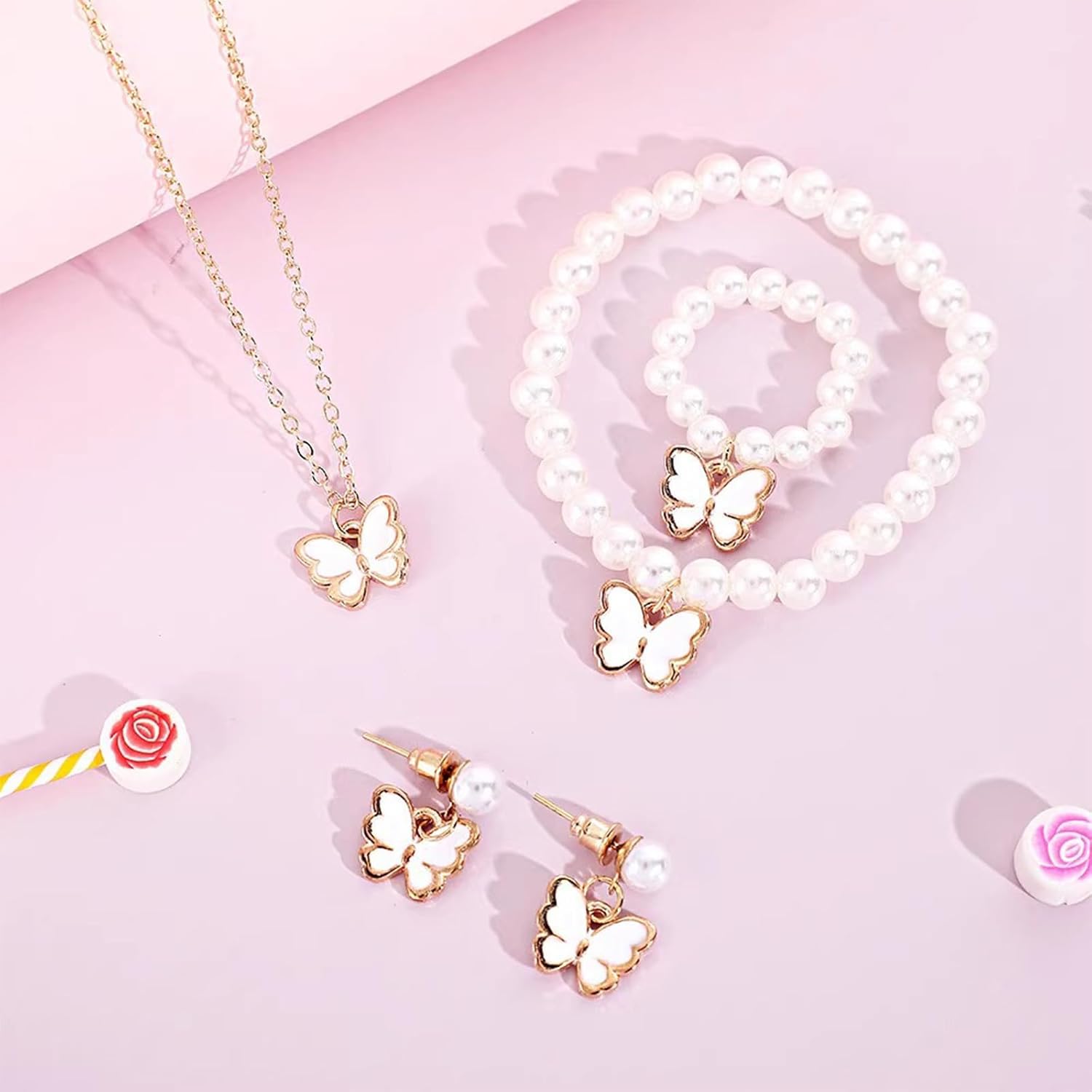 Set gioielli per perle perle alla set farfalla imitazione perle set per l'evento speciale delle bambine Caratteristiche: Questo set gioielli dolci da 4 pari presenta un eccellente ciondolo farfalla e collana perle, orecchini, e bracciale perle, progettati per aggiungere un tocco eleganza e creatività a qualsiasi outfit. Realizzato con materiali robusti, set gioielli è sicuro e comodo da indossare, con design farfalle unici che distinguono. Progettato specificamente per le ragazze, questo set rivolge loro desiderio accessori belli e alla Adatto a feste compleanno, celebrazioni festive e riunioni famiglia, questo set gioielli assicura che bambino diventi centro attenzione Migliora stili tuo figlio con questo elegante set gioielli, perfetto per aggiungere un tocco elegante alla sua collezione accessori. Specifiche: Componente: perle imitazione, lega Lunghezza della collana: 39,6 ~ 44,6 cm/15,59 ~ 17,55 pollici Diametro del bracklet: 5 cm/1,96 pollici Diametro degli 1,6 cm/0,62 pollici Dimensione degli orecchini: 1,7x1,7 cm/0,66x0,66 pollici Colore: /bianco pacchetto include: Set gioielli per perle farfalla 1set Nota: prega consentire l'errore 1-2 cm a causa della misurazione manuale. Assicurati non preoccuparti prima un'offerta. A causa della differenza tra diversi monitor, l'immagine potrebbe non riflettere colore effettivo articolo Grazie!