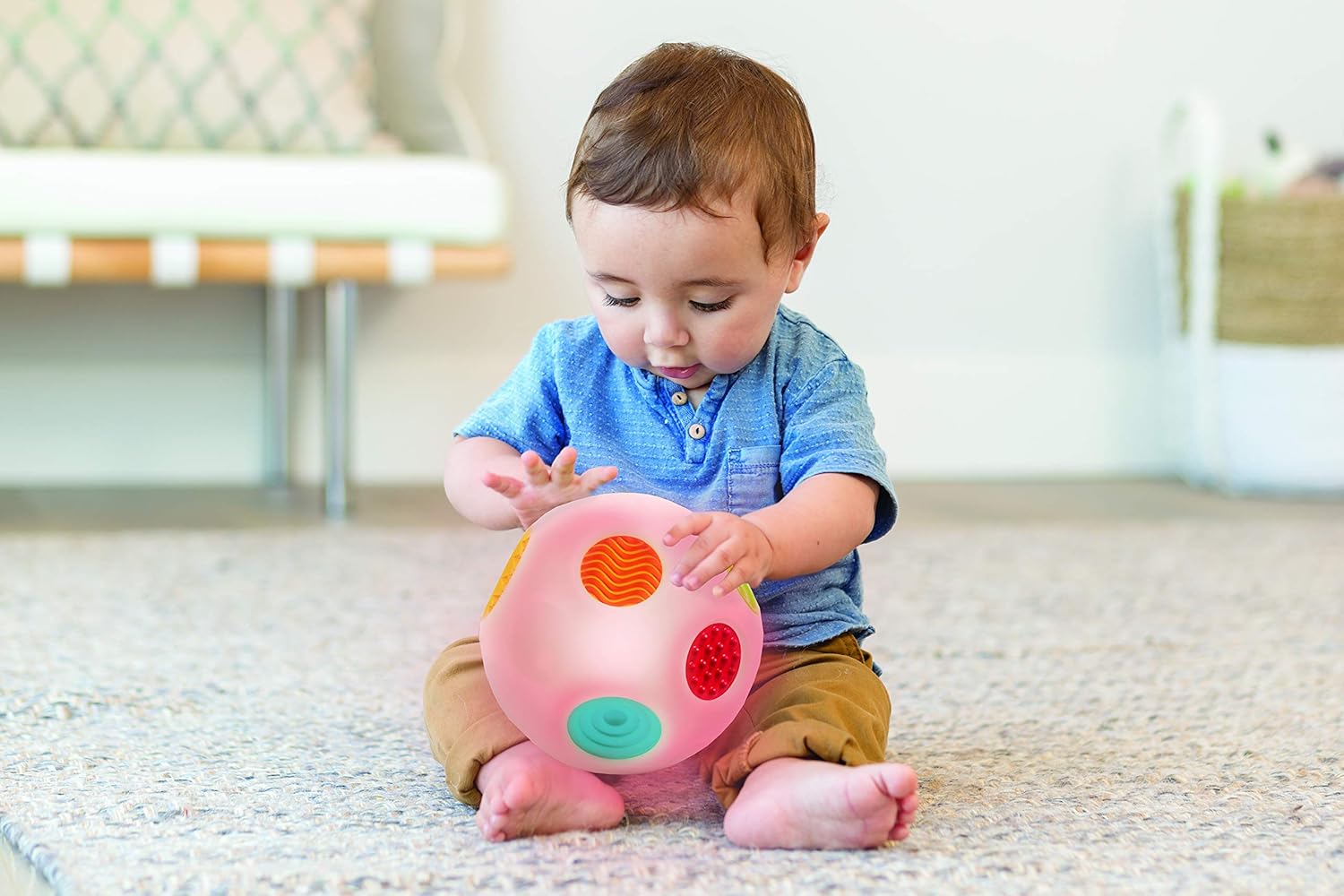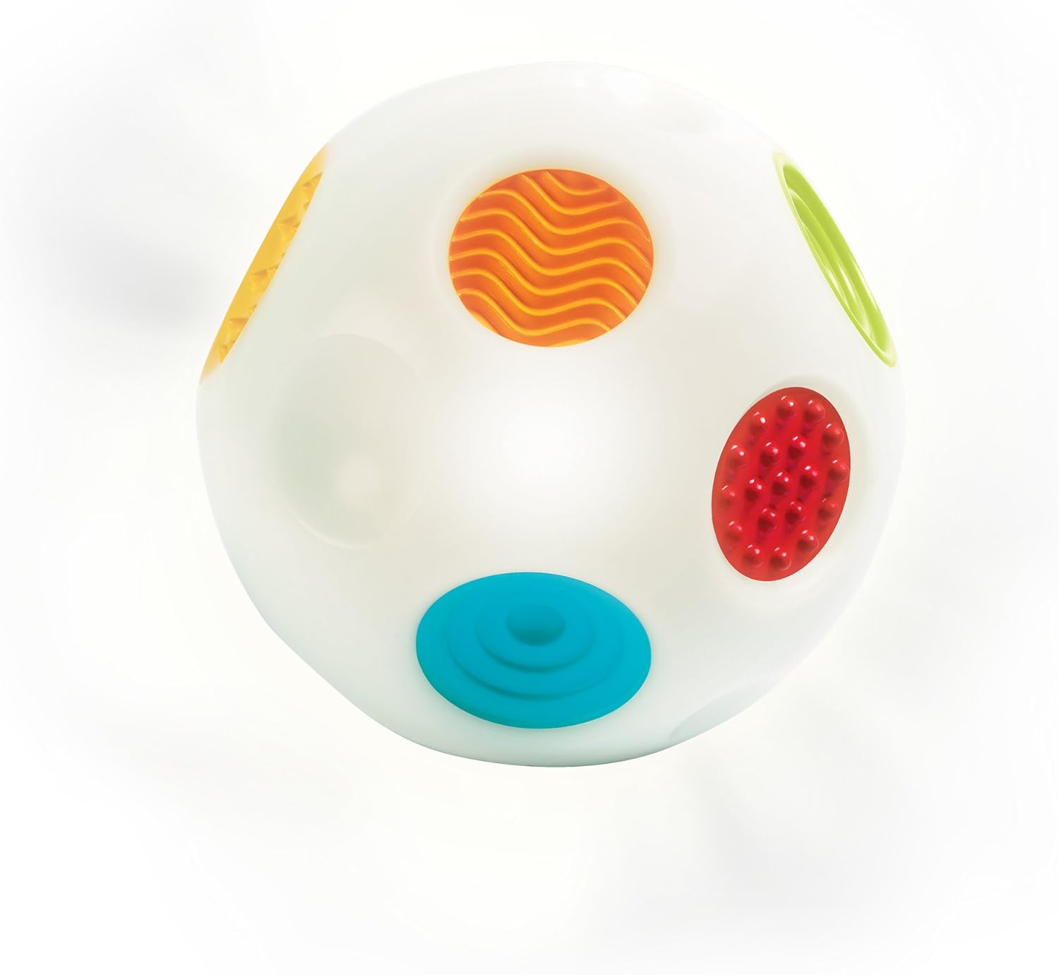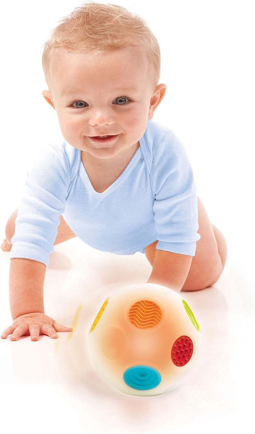 Il bambino amerà maneggiare questa palla, lanciarla e farla rotolare Il volume e la scelta delle melodie è regolabile Contenuto didattico, melodie e canzoni elaborate in Francia NOTA: sostituire le batterie e non utilizzare batterie ricaricabili 4 melodie accattivanti, 7 colori e luci, 6 texture da scoprire Questa palla morbida, sonora e luminosa permette di imparare i colori nella musica