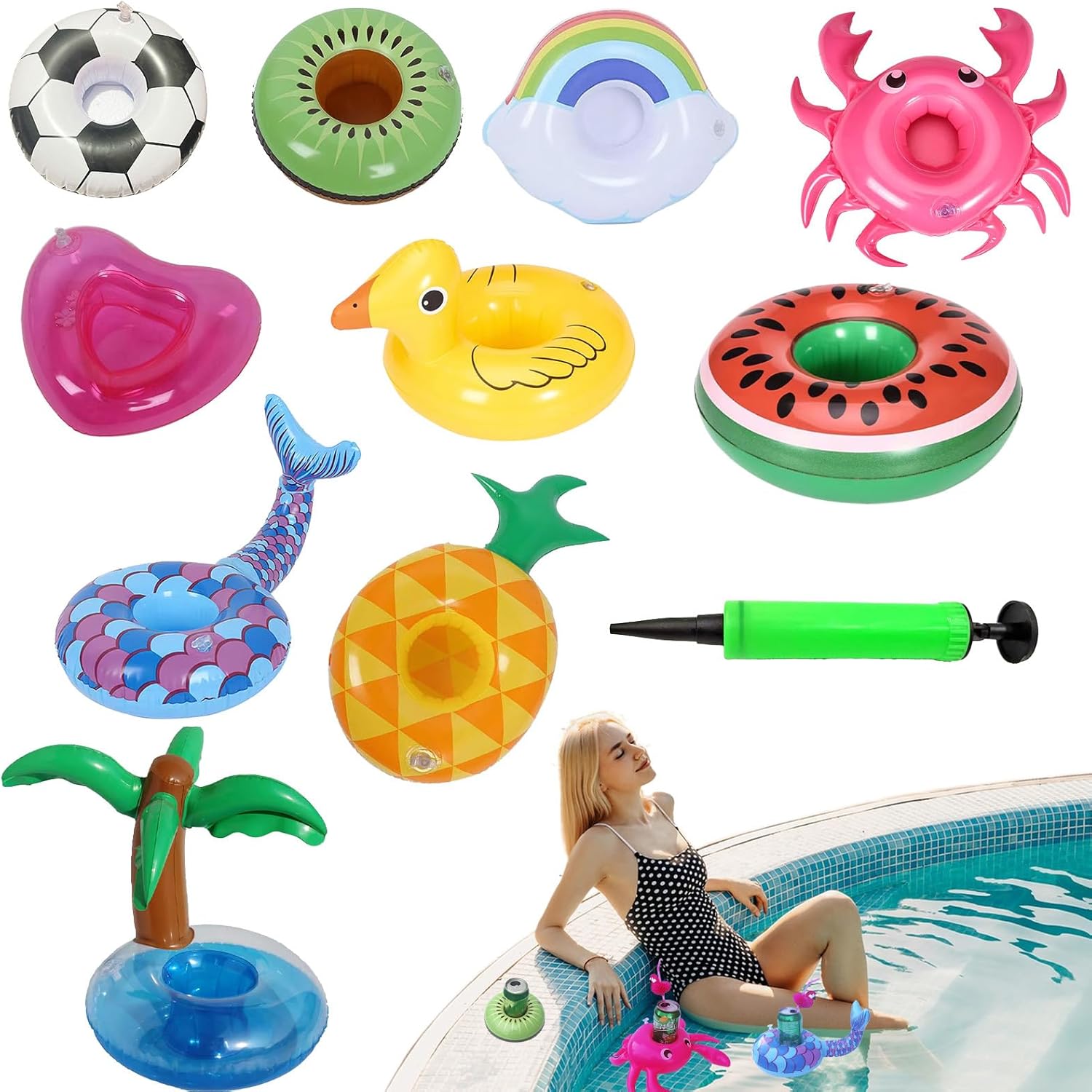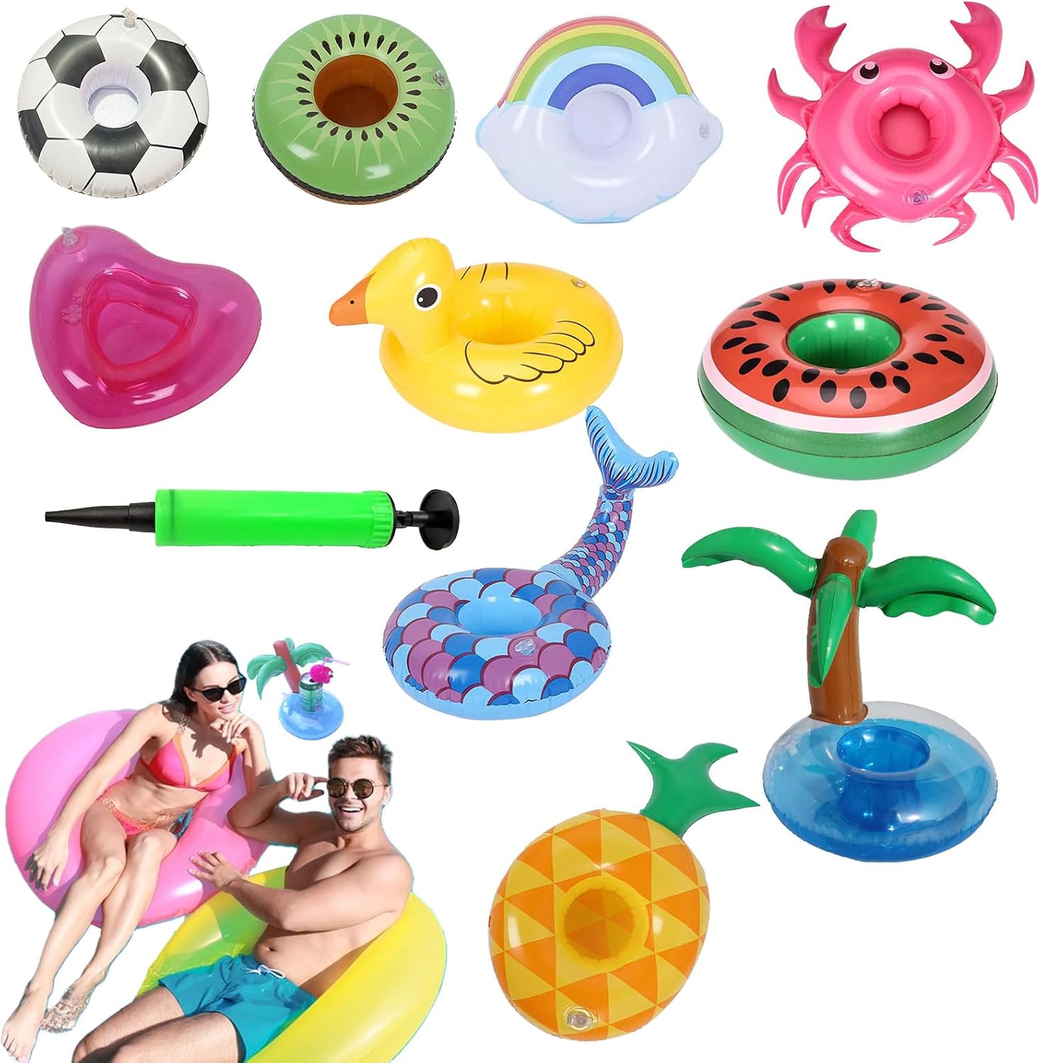 Improved Visual Appeal: Designed in playful pineapple and watermelon tree forms, this inflatable drink holder is ideal for pools or lakes, enriching your water experience with its fun and imaginative design elements Effortless Assembly: Designed with an easy inflation system, this PVC cup holder provides fast setup and deflation, alongside steady support for cups of different sizes, ensuring travel-friendly convenience Ideal Pool Companion: Ideal for pools, lakes, and leisure settings, the inflatable drink holder features sealed air chambers to keep cups afloat, ensuring drinks remain clean and easily accessible during relaxation Skin-friendly Material: Crafted from high-elasticity PVC with multi-layer bonding, this inflatable drink holder resists punctures, prevents leaks, and assures long-lasting use without deformation for trusty performance in various settings Wide Range of Uses: Supports versatile use in outdoor and aquatic settings, securing drinks neatly and conveniently for family fun, picnics, and celebrations without compromising usability