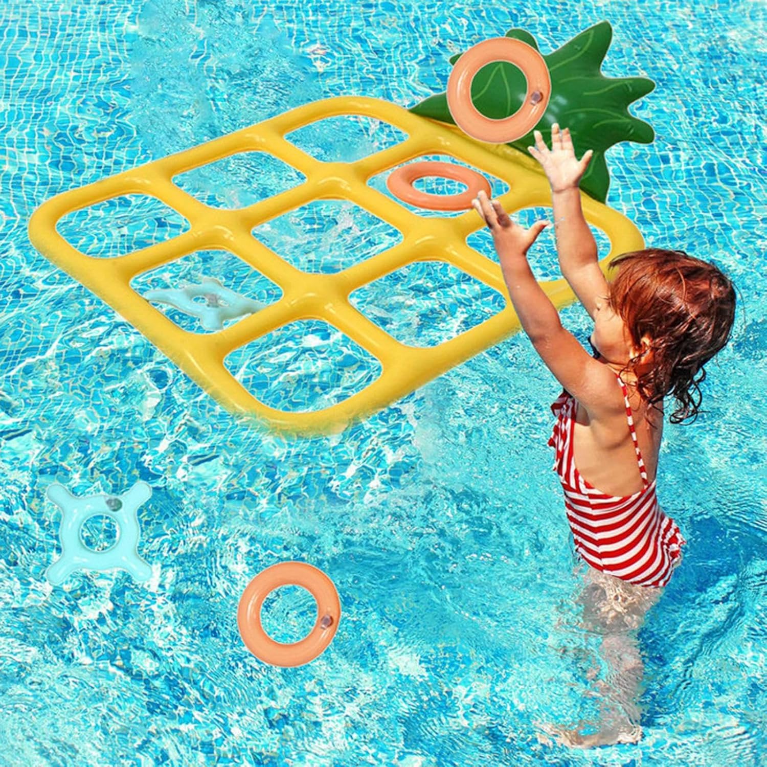 Floating Pineapple-Shaped Toss Board Design: Uniquely shaped like a pineapple, this colorful inflatable toss board floats on aqua and adds tropical to your pool, providing a visually engaging and fun game center for all ages Includes Toss Rings for Interactive Play: Comes with lightweight toss rings that are easy to grip and throw, making it a perfect game for kids, teens, and adults to compete and bond while cooling off in the pool or at a backyard aqua party Sturdy PVC Material for Long-Lasting Fun: Crafted from high-quality, puncture-resistant PVC that stands up to splashing, jumping, and repeated use in the pool—ideal for poolside entertainment that lasts all summer Easy to Inflate and Deflate for Portability: Inflates quickly with standard air pumps and deflates flat for convenient storage or travel; take it to beach trips, lake outings, or vacations for instant entertainment anywhere there's aqua Great for Pool Parties and Family Gatherings: This inflatable toss game encourages group play, hand-eye coordination, and —making it a must-have accessory for pool parties, birthday celebrations, and outdoor gatherings