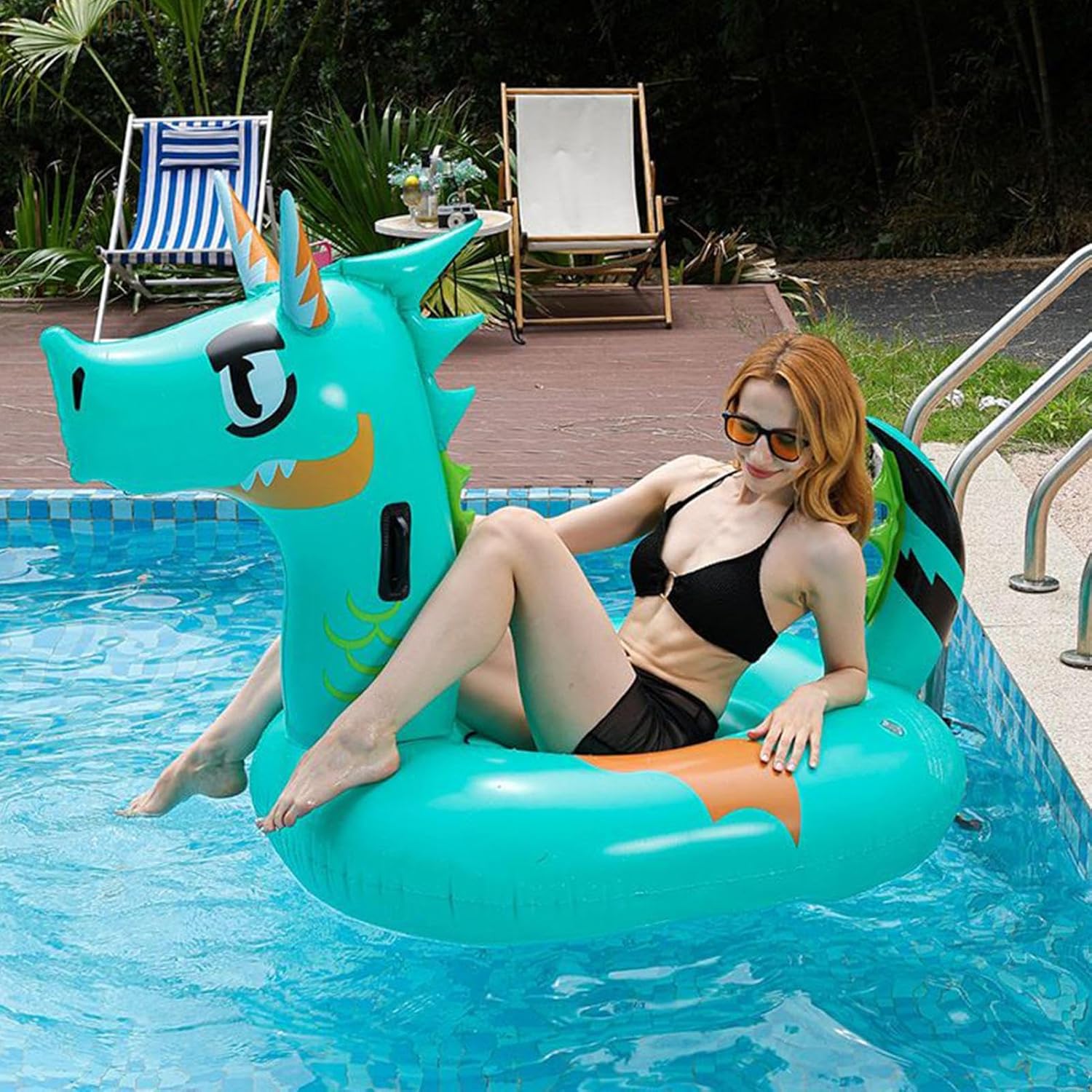 cGiant dragon inflatable pool float made from 0.4 mm thickened PVC material for durability and buoyancy: perfect for kids and adults enjoying pool time, lake days, or summer beach adventures Generous size at 68.9x43.31x35.43 inches comfortably supports lounging or play: features a fun dragon design that doubles as both a toy and a striking party decoration Easy to inflate and deflate for quick setup and storage: ideal for outdoor use in rivers, pools, or beaches and convenient to pack for vacations, summer outings, or backyard celebrations Stable and ergonomic shape functions as a lounge chair or floaty seat: supports relaxing sunbathing, light paddling, or poolside chilling while adding a playful element to water fun Great for themed pool parties, birthday events, or family gatherings: adds excitement to summer games and makes a perfect gift for kids, teens, or anyone who loves unique inflatables