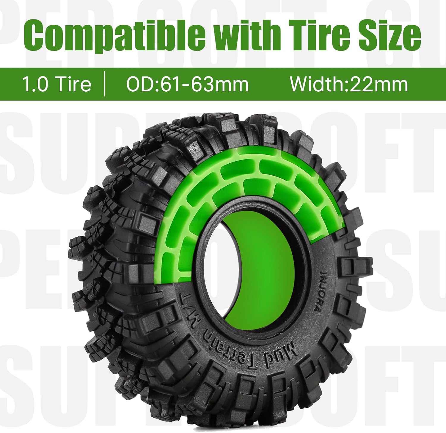 Nota: a causa delle differenze di spessore delle pareti dei pneumatici tra le varie marche, la compatibilità con i pneumatici non INJORA non è garantita. Si prega di verificare la compatibilità prima dell'acquisto. Compatibile con questi pneumatici INJORA: 62*20.5mm Kraken Claw YQT-1007. Realizzato con materiali in gomma siliconica, impermeabile e resistente alle temperature. Supporto laterale più superbo rispetto alla schiuma normale per mantenere la forma dei pneumatici. Diametro esterno del pneumatico: circa 61-63 mm, larghezza del pneumatico: circa 20-22 mm, come 62*22 mm King Trekker YQT-1014