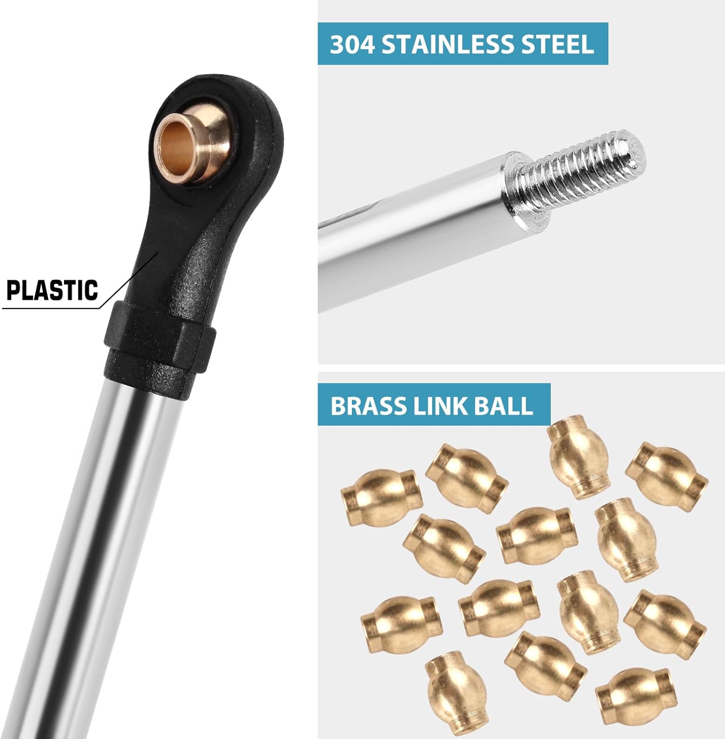 Realizzato in acciaio inossidabile 304 di alta qualità, garantisce una lunga durata per il tuo cingolato TRX4M. Le estremità dell'asta in plastica e le sfere di collegamento in ottone migliorano le prestazioni per l'auto RC. Con un peso di soli 37g (1,31 once), aggiungi un peso minimo al tuo crawler RC. Progettato per sostituire i collegamenti di serie del TRX4M, fornisce un adattamento diretto, rendendo l'installazione rapida e senza problemi. Vestito per TRX4M Upgrade 1/18 RC Crawler.