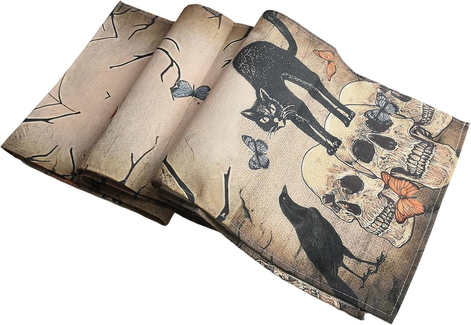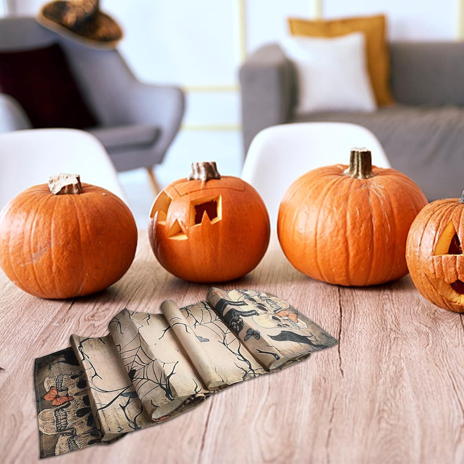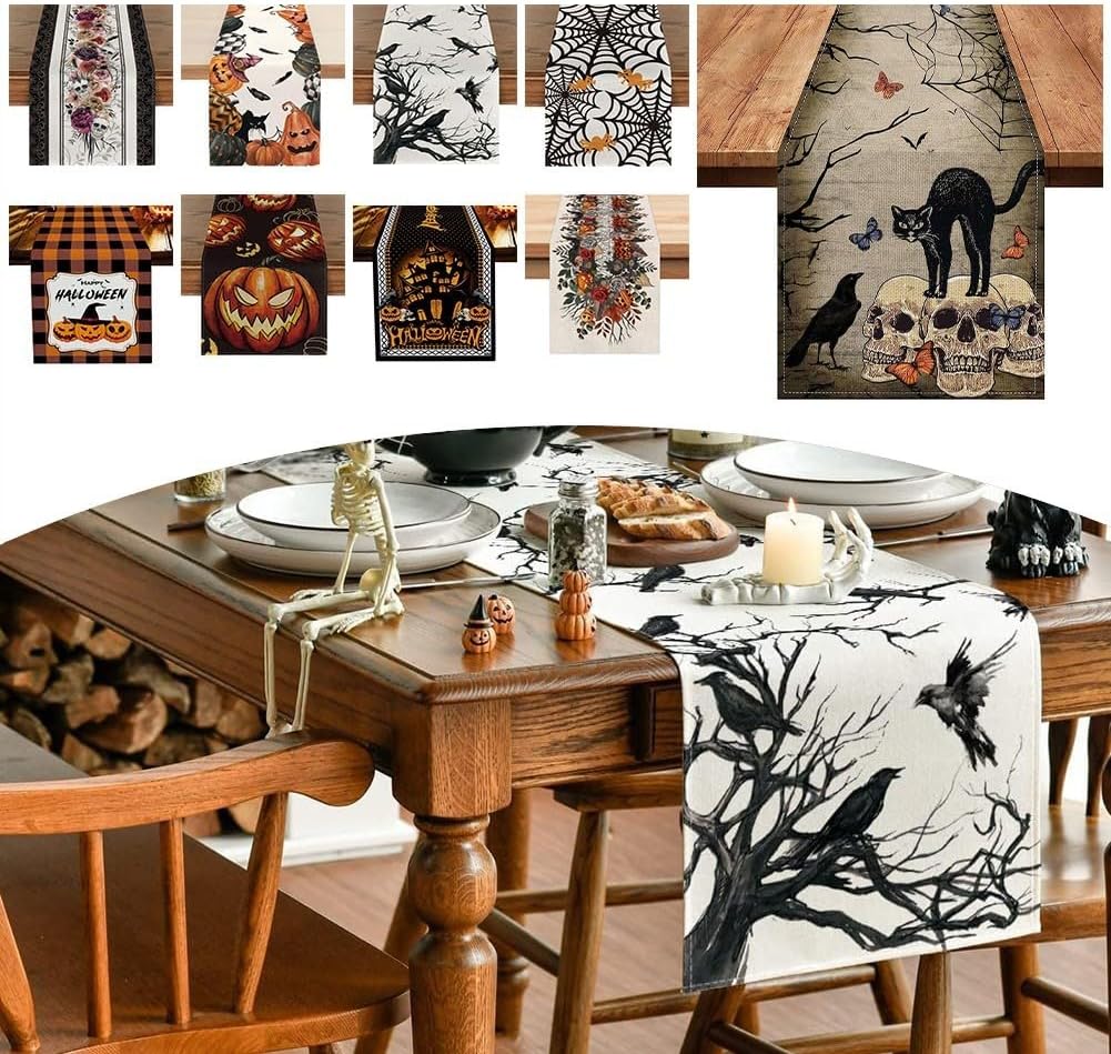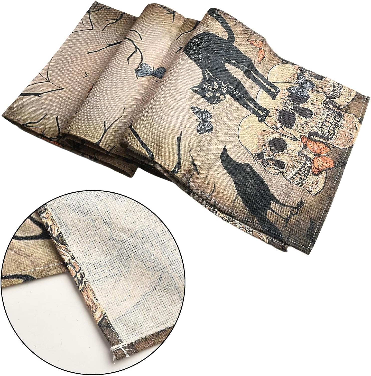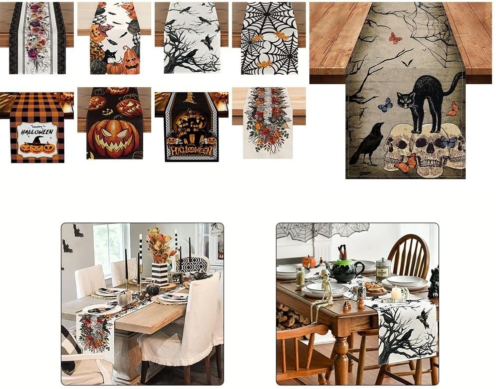 Materiale robusto: realizzato in lino per un uso durevole. DIMENSIONE PERFETTA: il runner da tavolo ha le dimensioni perfette (13" x 90") per decorare la maggior parte dei tavoli. Design spaventoso di Halloween: la tovaglia presenta uno spettrale design di Halloween con case infestate e gnomi, che combina i classici colori di Halloween per creare un'atmosfera fresca e horror. Decorazione versatile: non solo può essere utilizzata come tovaglia per decorare i tavoli da pranzo, ma può anche essere appesa come sfondo alla parete. Perfetto per decorazioni domestiche di Halloween e decorazioni per feste. Facile da usare: il runner da tavolo di Halloween è leggero e facile da montare, rendendolo un pezzo pratico ed essenziale per il tuo evento di Halloween.