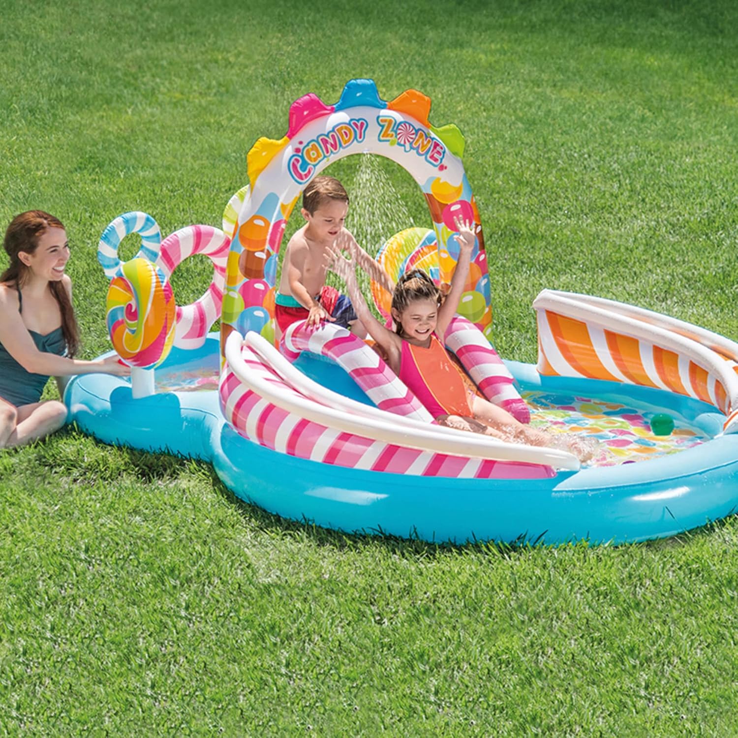 Misure 295 x 191 x 130 cm, leggero e maneggevole Spessore di 0.35 mm, splendido e coloratissimo playcenter con spruzzino, 6 palline di plastica colorate e 2 lollipop in PVC La confezione contiene kit di riparazione age_mfg_maximum: 1188.0