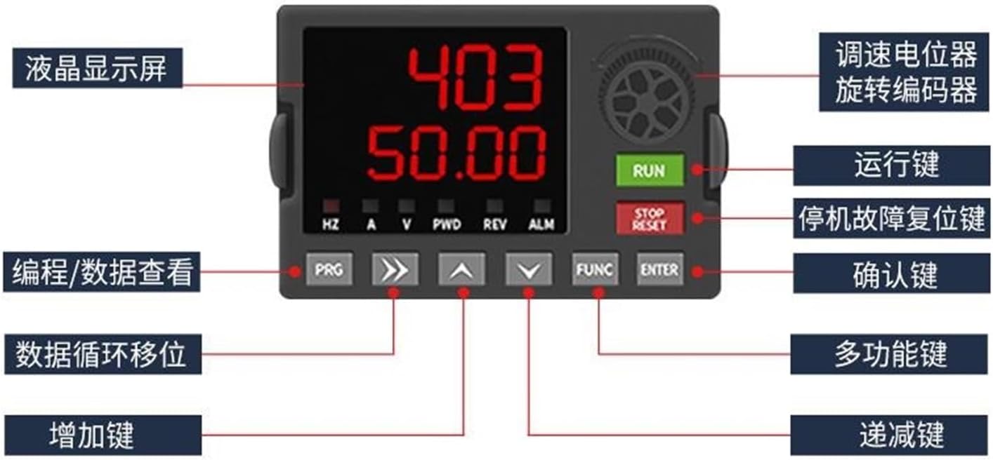 Ampia applicazione: questo inverter può essere utilizzato per apparecchiature di controllo della velocità come router CNC, macchine utensili CNC, fresatrici, trapani, divaricatori, miscelatori, estrusori, taglierine, avvolgitori, compressori, ventilatori, pompe, smerigliatrici, nastri trasportatori, elevatori, centrifuga, ecc Lega di alluminio e materiale PC: questo inverter è realizzato in lega di alluminio e materiale PC, la lega di alluminio ha una buona conduttività per garantire le prestazioni dell'inverter e il materiale PC è ignifugo per garantire la sicurezza dell'inverter Display digitale intelligente: questo inverter adotta un design della tastiera umanizzato, con layout ragionevole e facilità d'uso; display digitale, intuitivo e chiaro. Il design staccabile è comodo per il controllo remoto Dissipatore di calore extra large: questo inverter ha un grande dissipatore di calore con una piccola ventola, che è circa 3 volte più grande del dissipatore di calore di prodotti simili, e la piccola ventola garantisce un basso rumore e allo stesso tempo favorisce una buona dissipazione del calore Funzionamento multivelocità e oscillazione: questo inverter ha 16 segmenti di controllo della velocità multisegmento programmabile e più modalità operative tra cui scegliere. Il funzionamento della frequenza del pendolo ha frequenza preimpostata, frequenza centrale regolabile, memoria di stato e ripristino dopo un'interruzione di corrente