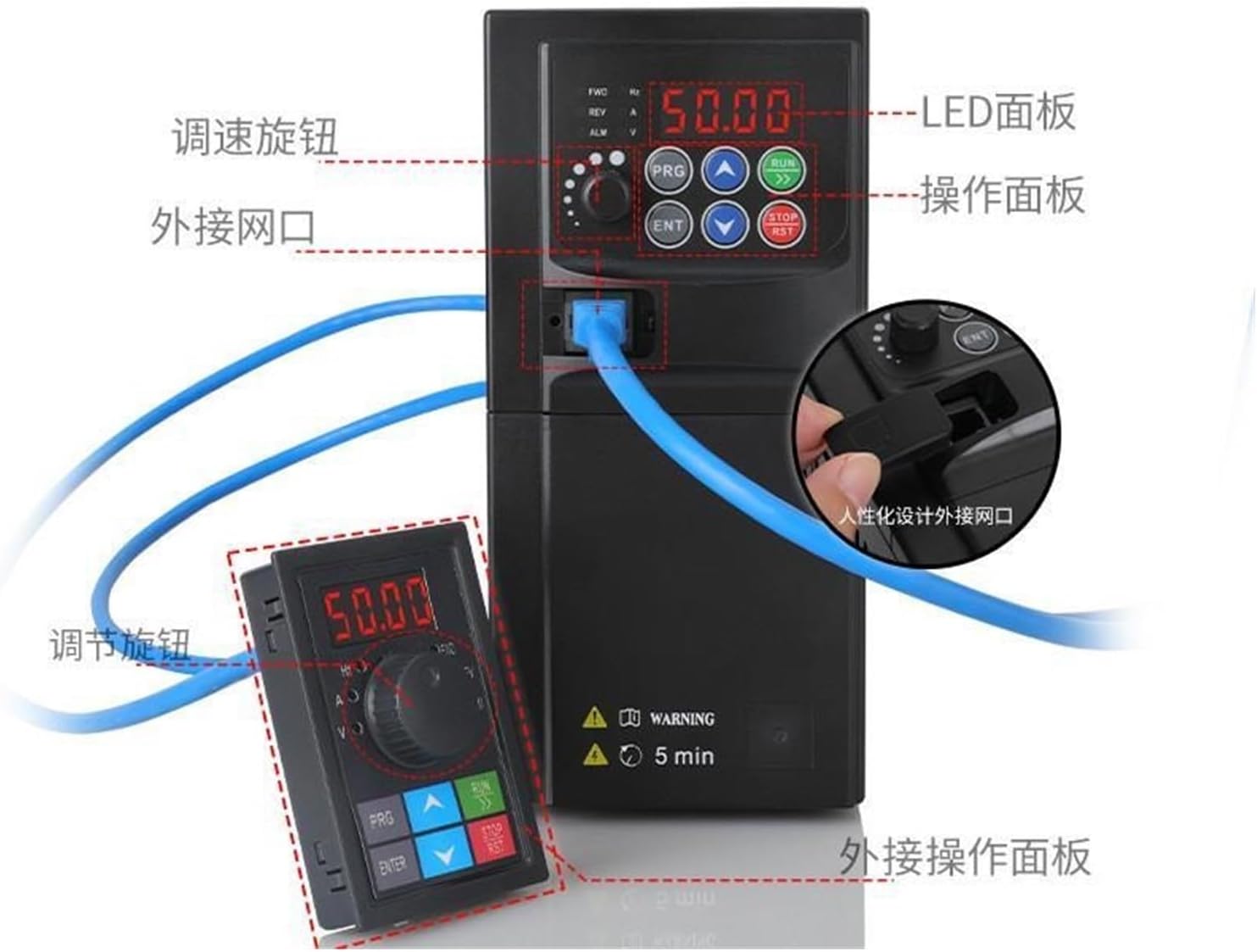 Ampia applicazione: questo inverter può essere utilizzato per apparecchiature di controllo della velocità come router CNC, macchine utensili CNC, fresatrici, trapani, divaricatori, miscelatori, estrusori, taglierine, avvolgitori, compressori, ventilatori, pompe, smerigliatrici, nastri trasportatori, elevatori, centrifuga, ecc Lega di alluminio e materiale PC: questo inverter è realizzato in lega di alluminio e materiale PC, la lega di alluminio ha una buona conduttività per garantire le prestazioni dell'inverter e il materiale PC è ignifugo per garantire la sicurezza dell'inverter Display digitale intelligente: questo inverter adotta un design della tastiera umanizzato, con layout ragionevole e facilità d'uso; display digitale, intuitivo e chiaro. Il design staccabile è comodo per il controllo remoto Dissipatore di calore extra large: questo inverter ha un grande dissipatore di calore con una piccola ventola, che è circa 3 volte più grande del dissipatore di calore di prodotti simili, e la piccola ventola garantisce un basso rumore e allo stesso tempo favorisce una buona dissipazione del calore Funzionamento multivelocità e oscillazione: questo inverter ha 16 segmenti di controllo della velocità multisegmento programmabile e più modalità operative tra cui scegliere. Il funzionamento della frequenza del pendolo ha frequenza preimpostata, frequenza centrale regolabile, memoria di stato e ripristino dopo un'interruzione di corrente