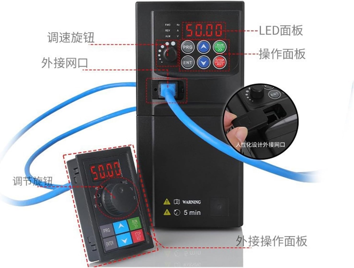 Ampia applicazione: questo inverter può essere utilizzato per apparecchiature di controllo della velocità come router CNC, macchine utensili CNC, fresatrici, trapani, divaricatori, miscelatori, estrusori, taglierine, avvolgitori, compressori, ventilatori, pompe, smerigliatrici, nastri trasportatori, elevatori, centrifuga, ecc Lega di alluminio e materiale PC: questo inverter è realizzato in lega di alluminio e materiale PC, la lega di alluminio ha una buona conduttività per garantire le prestazioni dell'inverter e il materiale PC è ignifugo per garantire la sicurezza dell'inverter Display digitale intelligente: questo inverter adotta un design della tastiera umanizzato, con layout ragionevole e facilità d'uso; display digitale, intuitivo e chiaro. Il design staccabile è comodo per il controllo remoto Dissipatore di calore extra large: questo inverter ha un grande dissipatore di calore con una piccola ventola, che è circa 3 volte più grande del dissipatore di calore di prodotti simili, e la piccola ventola garantisce un basso rumore e allo stesso tempo favorisce una buona dissipazione del calore Funzionamento multivelocità e oscillazione: questo inverter ha 16 segmenti di controllo della velocità multisegmento programmabile e più modalità operative tra cui scegliere. Il funzionamento della frequenza del pendolo ha frequenza preimpostata, frequenza centrale regolabile, memoria di stato e ripristino dopo un'interruzione di corrente