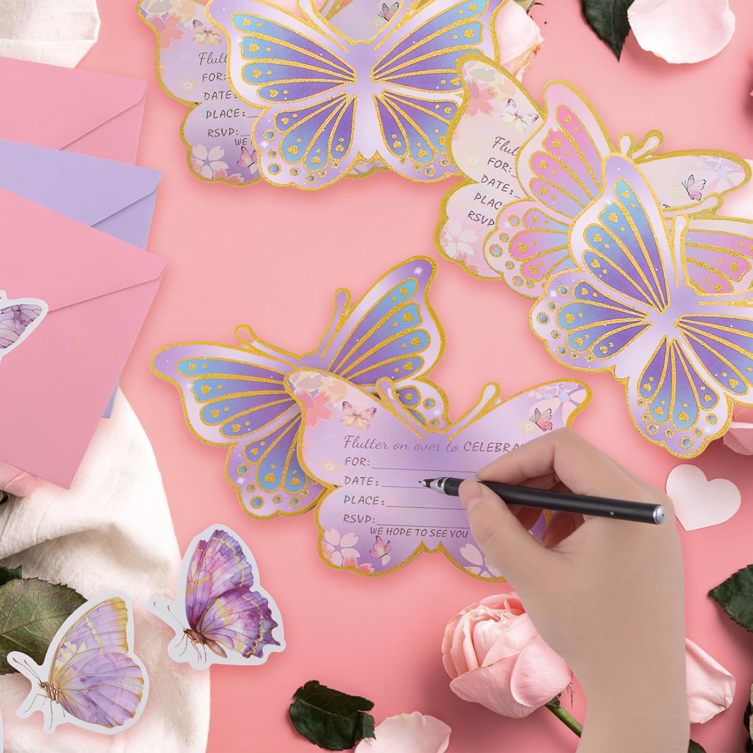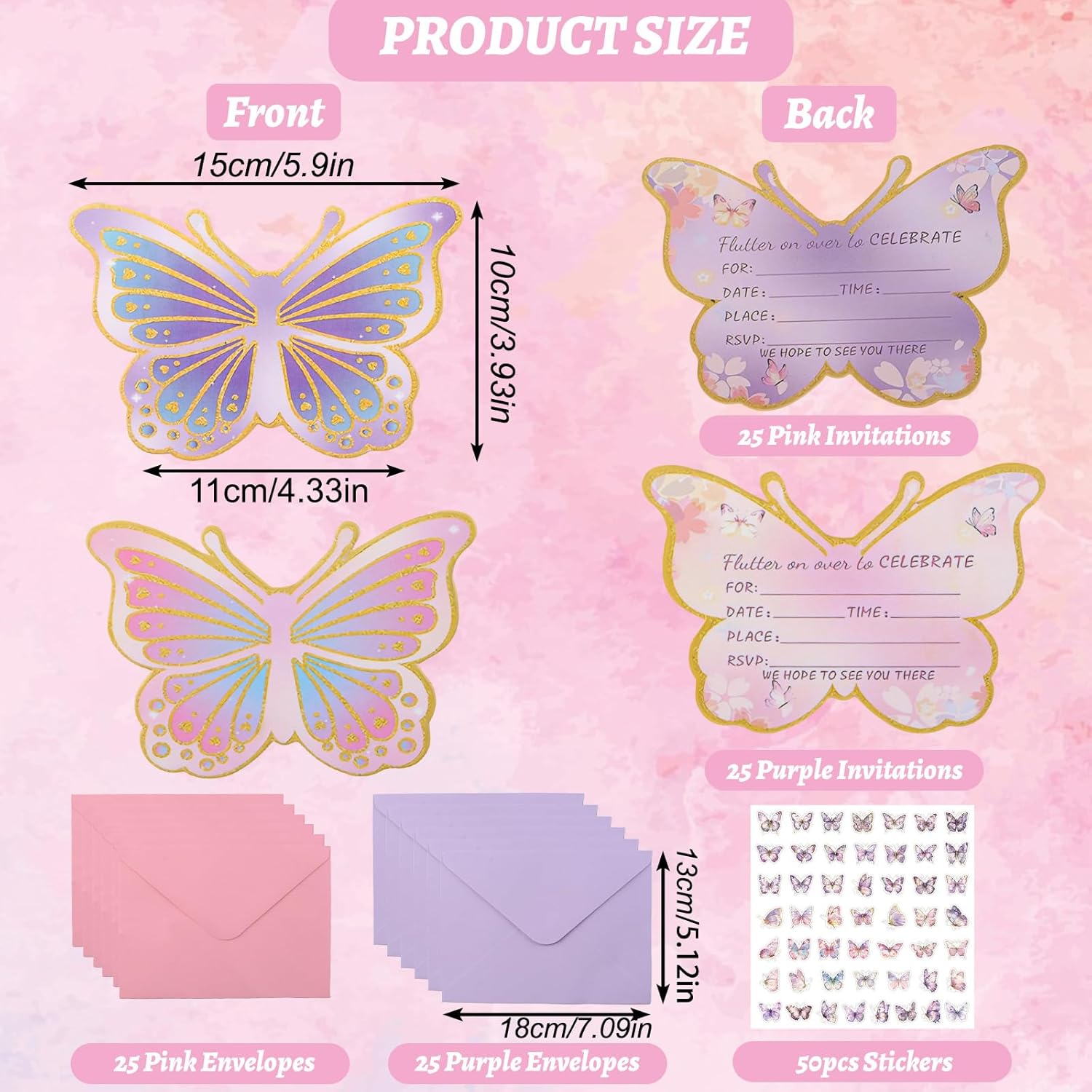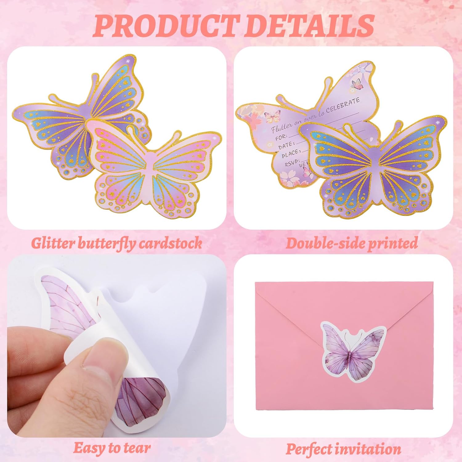 Contenuto della confezione: riceverai 50 set di inviti per feste a farfalla, tra cui 25 buste rosa e biglietti di invito a farfalla, 25 buste viola e biglietti di invito a farfalla, nonché 50 adesivi a farfalla. La quantità è sufficiente per l'uso e la condivisione. Elementi farfalla: lo stile generale è farfalla. Sia i biglietti d'invito a farfalla che gli adesivi a farfalla sono stampati con squisiti motivi a farfalla. I nostri prodotti sono disponibili in due colori, rosa e viola, che possono migliorare il senso di eleganza. Materiale di alta qualità: i nostri biglietti d'invito per feste a farfalla sono stampati con dettagli chiari e colori vivaci. Sono stampati su carte spesse e resistenti realizzate in carta rigida ed ecologica, che non hanno alcun impatto sulla salute e sulla sicurezza delle persone. Facile da usare: il nostro prodotto richiede solo di scrivere le informazioni nella posizione corrispondente sul biglietto d'invito a farfalla, quindi metterlo in una busta e attaccare l'adesivo che ti piace. In questo modo viene completato un elegante biglietto d'invito. Ampia applicazione: i nostri prodotti sono abbondanti in quantità, splendidamente progettati e adatti a tutti i tipi di eventi. Possono essere utilizzati per ospitare feste per bambini, feste di compleanno, feste di festival e altre feste a tema, lasciando ai tuoi ospiti ricordi indimenticabili.