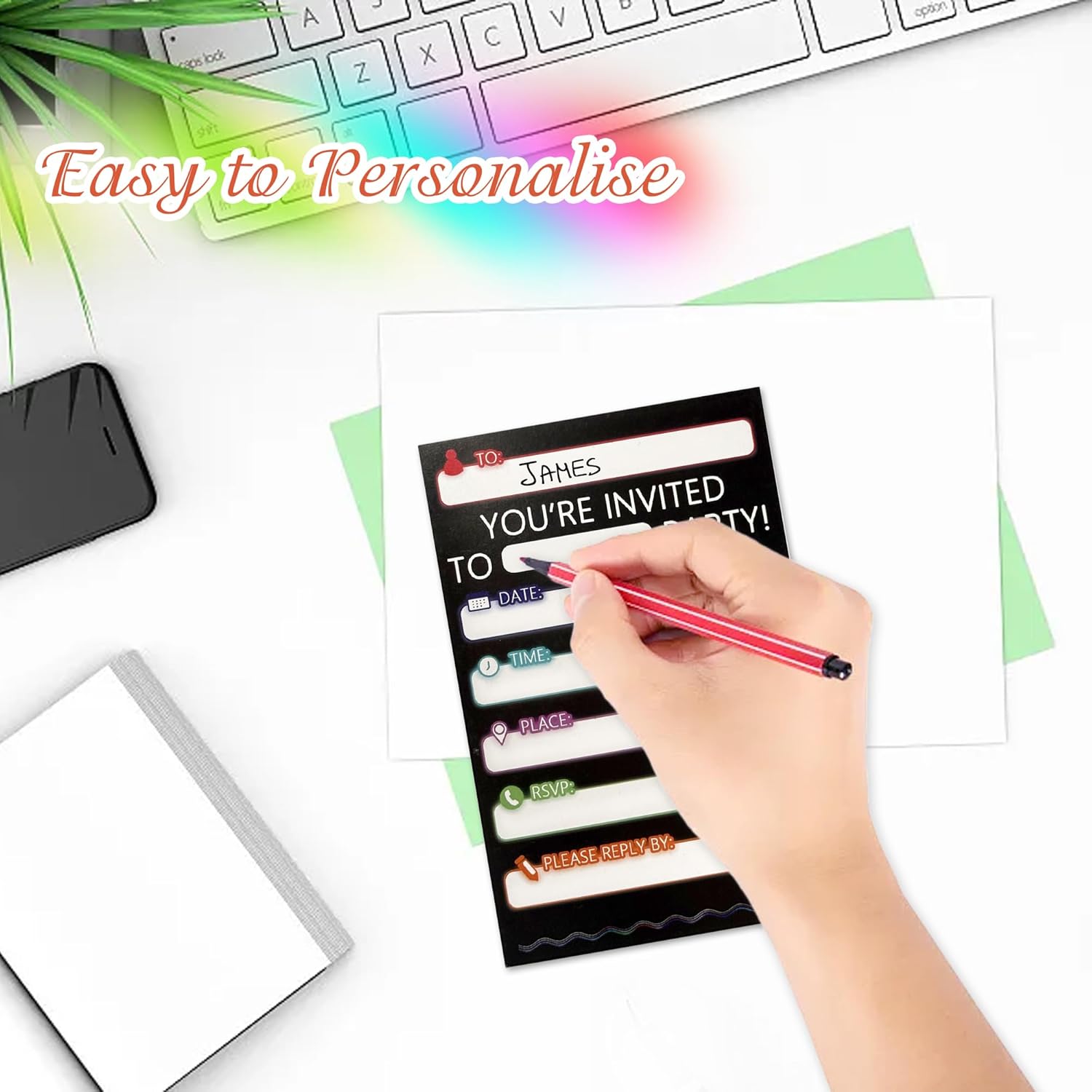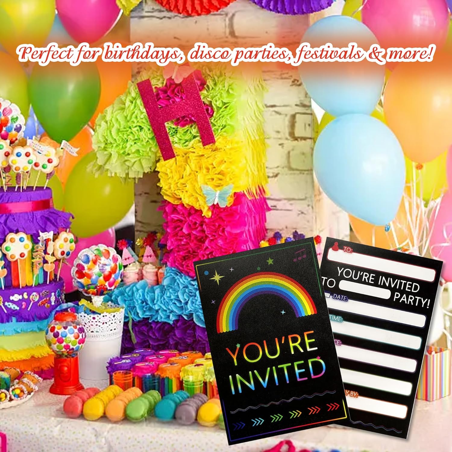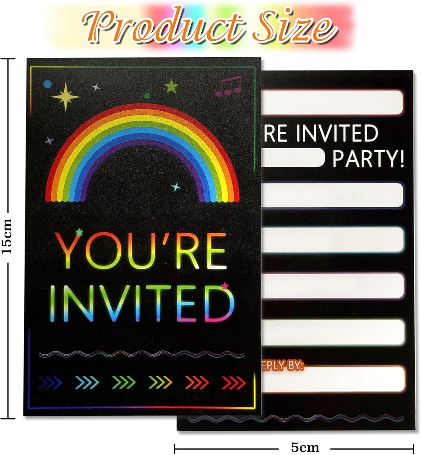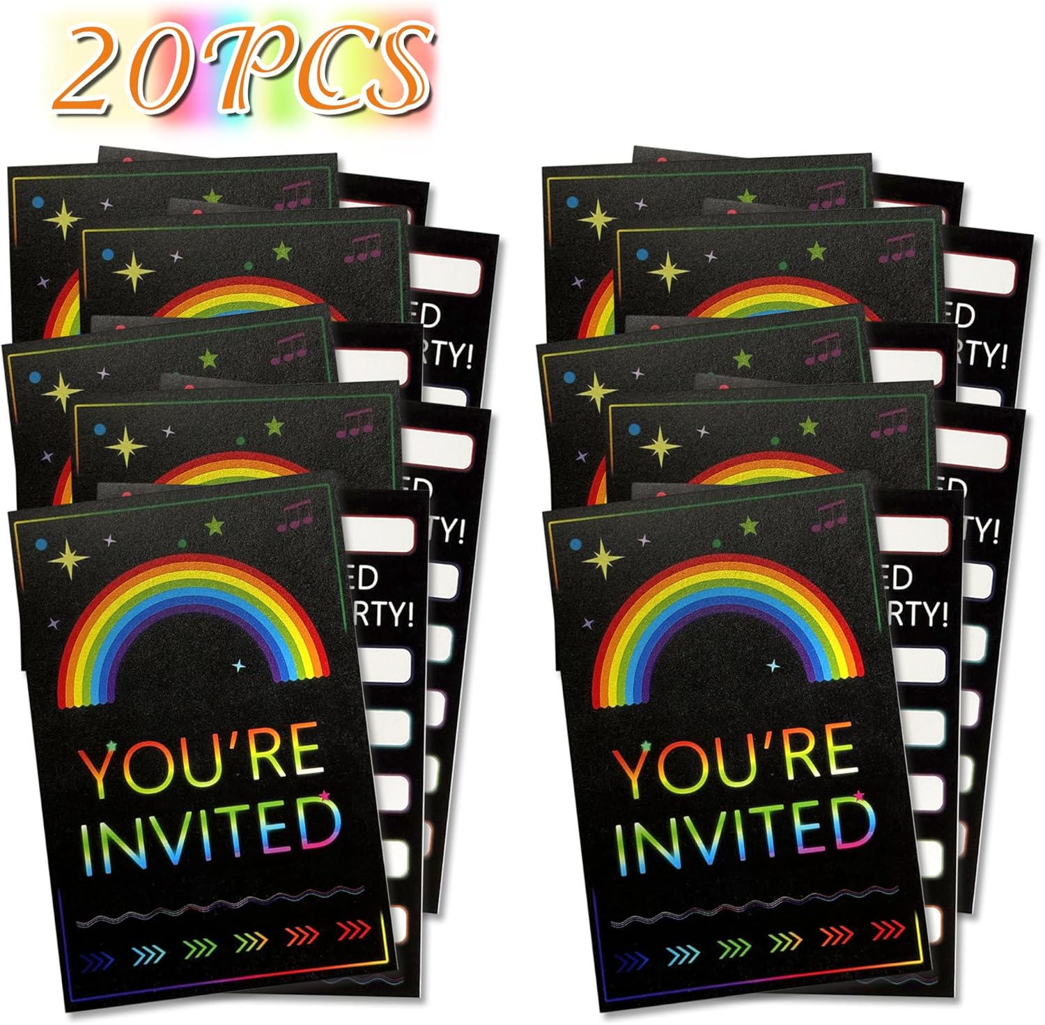Set completo di inviti arcobaleno fluo: questa confezione include 20 inviti arcobaleno neon di alta qualità (10 x 15 cm), progettati con colori vivaci e caratteri audaci. Perfetto per compleanni dei bambini, feste in discoteca, festival ed eventi a tema, buste non incluse. Design sorprendente neon e arcobaleno: caratterizzato da una moderna stampa fronte/retro, ogni biglietto presenta un vivace motivo arcobaleno con accenti al neon. La finitura opaca garantisce una facile scrittura, mentre il design accattivante fa risaltare i tuoi inviti. Dimensioni ideali per una maggiore versatilità: le dimensioni compatte ma spaziose da 10 x 15 cm si adattano alle buste standard (vendute separatamente) e offrono ampio spazio per i dettagli delle feste. Facile da distribuire o spedire, rendendo la pianificazione senza sforzo. Cartoncino di alta qualità da 300 g/m²: realizzati in carta patinata spessa e resistente da 300 g/m², questi biglietti resistono alla piegatura e alle sbavature. Ecologico e riciclabile, bilanciando qualità e sostenibilità Pronto per essere personalizzato e utilizzato: ogni invito ha un retro vuoto per scrivere a mano o dettagli personalizzati. Nessuna configurazione necessaria: basta compilare, inviare e lasciare che la festa abbia inizio! Ideale per genitori e organizzatori di eventi.