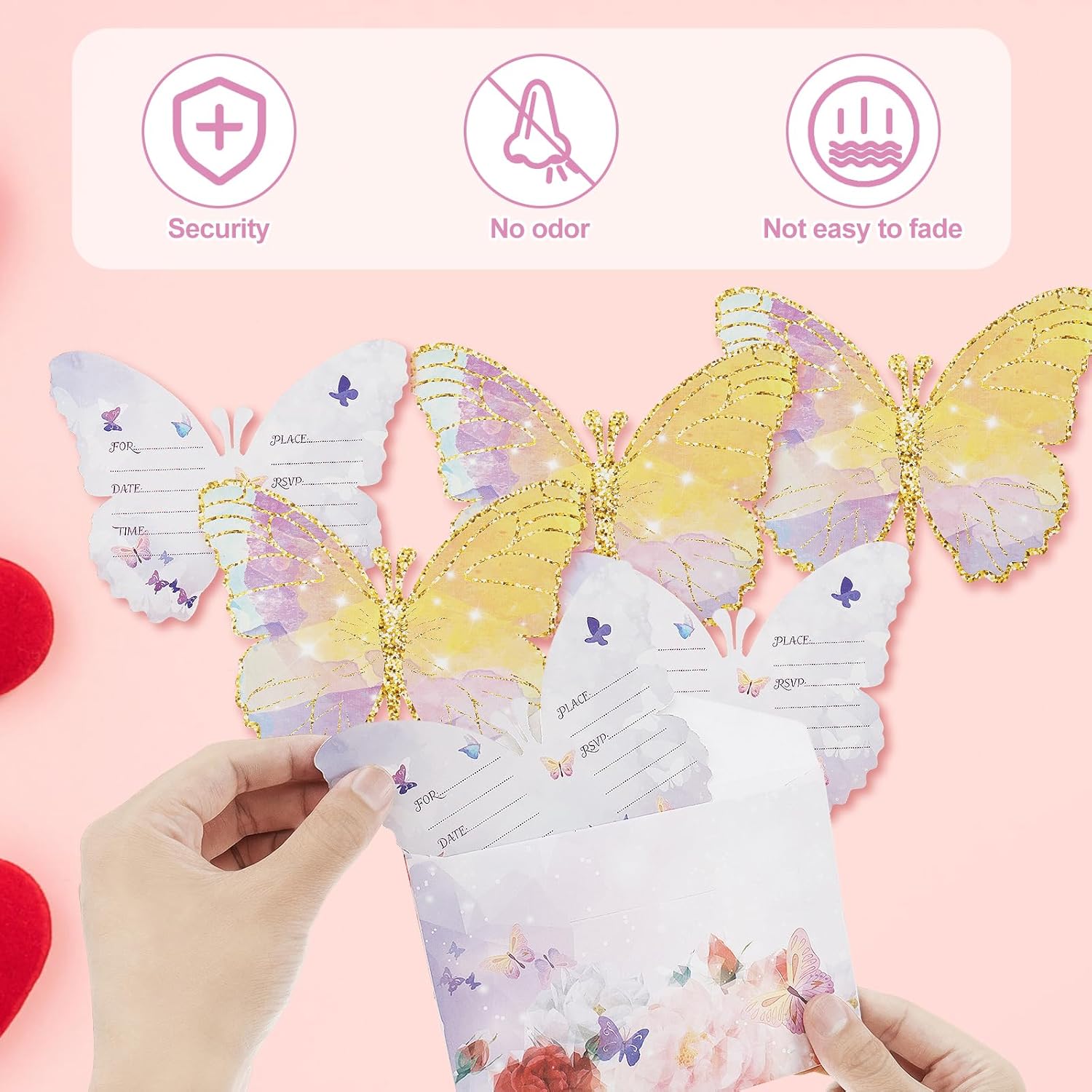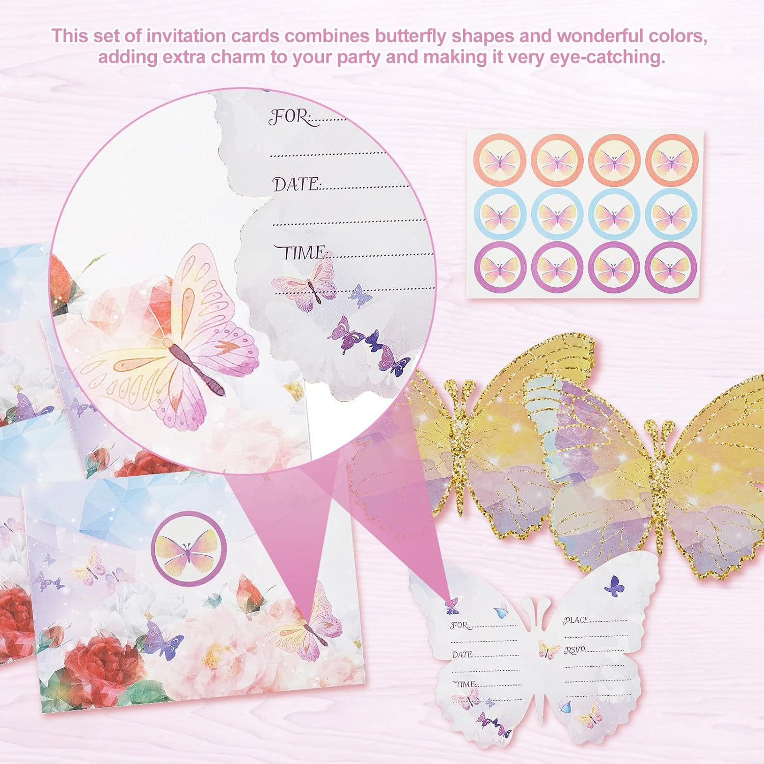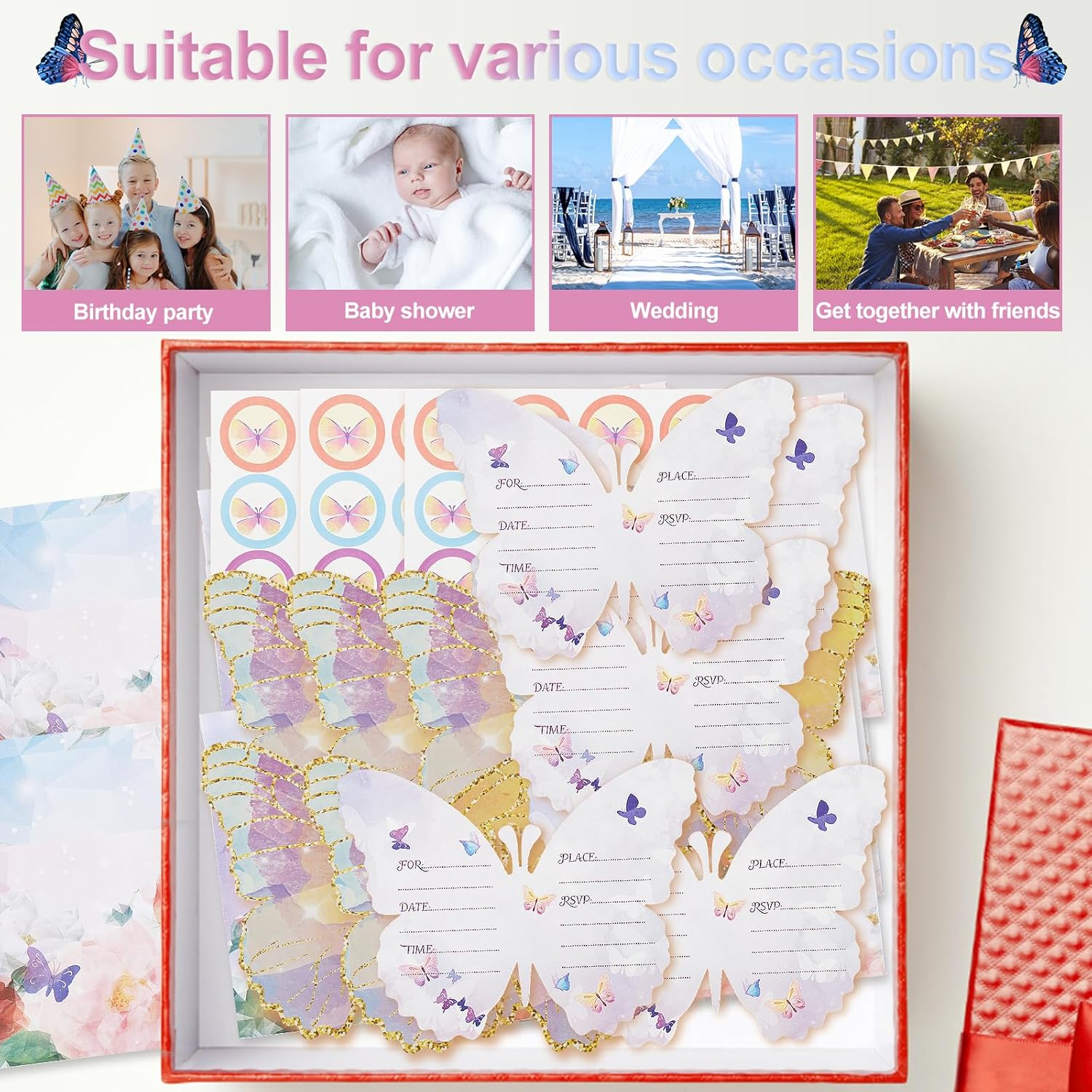 [Set contenuto] Questo set include 36 carte di invito, 36 buste e 36 adesivi sigillati, molta quantità per incontrarti invitare molte persone.Ogni carta è stampata con un bellissimo motivo a farfalla, che può lasciare una profonda impressione sui destinatari. [Carta sicura] Questi inviti per feste di compleanno sono realizzati in carta di carta sicura, inodore e non facili da sbiadire.Ogni scheda misura 13,6 x 10,5 cm / 5,35 x 4,1 pollici, fornendo molto spazio per esprimere messaggi e desideri chiave. [Ampia applicazione] Questo modello di invito può essere utilizzato per una varietà di occasioni, come feste di compleanno, baby shower, feste di fidanzamento, matrimoni, celebrazioni o incontri di amici.Può anche essere usato come regalo premuroso per colleghi, amici o persone care. [Facile da scrivere] Il livello interno della carta è vuoto, con abbastanza spazio per riempire l'indirizzo e la data della festa.La superficie della carta di invito è appositamente trattata per una facile scrittura. [Design squisito] Questo set di inviti combina forme farfalle e colori meravigliosi, che aggiunge fascino alla tua festa ed è molto accattivante.