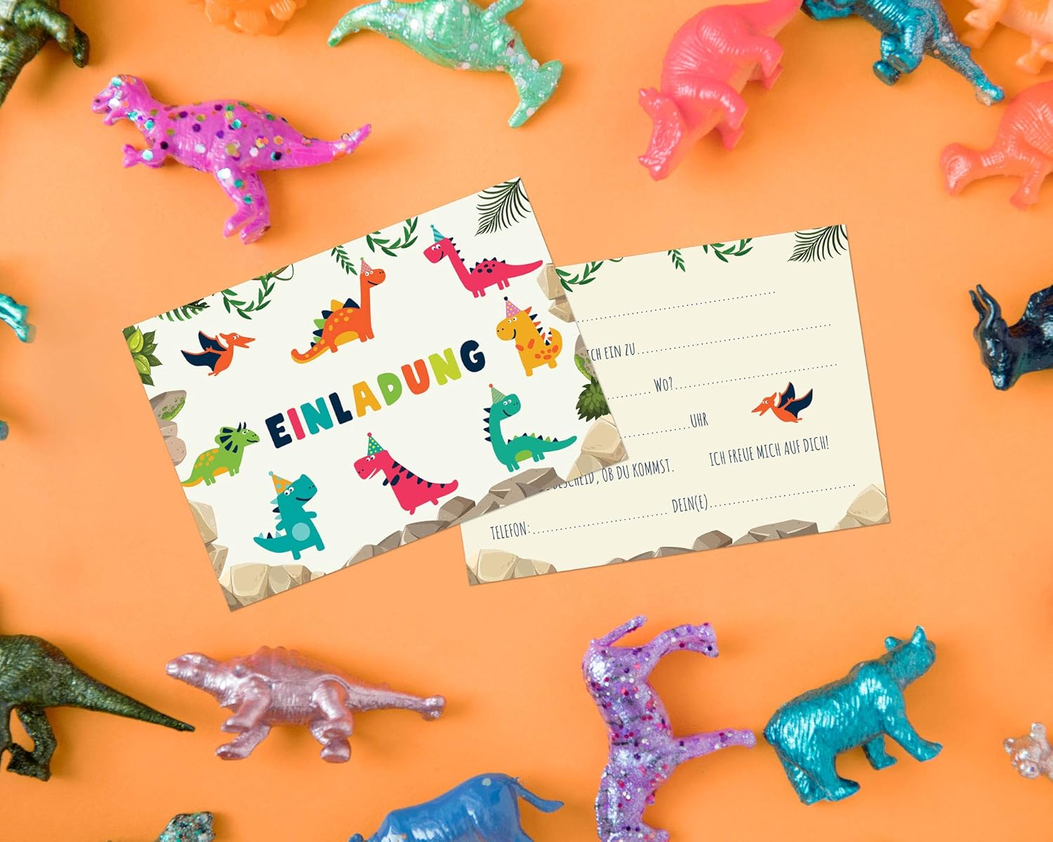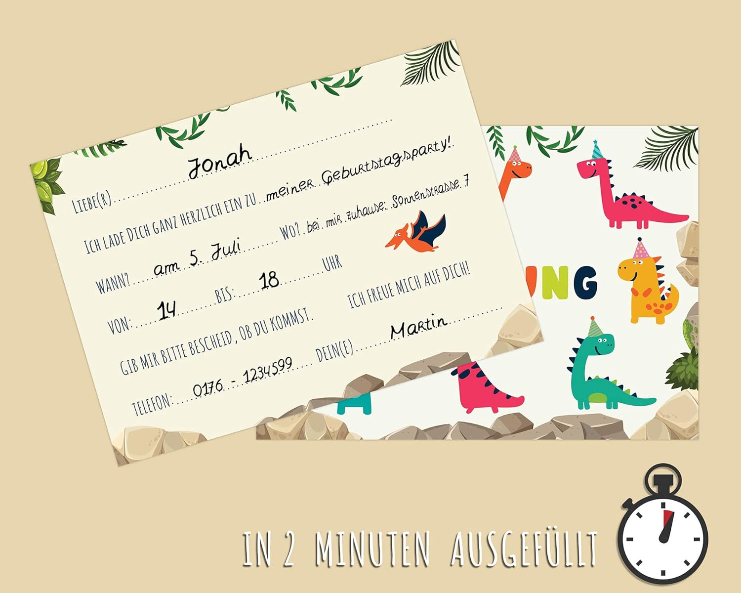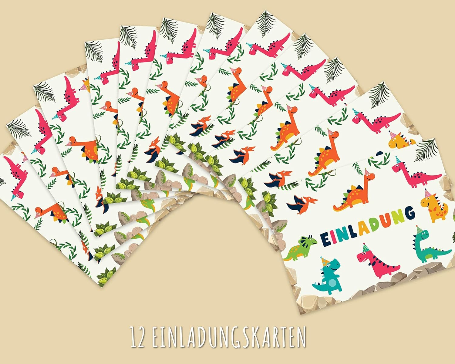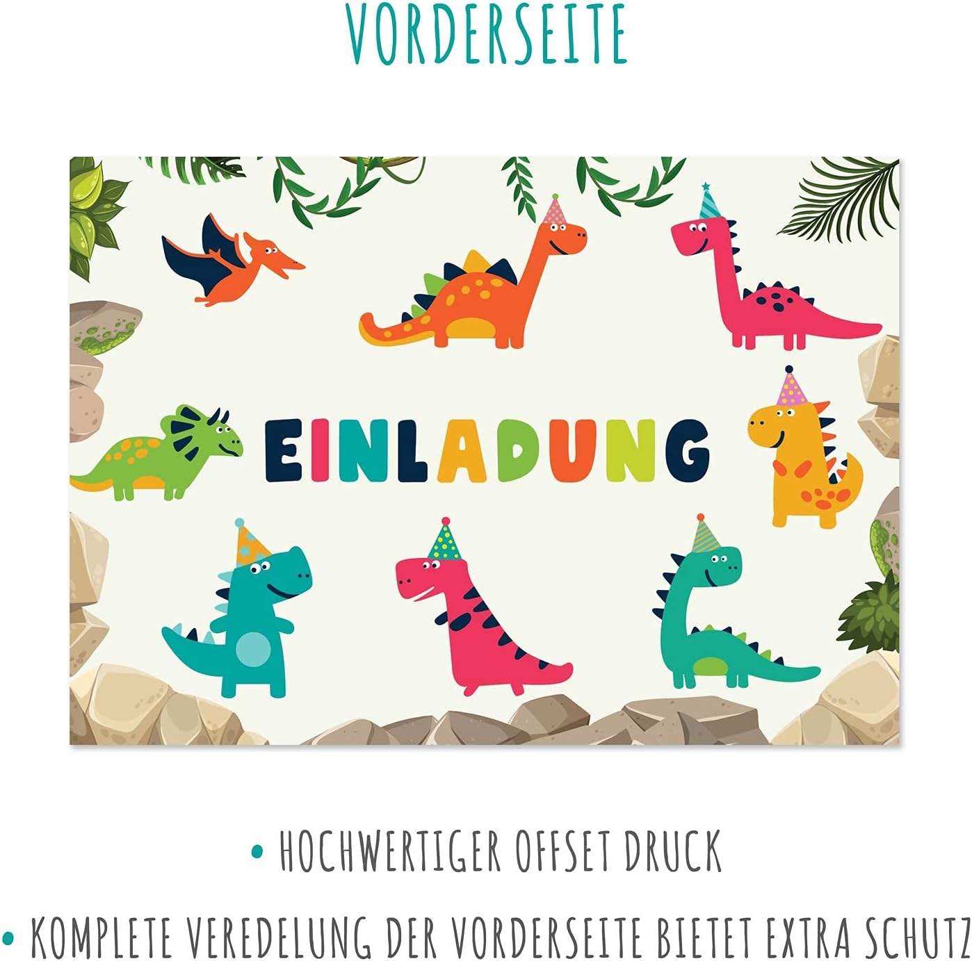 DINO PARTY ★ Ogni piccolo fan dei dinosauri desidera sicuramente una fantastica festa a tema dinosauri per il suo compleanno. Il divertente invito DINO Stone Time prepara grandi e piccini sicuramente un piccolo piacere! Risparmia tempo ★ Nessun fai da te complesso e progettazione di biglietti d'invito. Nessun errore di ortografia. Grazie al testo vuoto sul retro è necessario inserire solo i dati più importanti. Invito DIN ★ I nostri simpatici biglietti con dinosauri sono in formato DIN A6 (formato cartolina). Le carte vengono fornite senza buste. QUALITÀ EXTRA ★ I nostri adorabili biglietti con dinosauri sono stampati su cartoline spesse da 300 g/m² e sono quindi molto stabili, perfetti per le mani dei bambini.