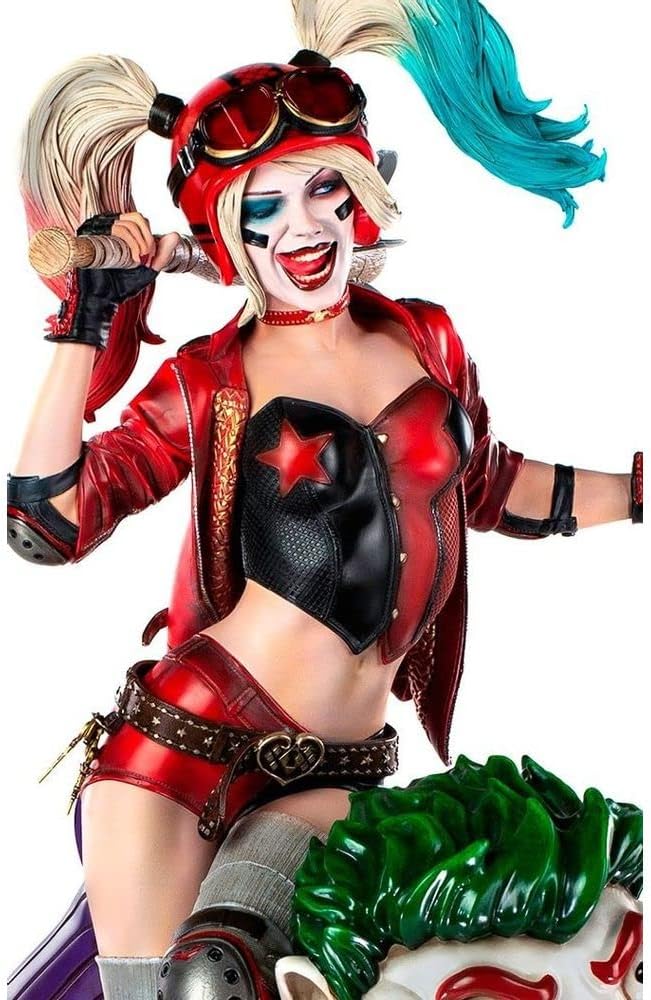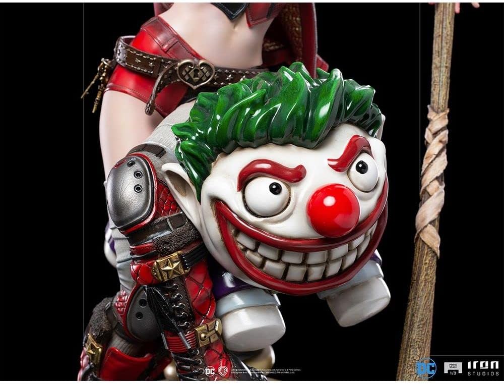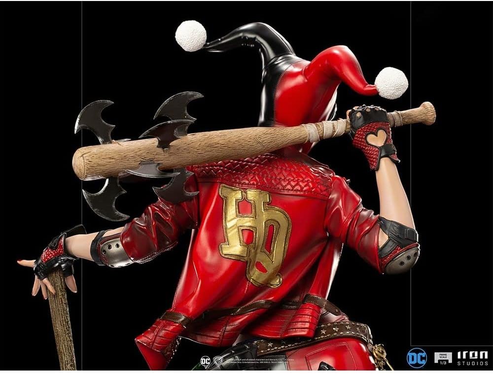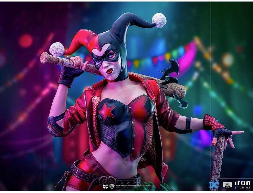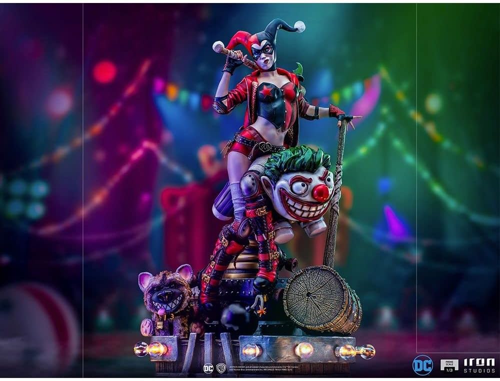 In un diorama pieno di elementi di un vecchio parco divertimenti, la bella complice del Principe Clown siede su un cavallo che salta a forma di Joker. Sulla sua mano sinistra poggia un grande martello e sulla spalla destra una mazza da baseball, la cui punta è tempestata di affilati Bat-Shuriken (souvenir del Cavaliere Oscuro), un pezzo di equipaggiamento da combattimento mortale. Oltre a una iena, il suo animale domestico Bruce, raffigurato come un animale di peluche, con una bomba sferica nera con una miccia accesa ai piedi, e in un'uniforme ispirata alla linea editoriale DC Rebirth dei fumetti, con pattini a rotelle e accessori protettivi, Iron Studios presenta la sua statua Harley Quinn Prime in scala 1:3 - DC Comics - Iron Studios, con il cattivo più carismatico e l'attuale eroina riluttante di Gotham City. Il pezzo ha trame realistiche che ritraggono accuratamente la morbida pelliccia di Bruce, le sfumature del dipinto in fibra di piume del cavallo del Joker, la sottile lucentezza della pelle del suo vestito e persino le linee ruvide del legno delle sue armi. La base a forma di cerchio ospita lampade dal carattere retrò che si illuminano singolarmente. La statua comprende tre teste intercambiabili, una più bella ed espressiva dell'altra. Harley Quinn è apparsa per la prima volta in Batman: The Animated Series ed è stata creata nel 1992 dal duo Paul Dini e Bruce Timm. La risposta positiva da parte della critica e del pubblico ha reso la sua presenza in questo film d'animazione e nei successivi capitoli di Batman una costante. Nel 1999, è stata introdotta nell'universo DC Comics. Originariamente psichiatra, si è unita al Joker come sua partner e successivamente come sua amante, diventando uno dei cattivi più iconici di Batman. Oggi è ritratta più come un'antieroina, che agisce più come una vigilante che come una criminale.