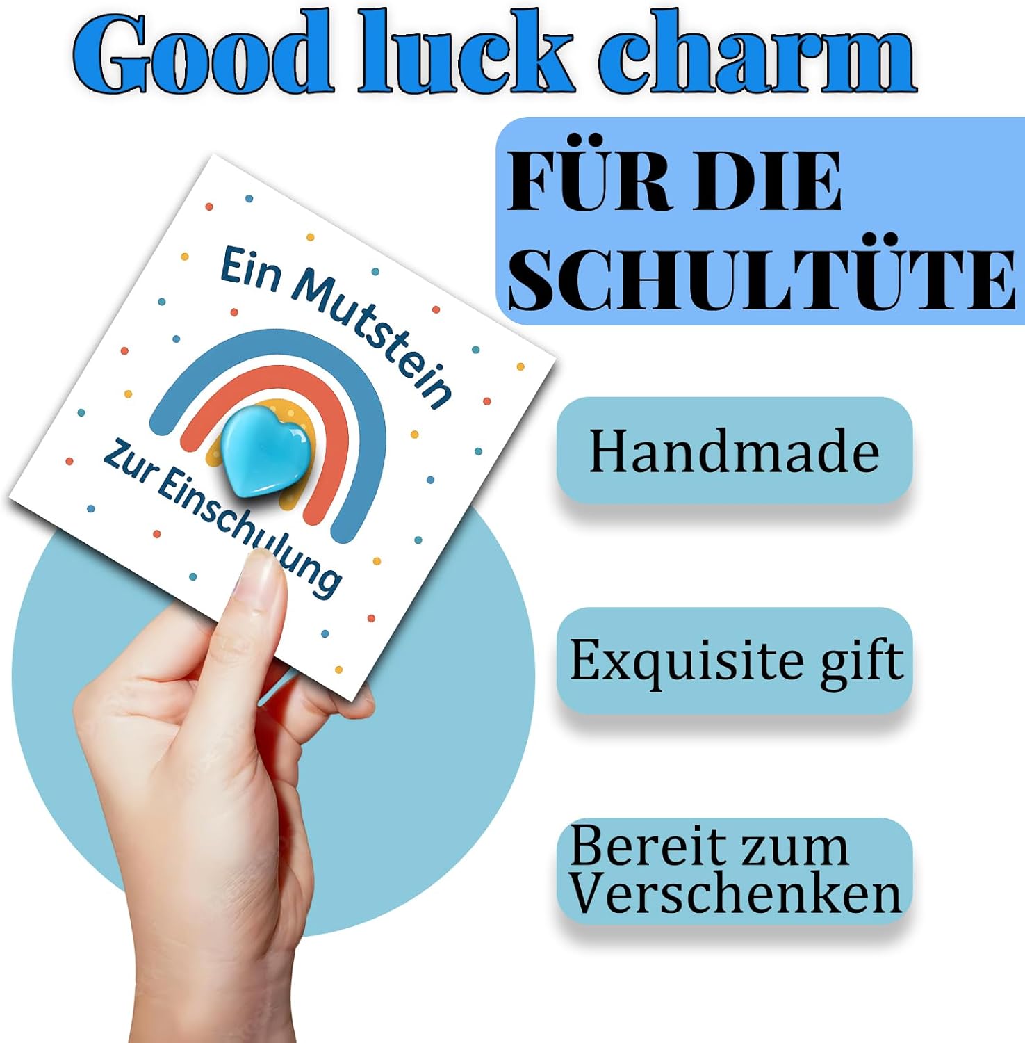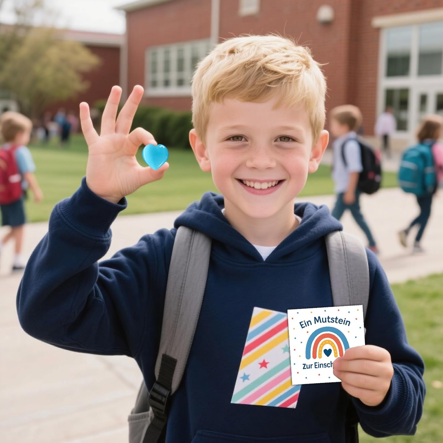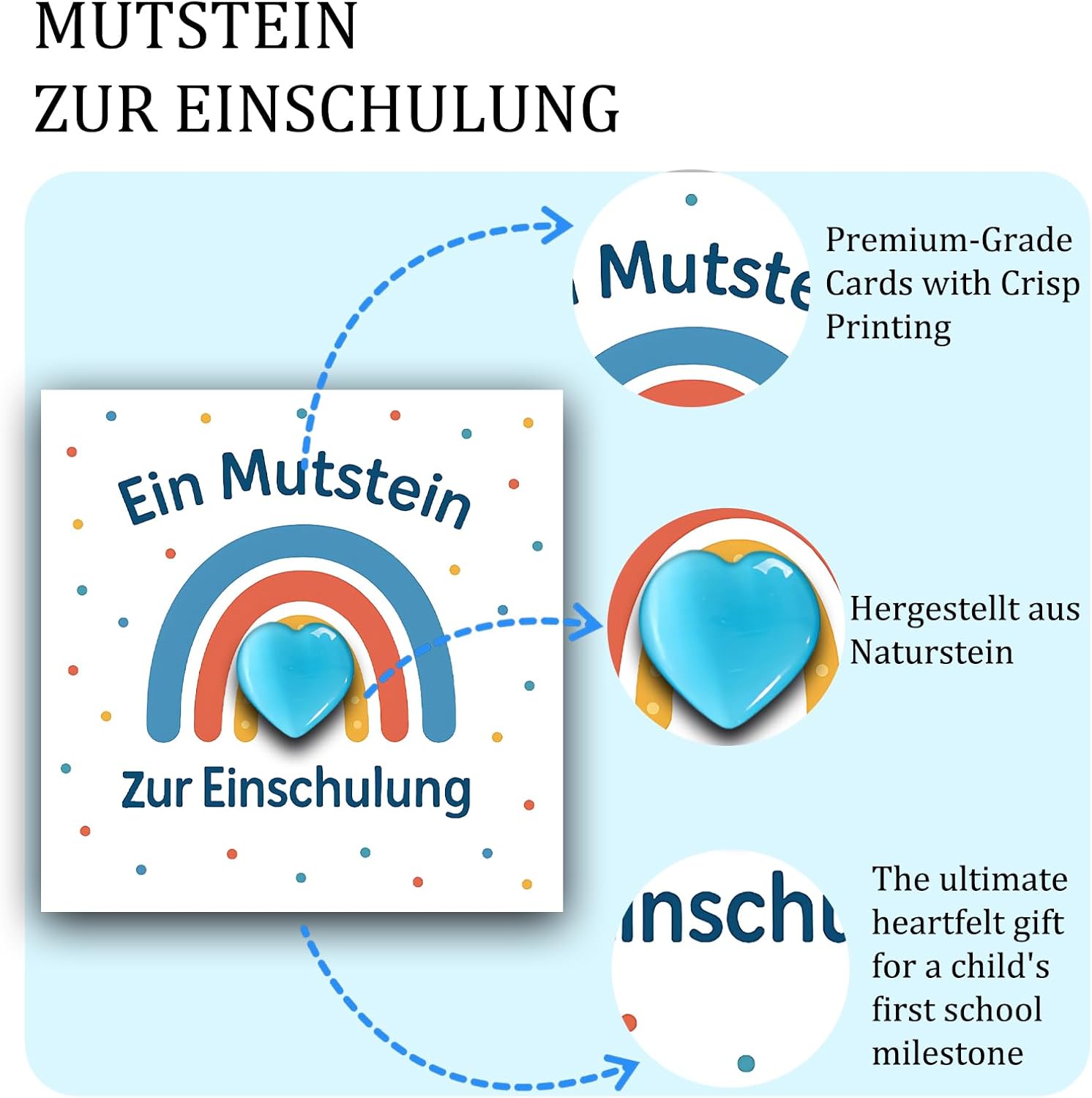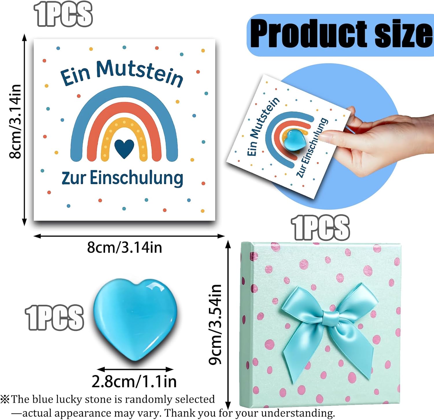 Una pietra portafortuna che dà coraggio: una speciale pietra blu del coraggio in una confezione regalo bianca di alta qualità con un biglietto elegante: il regalo ideale per l'ingresso a scuola per il tuo piccolo sparatutto ABC. Simbolo di coraggio e felicità all'inizio della scuola: questa pietra naturale del coraggio rappresenta felicità, successo ed energia positiva: il regalo perfetto per gli scolari 2025 per rafforzare e incoraggiare il tuo ragazzo all'inizio della scuola. Riempimento ideale per lo zaino dei ragazzi: la pietra del coraggio dal design accattivante con il suo messaggio positivo è il riempimento perfetto per lo zaino dei ragazzi. Una sorpresa significativa che incoraggia e augura benedizioni. Con un biglietto con motivo amorevole e la scritta di incoraggiamento: il biglietto incluso nel set con il simpatico motivo e la scritta "Muststein per iniziare la scuola: osa, ce la puoi fare!" dà al tuo bambino un prezioso incoraggiamento nel suo primo giorno di scuola. Dimensioni pratiche: ogni pietra ha una dimensione compresa tra 2 e 3 cm, il che la rende un compagno perfetto per i bambini a scuola. Si adatta perfettamente alle mani dei bambini e offre sicurezza in un ambiente sconosciuto.