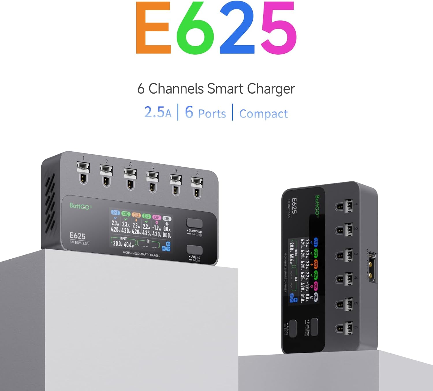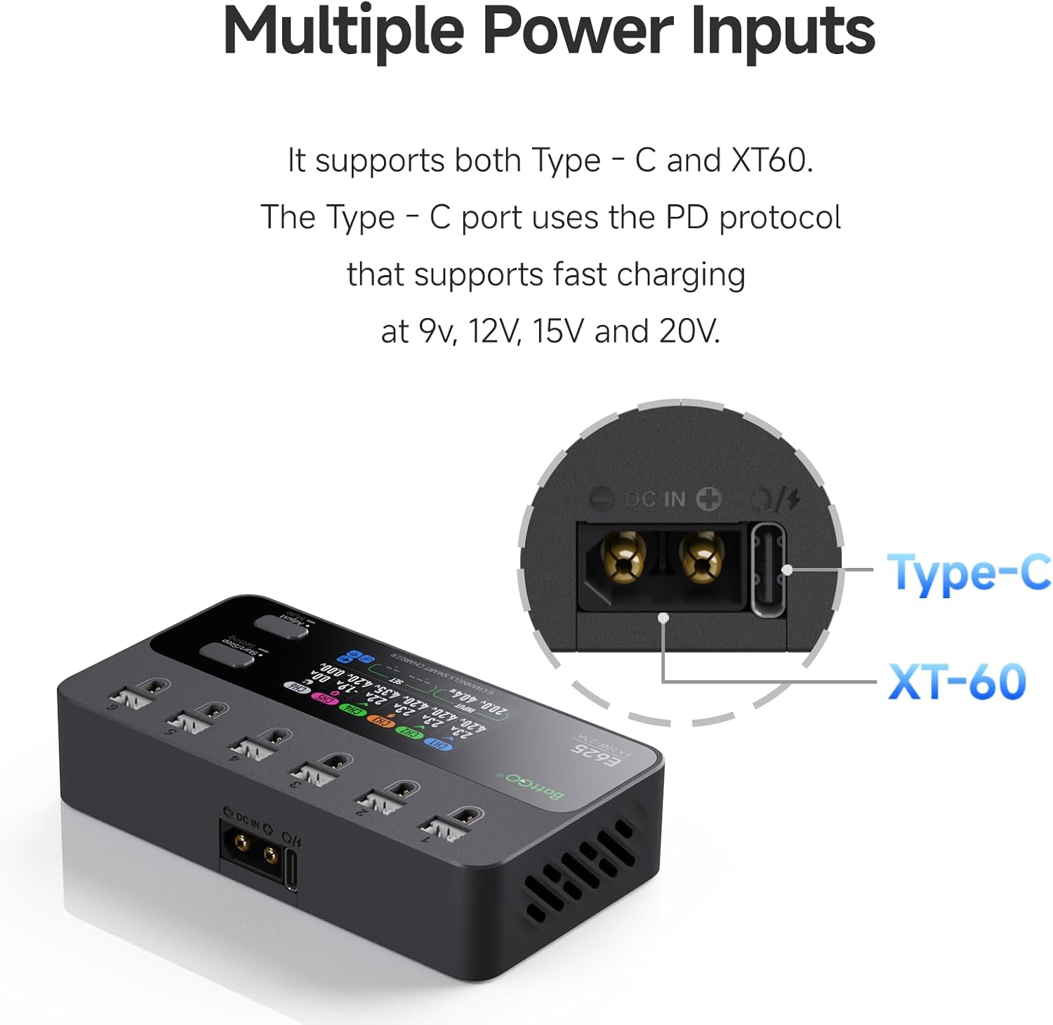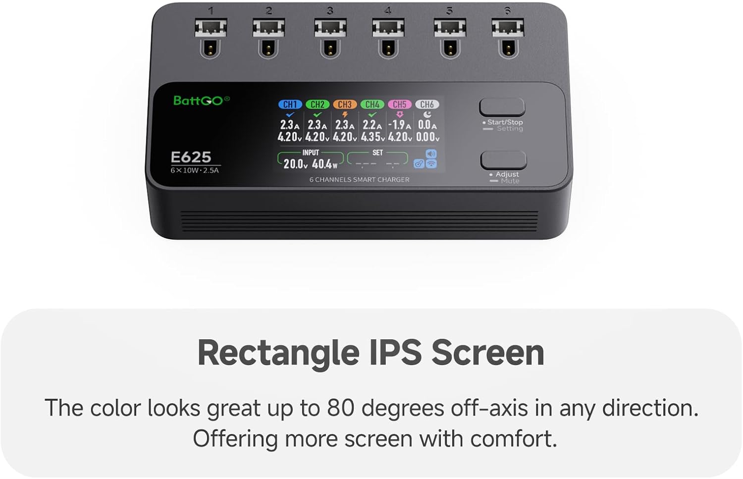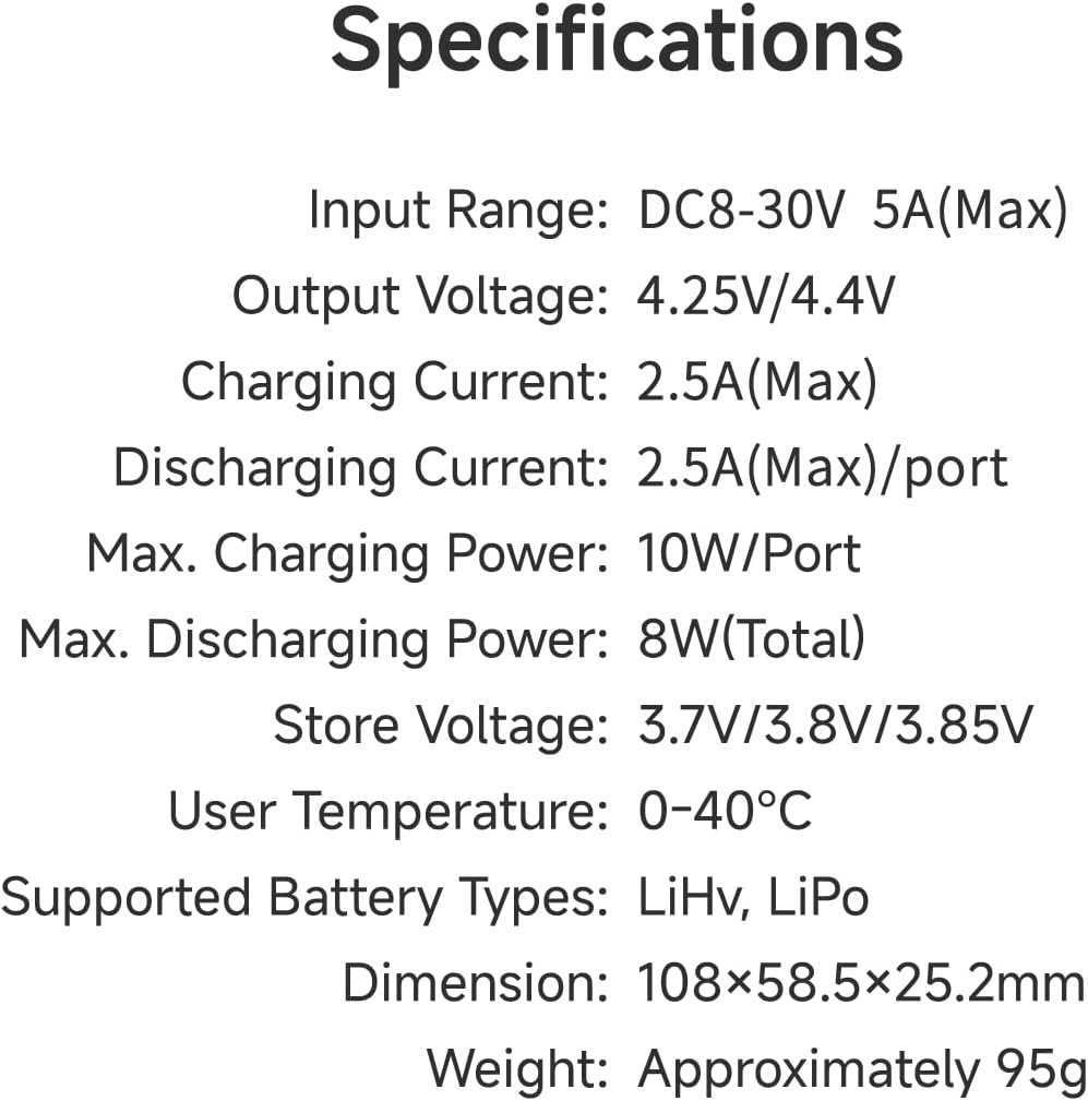 【6 porte indipendenti, ricarica veloce】 - Supporta la ricarica simultanea di 6 batterie con una corrente di carica massima di 2,5 A e una potenza di ricarica massima di 10 W. Ingresso multiplo, compatibile con PH2.0 e BT2.0: ingressi multipli (DC | PD), supporta sia di tipo C che XT60. Il connettore di tipo C utilizza il protocollo PD e consente una ricarica rapida a 9 V, 12 V, 15 V e 20 V. 【Carica e scarica superiori, potenza senza precedenti】 - Corrente di scarica fino a 2,5 A, potenza fino a 8 W. Funzione di ricarica e scarica per proteggere le batterie. Caricabatterie e scaricatore per batteria 1S (max. 2,5 A per connettore). 【Sicurezza e rispetto dell'ambiente con un piccolo involucro】 – Tecnologia di gestione della carica stabilizzata. Tutto in un design sottile e compatto. Schermo IPS rettangolare: il display da 1,9 pollici ha 320 x 170 pixel a colori a 16 bit e utilizza la tecnologia IPS. Ciò garantisce colori vivaci anche con angoli di visualizzazione fino a 80 gradi.
