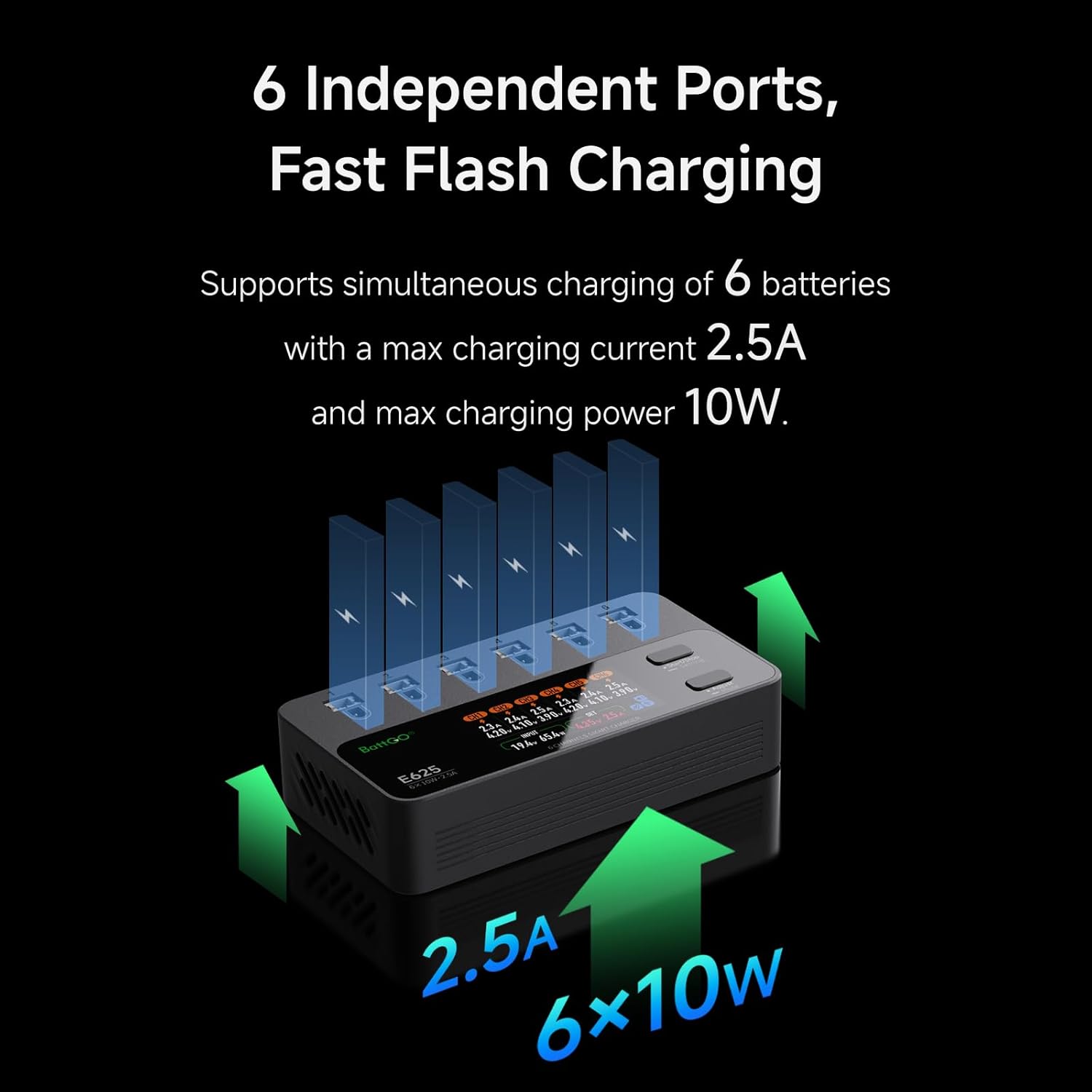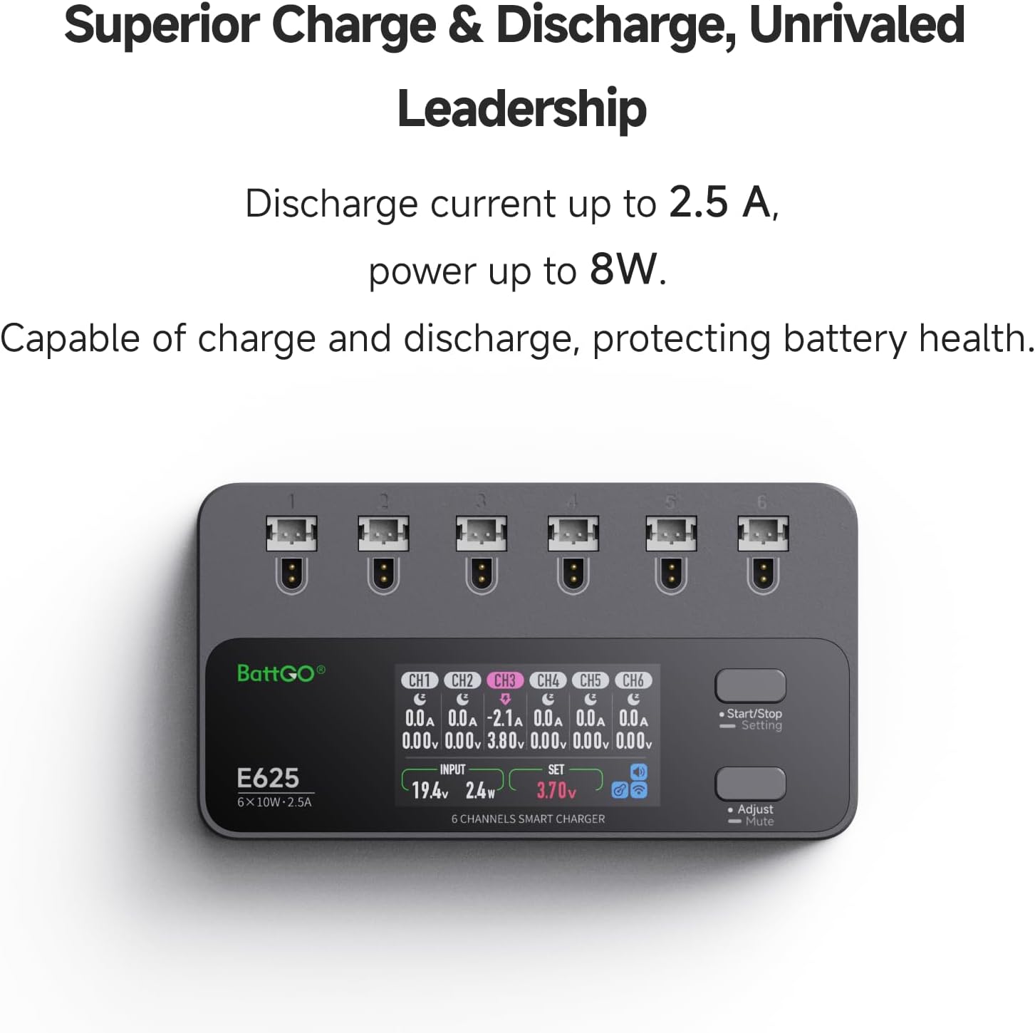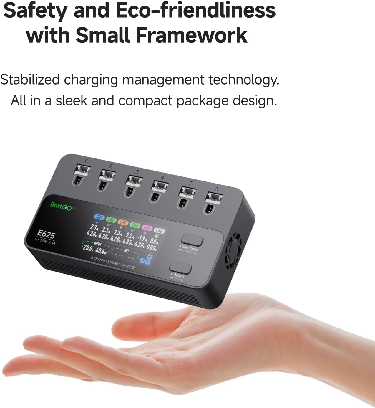 【6 porte indipendenti, ricarica veloce】 - Supporta la ricarica simultanea di 6 batterie con una corrente di carica massima di 2,5 A e una potenza di ricarica massima di 10 W. Ingresso multiplo, compatibile con PH2.0 e BT2.0: ingressi multipli (DC | PD), supporta sia di tipo C che XT60. Il connettore di tipo C utilizza il protocollo PD e consente una ricarica rapida a 9 V, 12 V, 15 V e 20 V. 【Carica e scarica superiori, potenza senza precedenti】 - Corrente di scarica fino a 2,5 A, potenza fino a 8 W. Funzione di ricarica e scarica per proteggere le batterie. Caricabatterie e scaricatore per batteria 1S (max. 2,5 A per connettore). 【Sicurezza e rispetto dell'ambiente con un piccolo involucro】 – Tecnologia di gestione della carica stabilizzata. Tutto in un design sottile e compatto. Schermo IPS rettangolare: il display da 1,9 pollici ha 320 x 170 pixel a colori a 16 bit e utilizza la tecnologia IPS. Ciò garantisce colori vivaci anche con angoli di visualizzazione fino a 80 gradi.