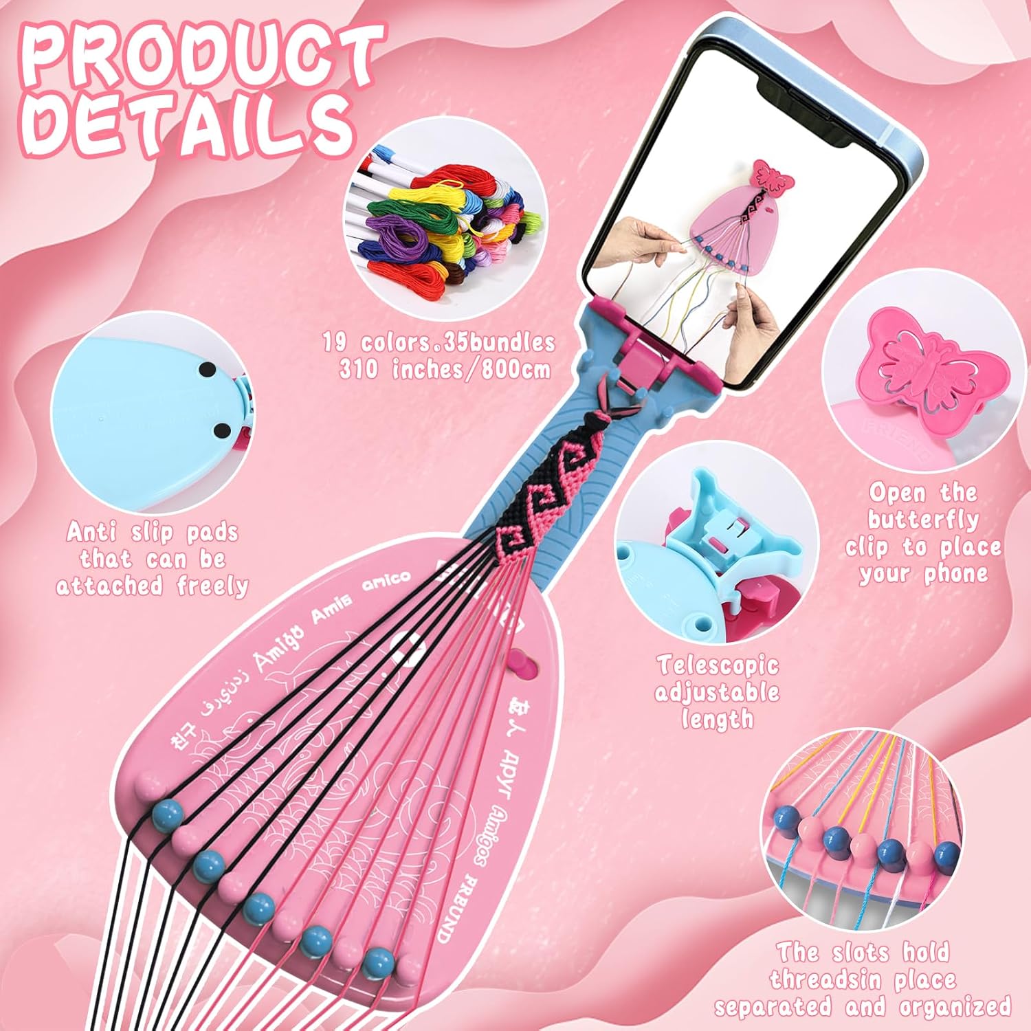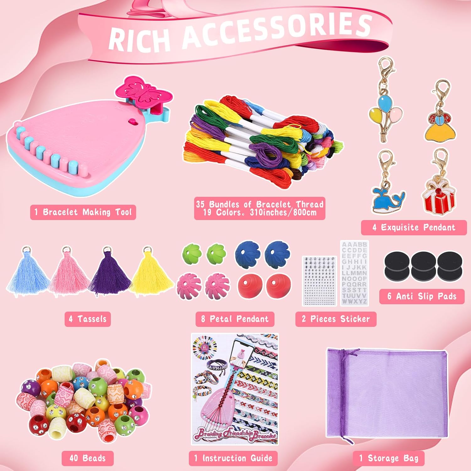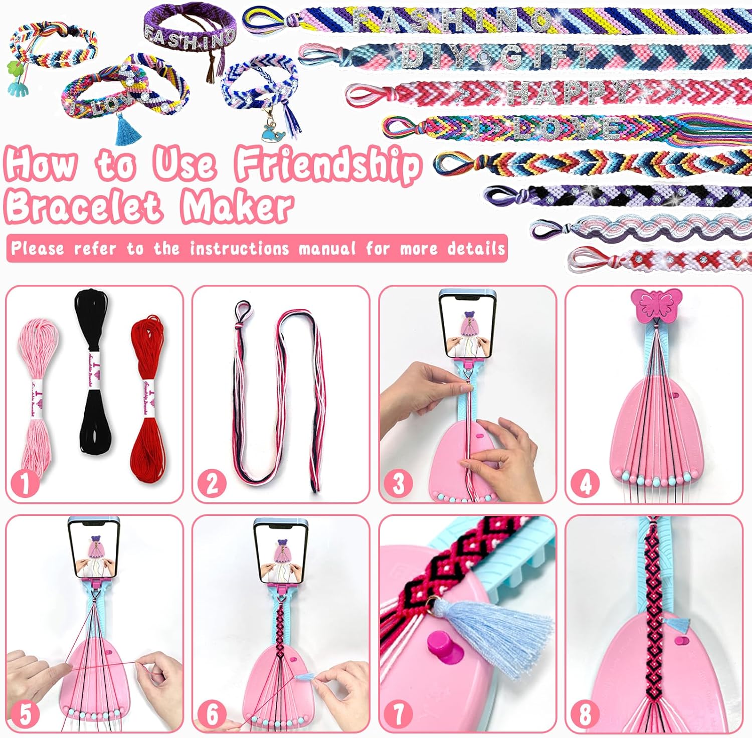 Kit per Braccialetti Dell'amicizia: Comprende 1 macchina per maglieria con supporto, 35 filati colorati, 4 ciondoli, 4 nappe, 2 adesivi, 8 tappi decorativi, 40 perline, 1 sacchetto, 1 confezione regalo, 6 tappetini antiscivolo e 1 libretto di istruzioni Adatto ai principianti: il kit di braccialetti dell'amicizia viene fornito con un supporto per il telefono cellulare, è possibile seguire i passaggi mentre si guarda il video tutorial, che rende facile per i principianti iniziare Idee per il fai da te: l'intrecciatore è dotato di 11 chiodi spaccati che fissano gli 11 fili intrecciati. Si possono realizzare non solo braccialetti, ma anche graziose cavigliere, gioielli per capelli e accessori per borse, ecc. Giocattolo Educativo: Questo set di braccialetti è molto facile da usare e permette ai bambini di esercitare la pazienza, la concentrazione e la creatività durante la lavorazione, nonché la coordinazione delle mani e la rappresentazione spaziale Regalo per Bambini: Adatto a tutte le età, il kit di braccialetti dell'amicizia utilizza il braccialetto come mezzo per diffondere l'amore. Regalo perfetto per le bambine di 7 8 9 10 11 12+ per i compleanni, la festa dei bambini e altre festività
