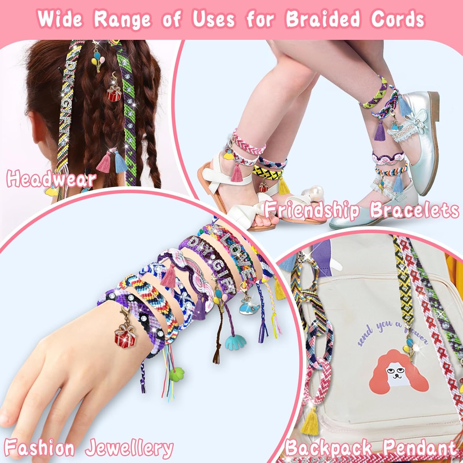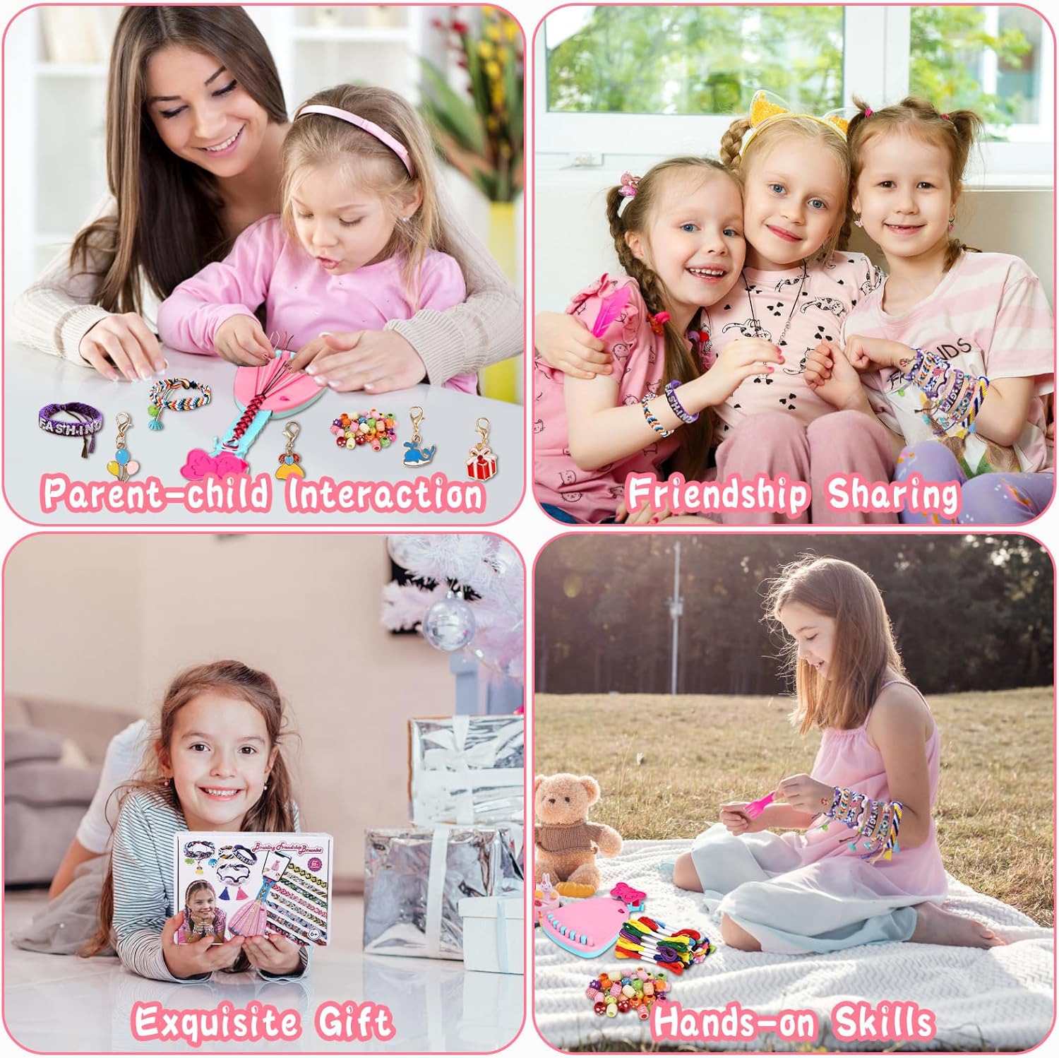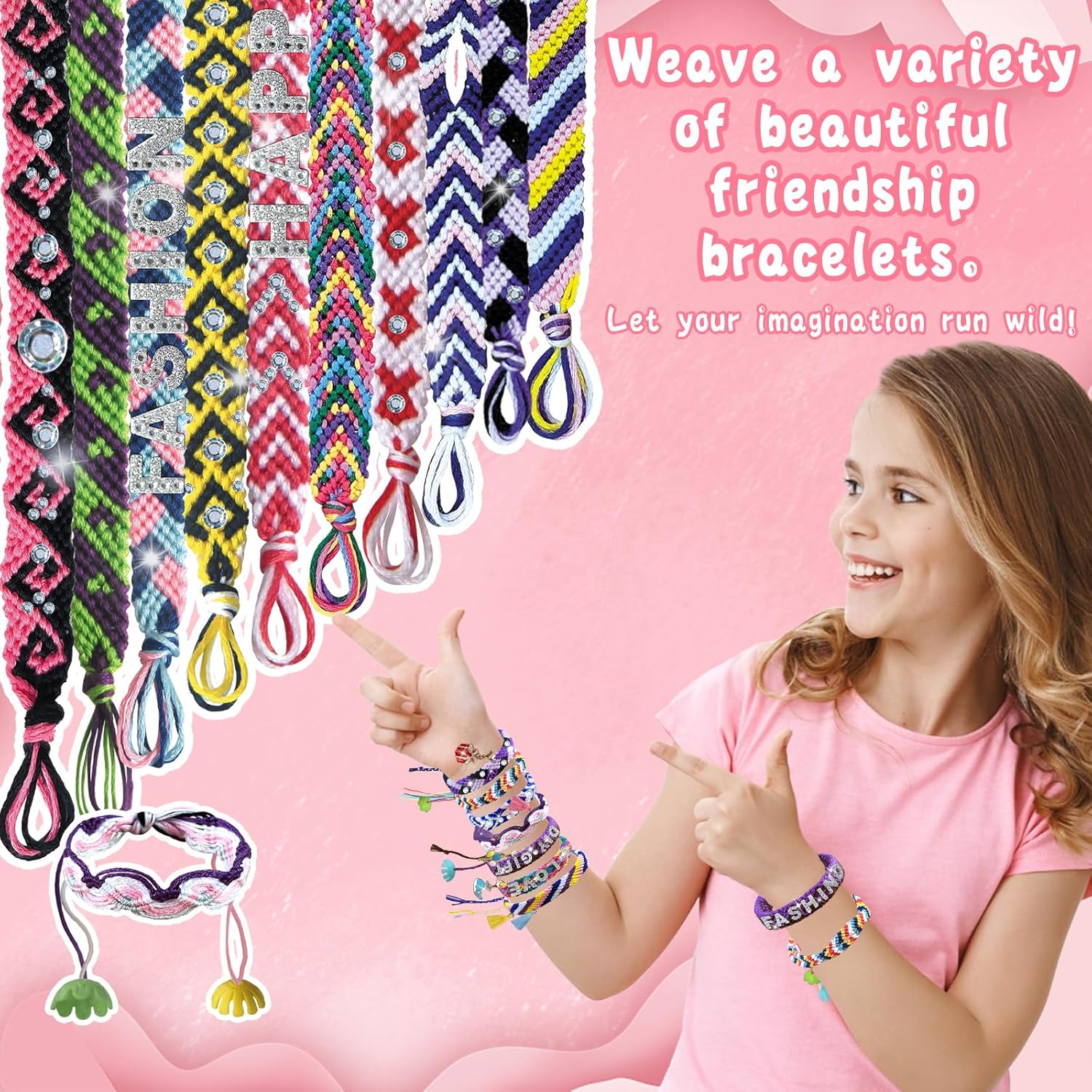 Kit per Braccialetti Dell'amicizia: Comprende 1 macchina per maglieria con supporto, 35 filati colorati, 4 ciondoli, 4 nappe, 2 adesivi, 8 tappi decorativi, 40 perline, 1 sacchetto, 1 confezione regalo, 6 tappetini antiscivolo e 1 libretto di istruzioni Adatto ai principianti: il kit di braccialetti dell'amicizia viene fornito con un supporto per il telefono cellulare, è possibile seguire i passaggi mentre si guarda il video tutorial, che rende facile per i principianti iniziare Idee per il fai da te: l'intrecciatore è dotato di 11 chiodi spaccati che fissano gli 11 fili intrecciati. Si possono realizzare non solo braccialetti, ma anche graziose cavigliere, gioielli per capelli e accessori per borse, ecc. Giocattolo Educativo: Questo set di braccialetti è molto facile da usare e permette ai bambini di esercitare la pazienza, la concentrazione e la creatività durante la lavorazione, nonché la coordinazione delle mani e la rappresentazione spaziale Regalo per Bambini: Adatto a tutte le età, il kit di braccialetti dell'amicizia utilizza il braccialetto come mezzo per diffondere l'amore. Regalo perfetto per le bambine di 7 8 9 10 11 12+ per i compleanni, la festa dei bambini e altre festività