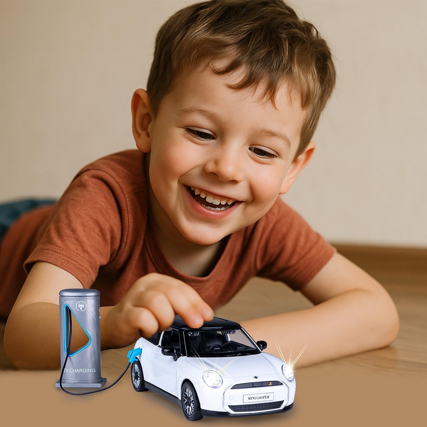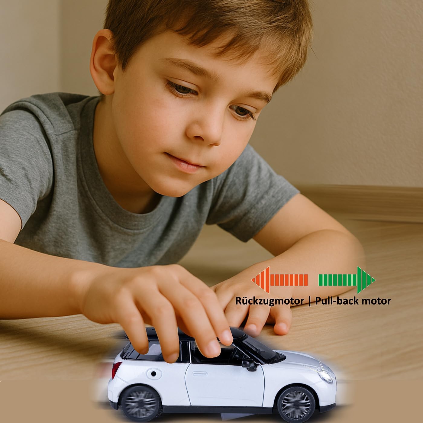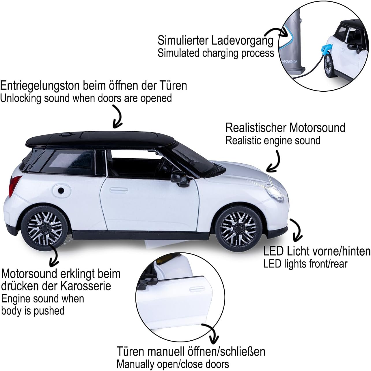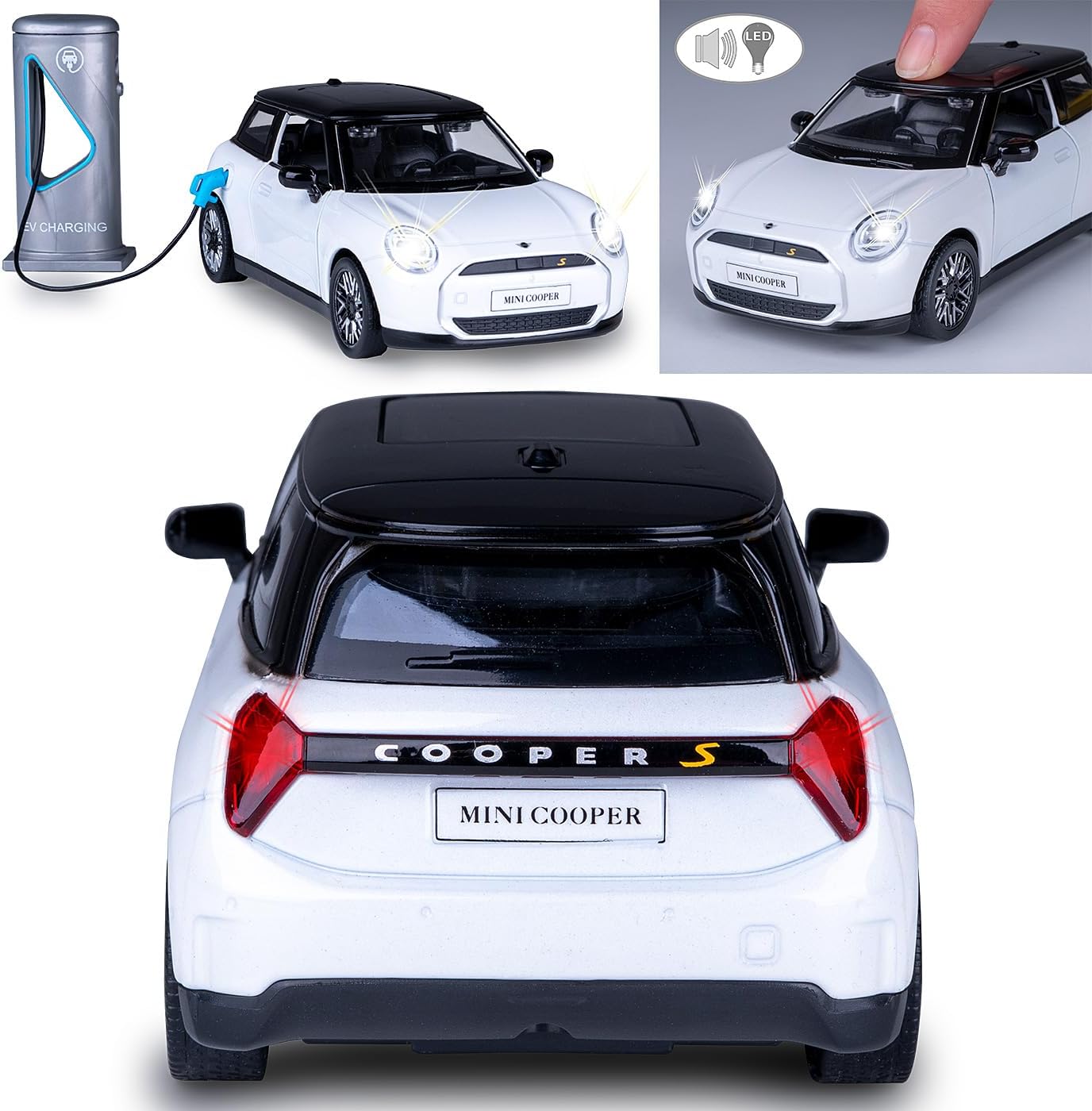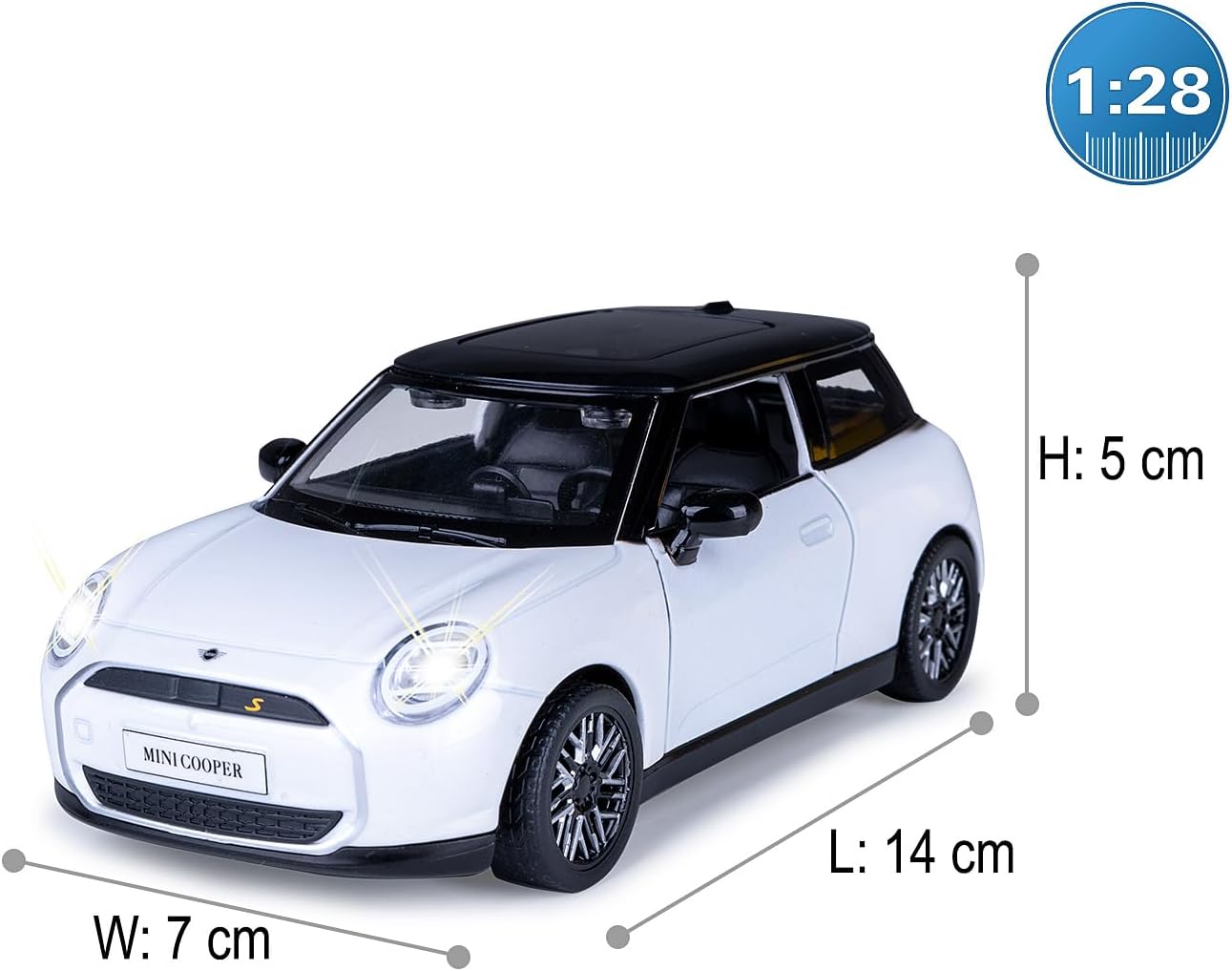JAMARA Porta questo veicolo giocattolo per auto a partire dai 3 anni in metallo di alta qualità DIECAST scala 1:28 nella vostra vetrina da collezione, con molti piccoli dettagli che entusiasmeranno ogni fan Questo modello di auto di alta qualità amorevolmente progettato convince con numerose funzioni autentiche. Un interno decorato con cura e numerosi dettagli del veicolo che rendono il Cooper vivace La cabina per i personaggi da gioco e la ricarica simulata con piccola colonna di ricarica (senza funzione solo valore di gioco), aumentano il divertimento. Con effetti sonori realistici come il suono del motore e il rumore dell'accelerazione Con luci a LED anteriori/posteriori, pneumatici in gomma profilati e il potente motore di ritrazione, porte e cofano possono essere aperti e chiusi manualmente, mentre premendo la carrozzeria il suono del motore suona e il suono di sblocco Questo affascinante pezzo da collezione è perfetto come idea regalo per i bambini in occasioni speciali come compleanni o Natale